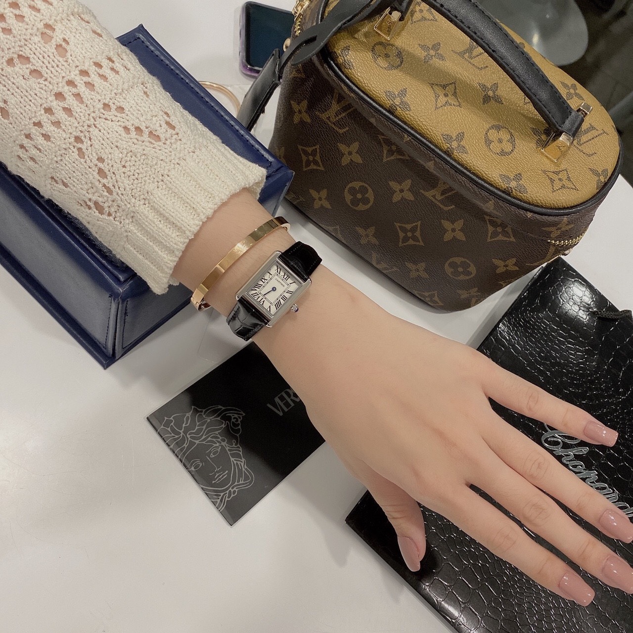 - Đồng hồ Cartier nữ dây da với bộ số La Mã cá tính với 2 kim giờ và phút cá tính