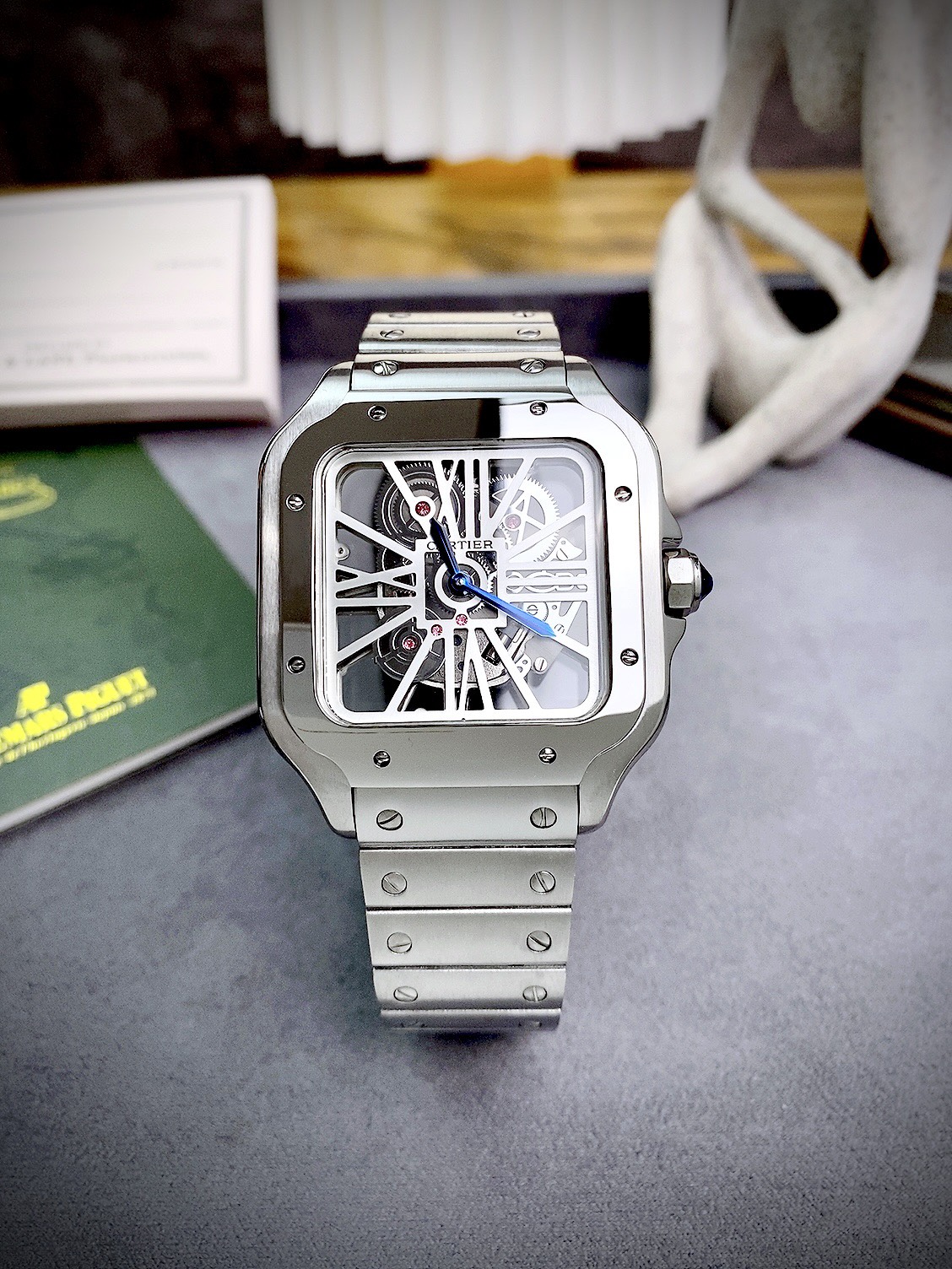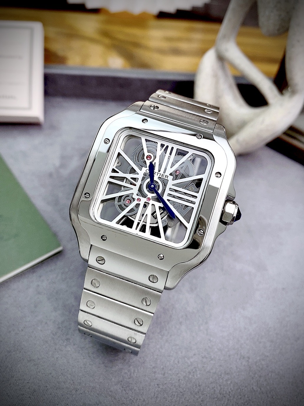 Đồng hồ Cartier Santos Skeleton lộ full máy dây kim loại nam sử dụng máy Pin Nhật chất lượng cao có sẵn tại DWatch.
