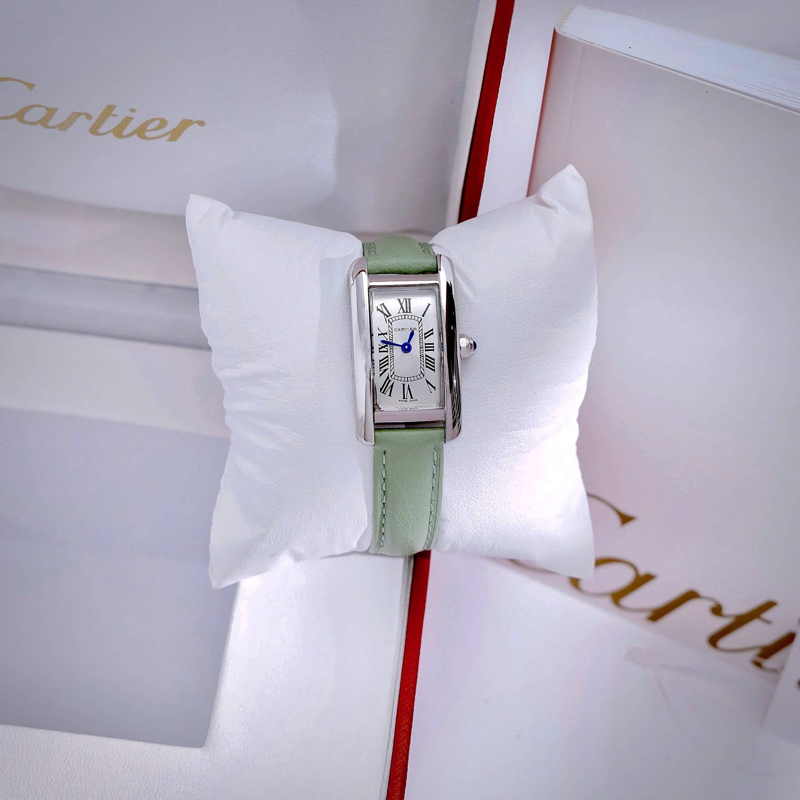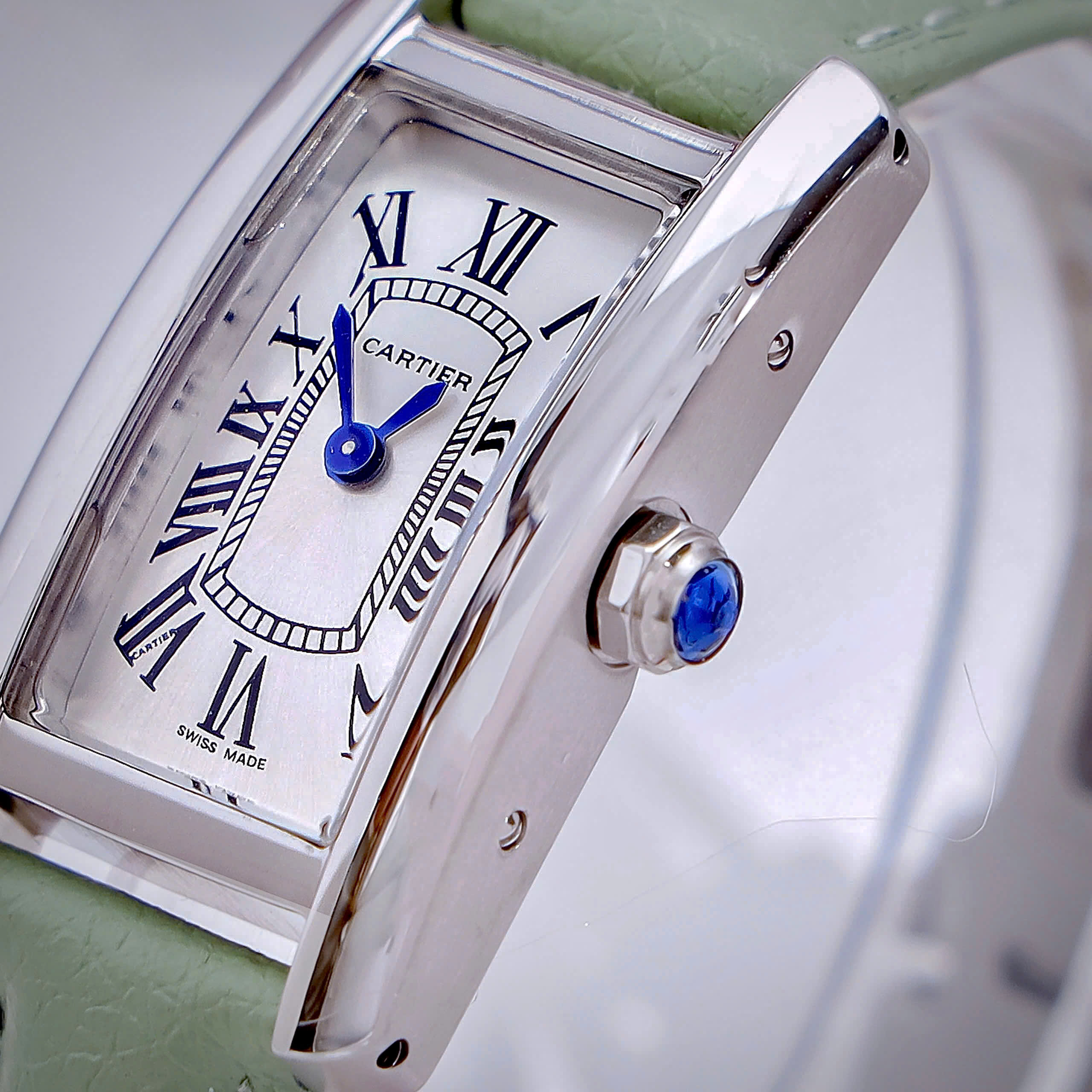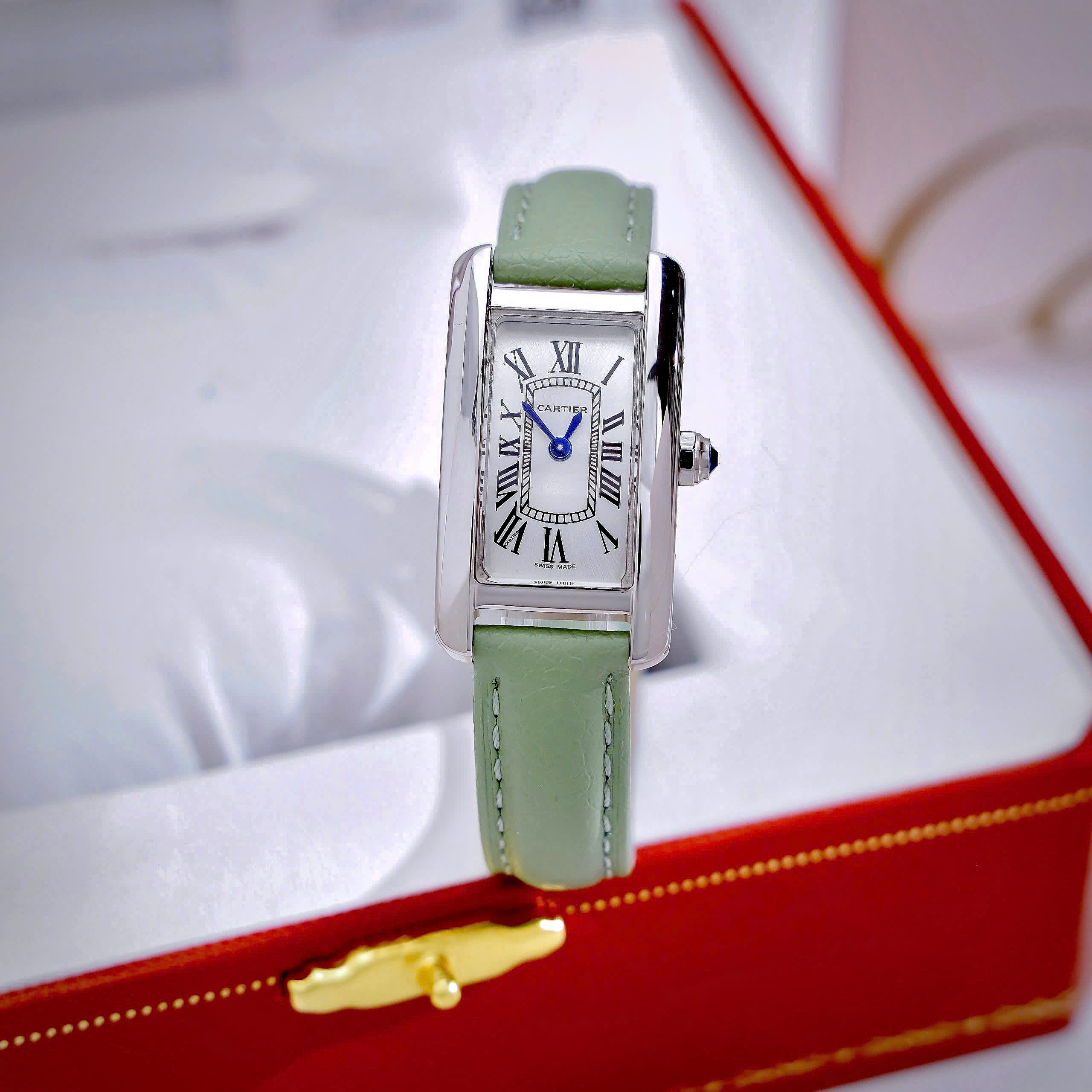 Đồng hồ Cartier Tank Américaine dây da xanh green mặt chữ nhật super fake 34mmx20mm