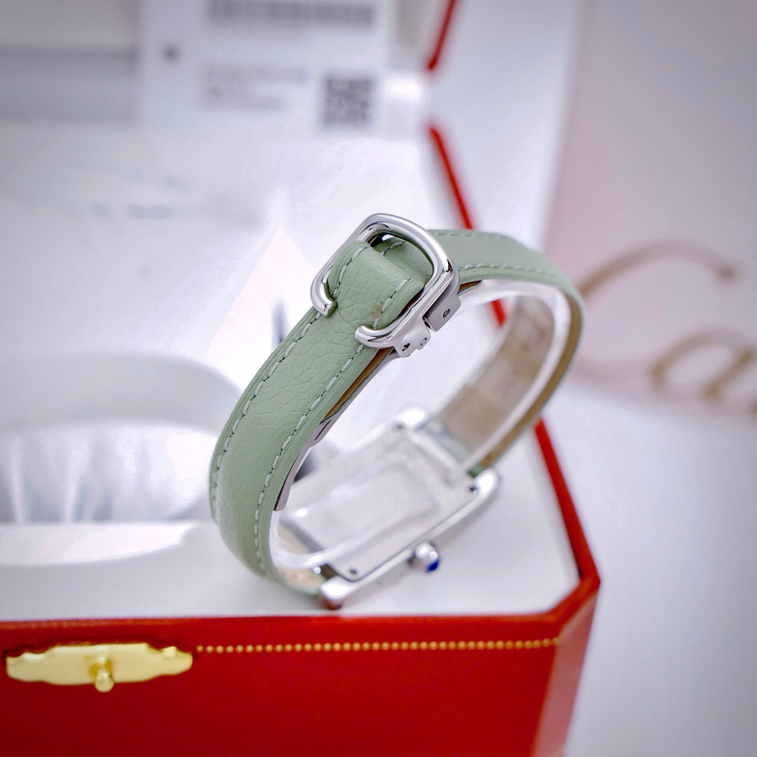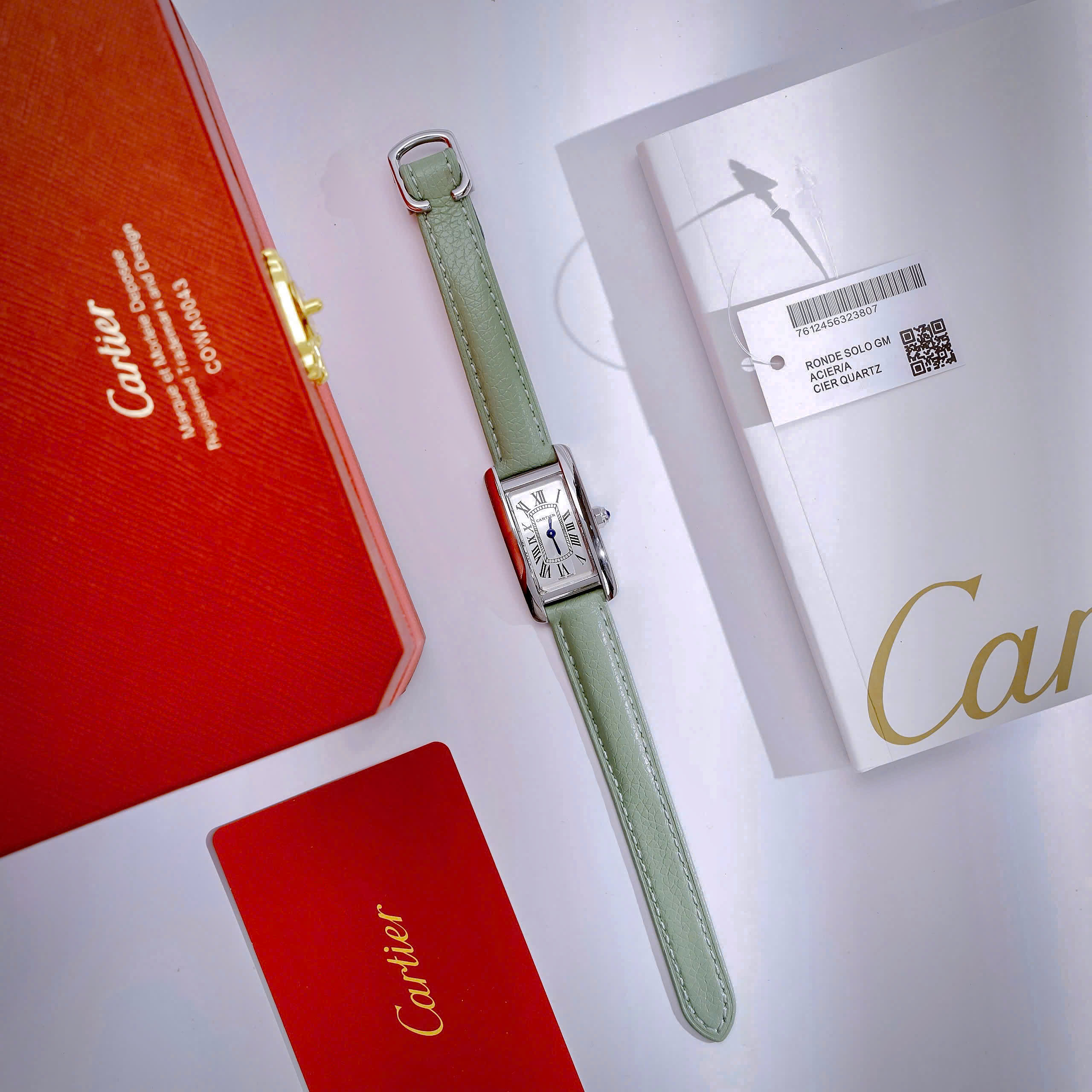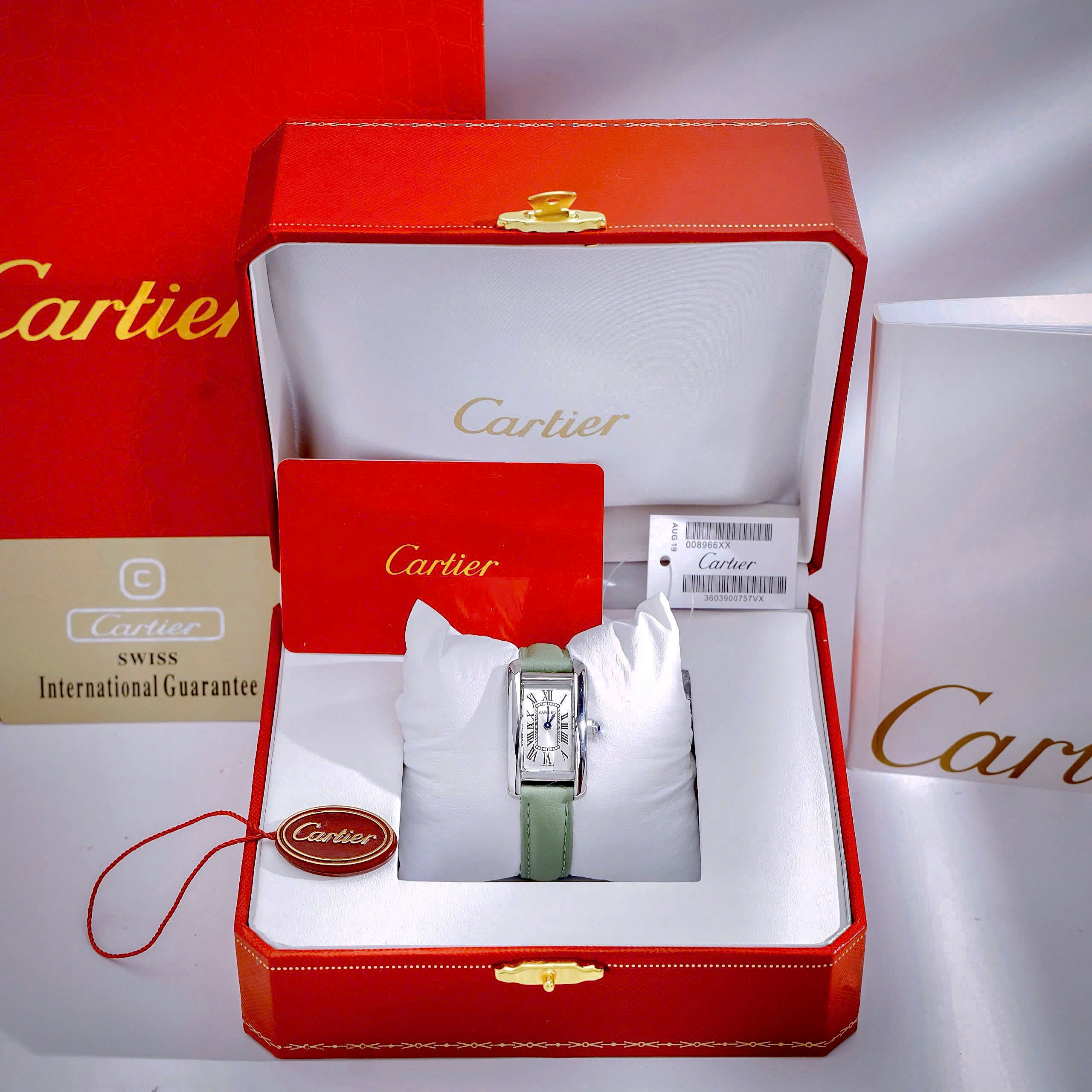 Đồng hồ Cartier Tank Américaine dây da xanh green mặt chữ nhật super fake 34mmx20mm