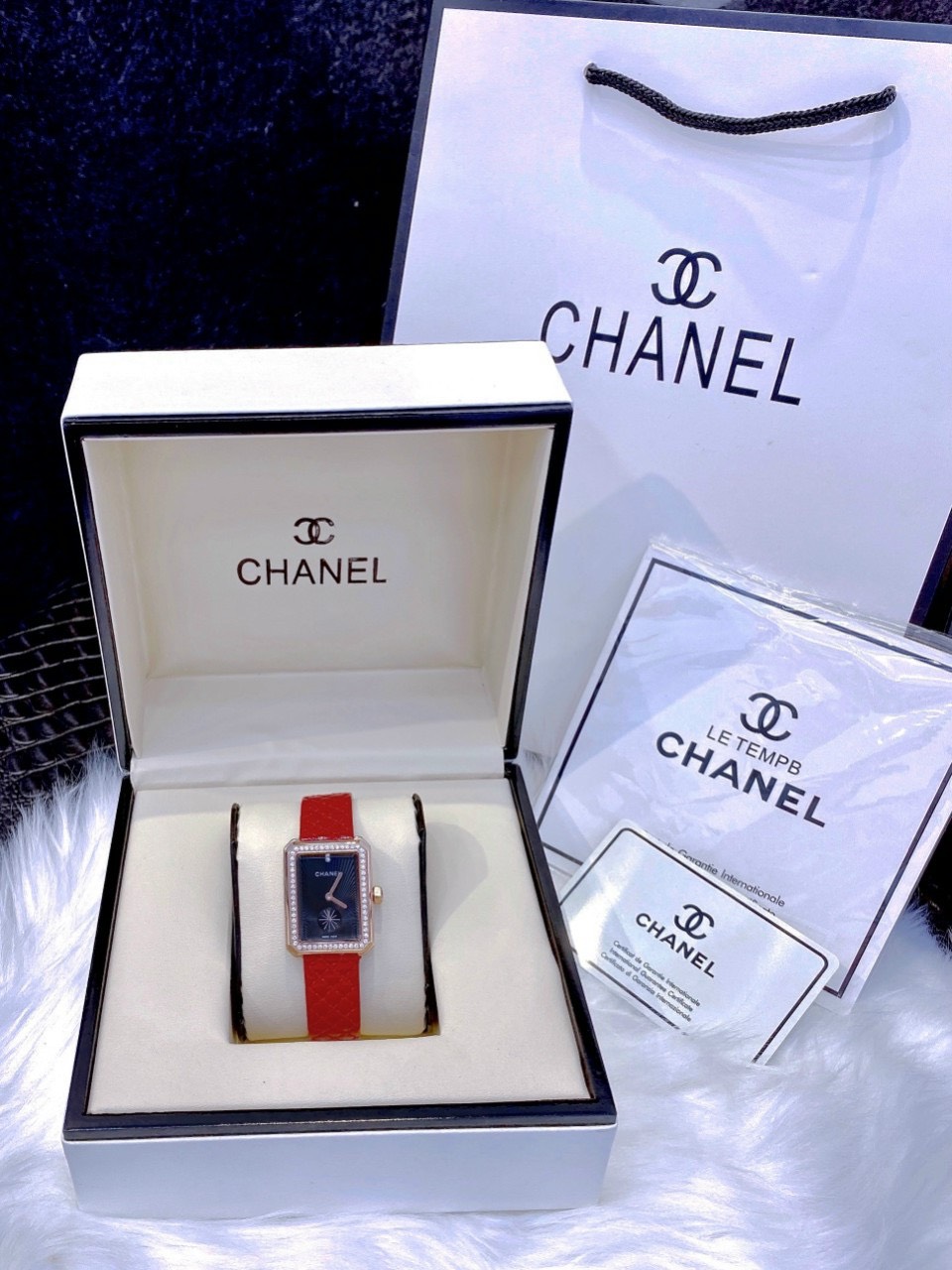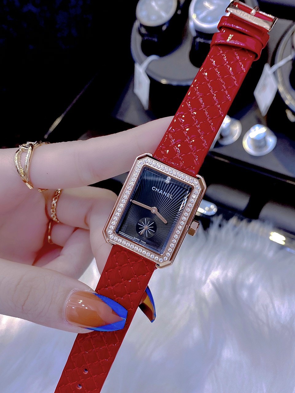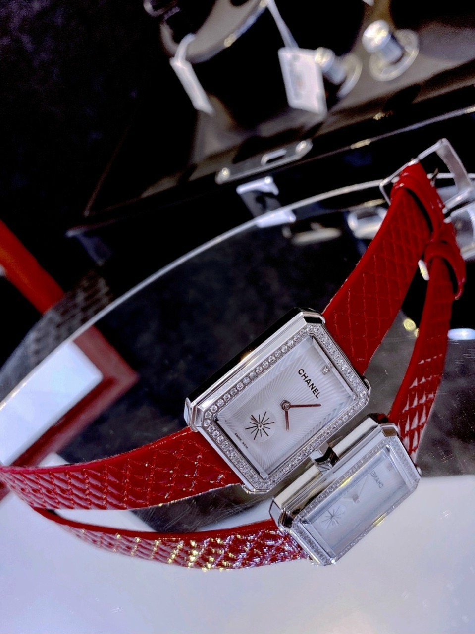 Đồng hồ Chanel nữ dây da màu đỏ quả trám Chanel Diamond Boy-Friend 35mm