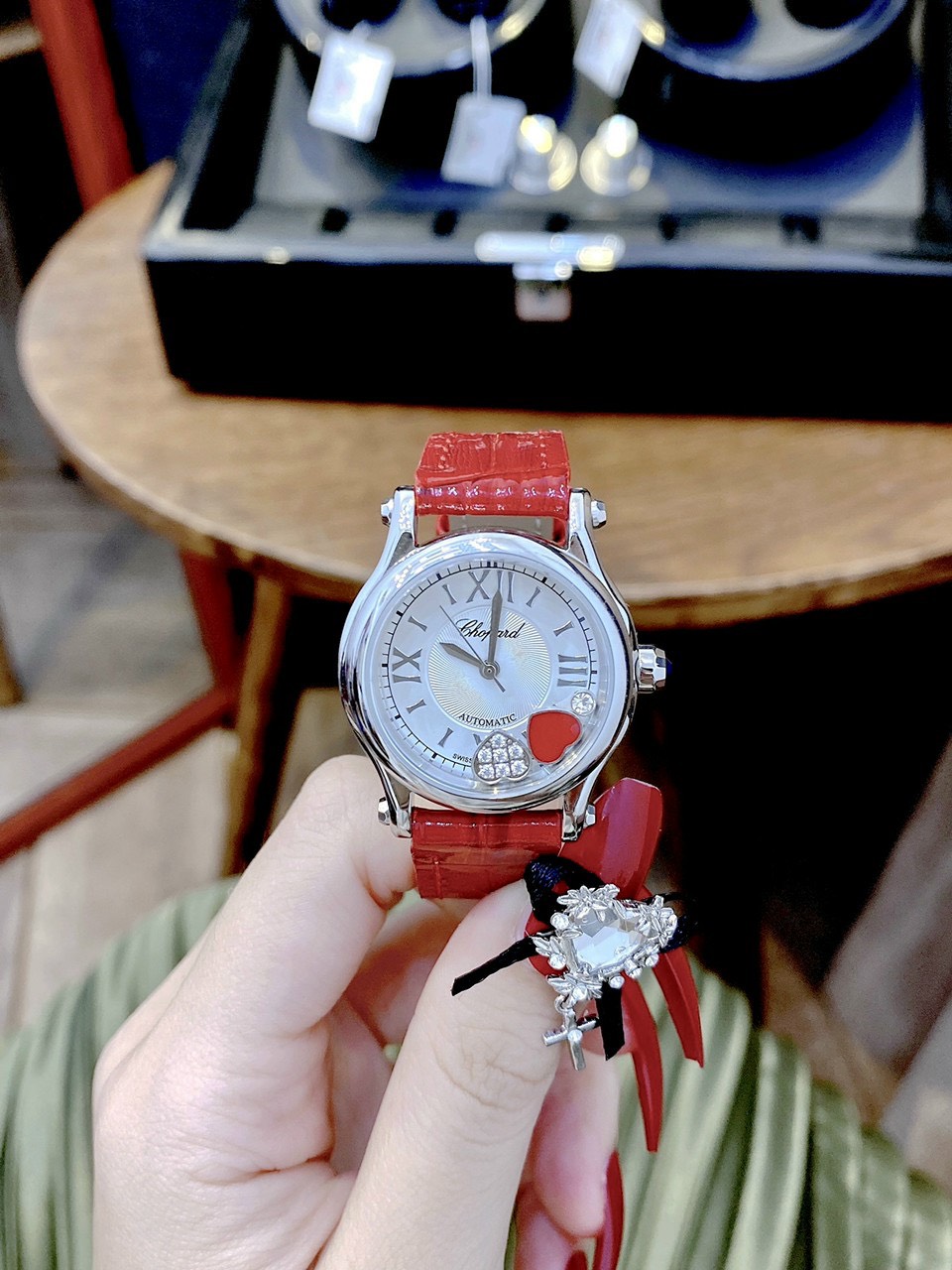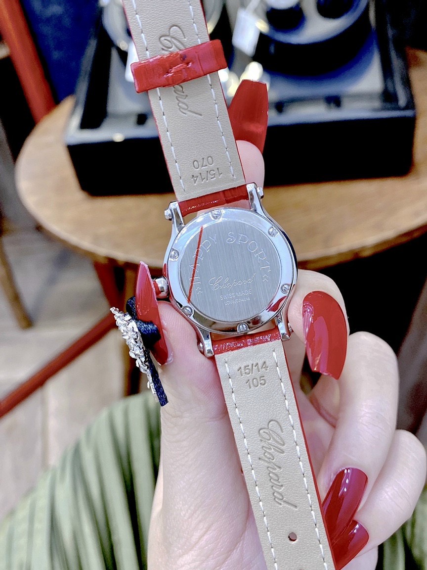 - Đồng hồ Chopard nữ dây da màu đỏ tượng trưng cho tình yêu cháy bỏng, cho đam mê bùng cháy và nhiệt huyết dâng trào
