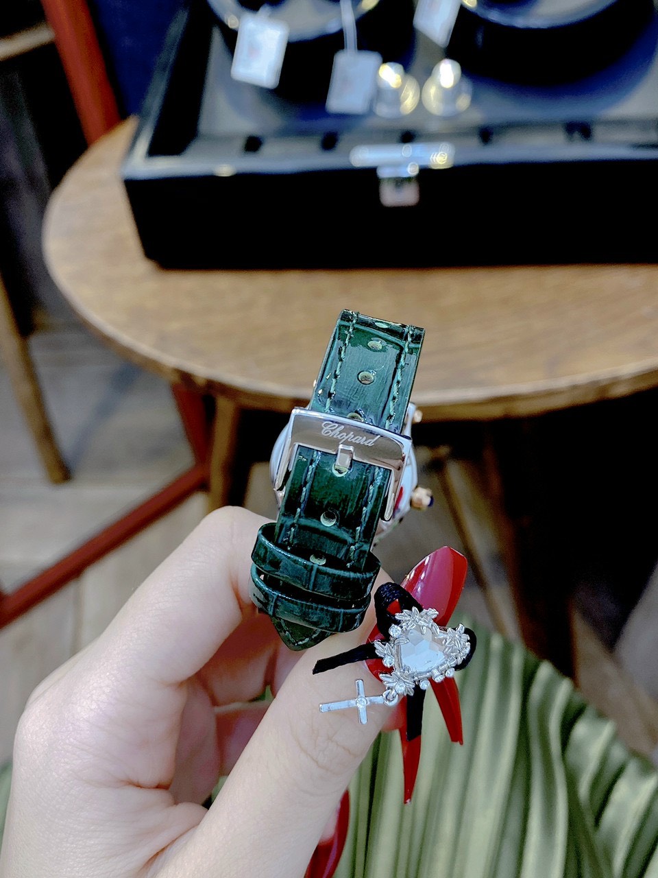 - Đồng hồ Chopard nữ dây da màu xanh lá cây tượng trưng cho sự phát triển, hòa thuận và cảm giác an toàn