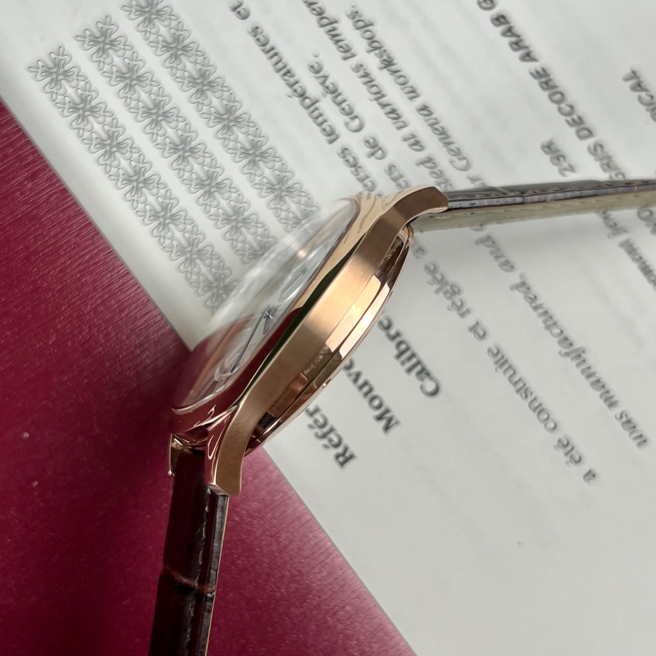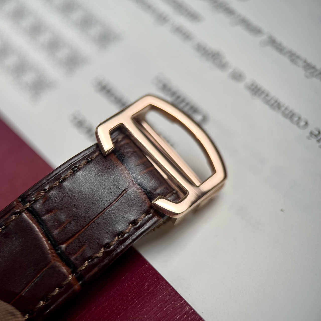 Có kích thước size 40mm, phiên bản đồng hồ nam đến từ nhà Cartier này mê hoặc quý ông bằng sự tinh tế và khả năng chống thấm nước hiệu quả so với các model đồng hồ lặn đến từ các thương hiệu khác. Nối liền với vỏ qua bốn càng nối dây là dây đeo tay làm từ da bò dập vân cá sấu màu nâu cao cấp với bề mặt bóng bẩy đi kèm với bộ khóa cài sang trọng được mạ vàng hồng cao cấp.