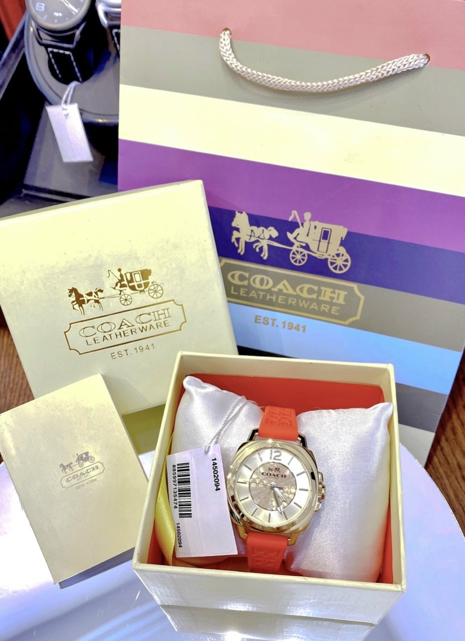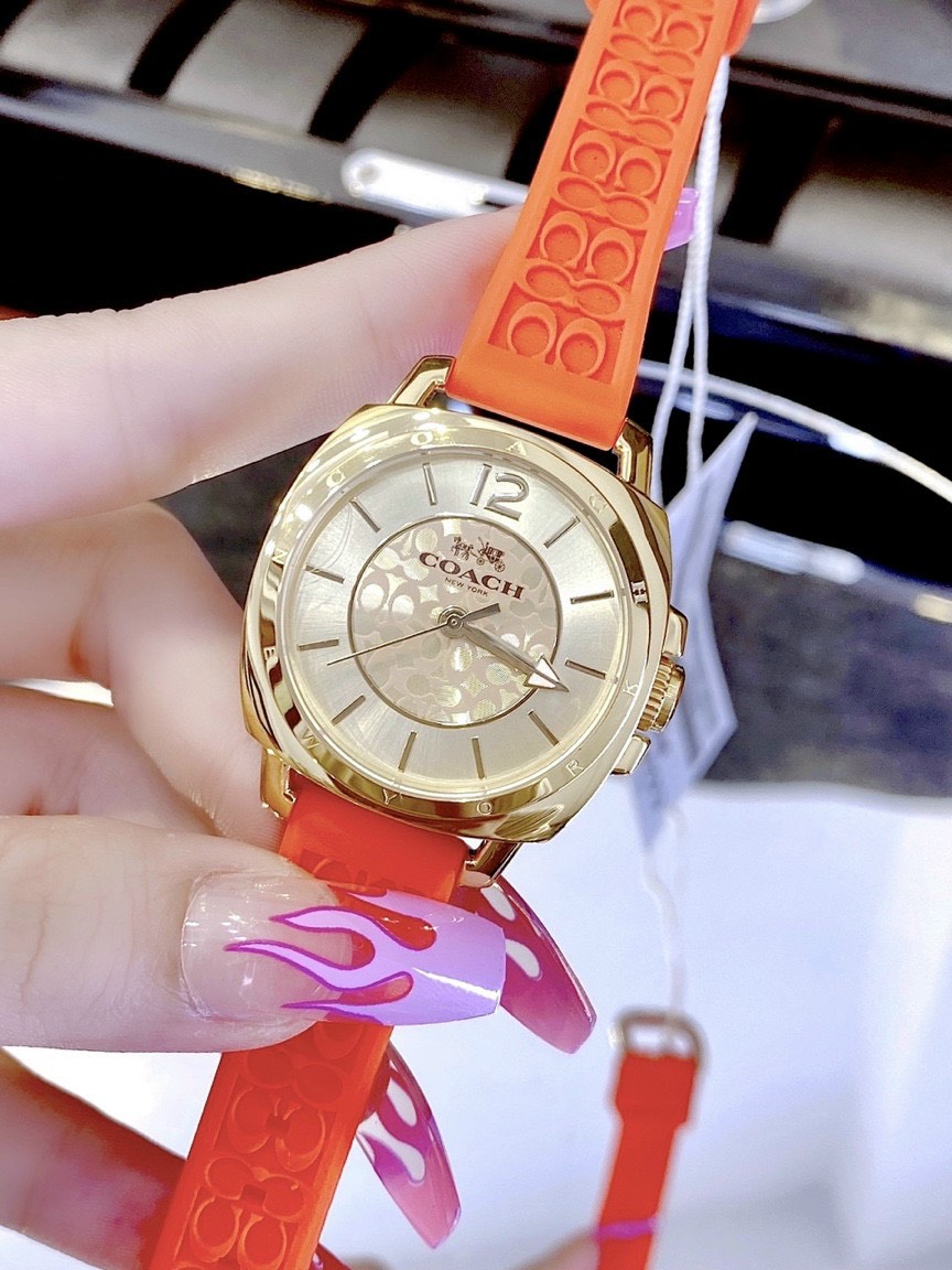 - Đồng hồ Coach nữ dây cao su màu cam thụ hưởng sự mạnh mẽ của màu đỏ và sự hạnh phúc của màu vàng