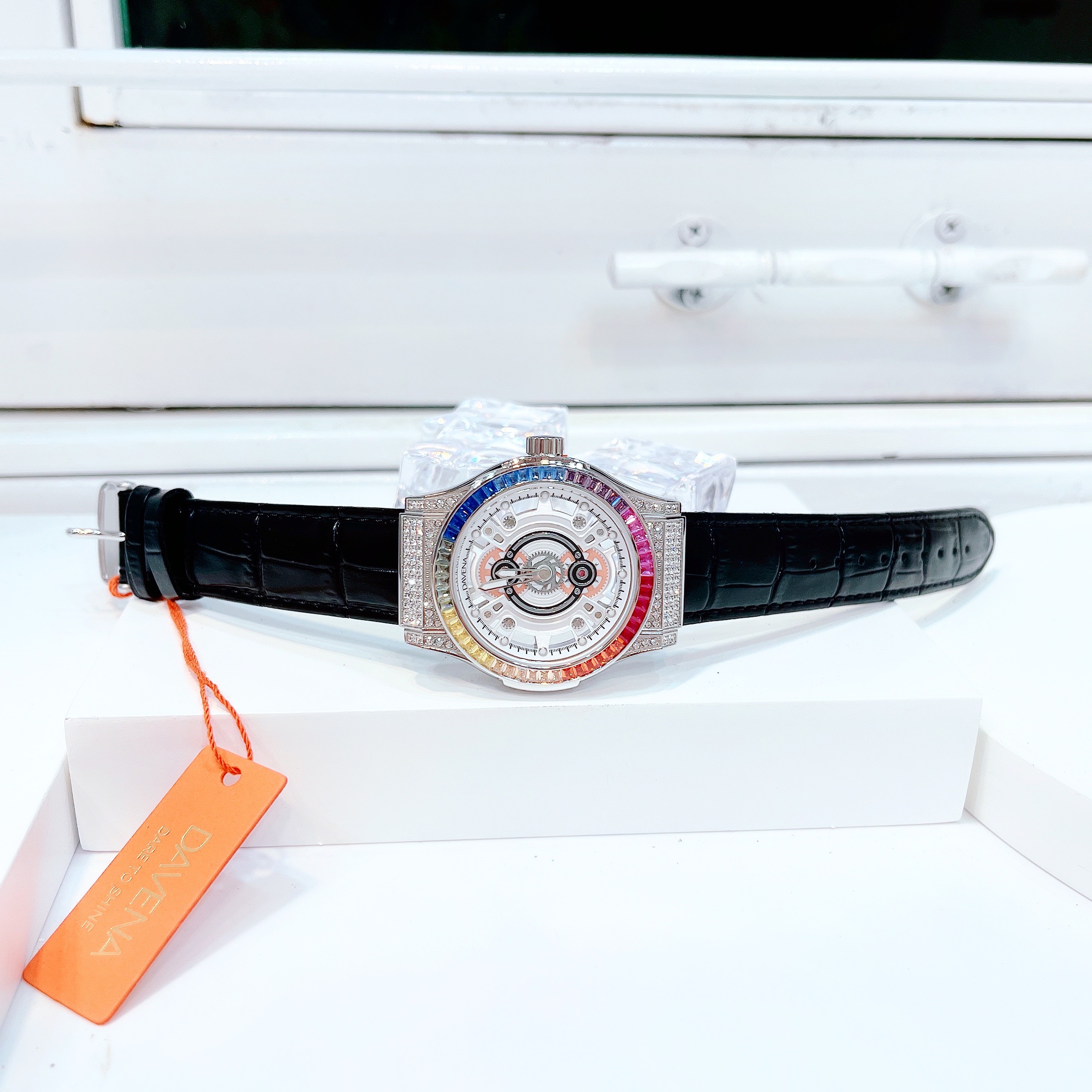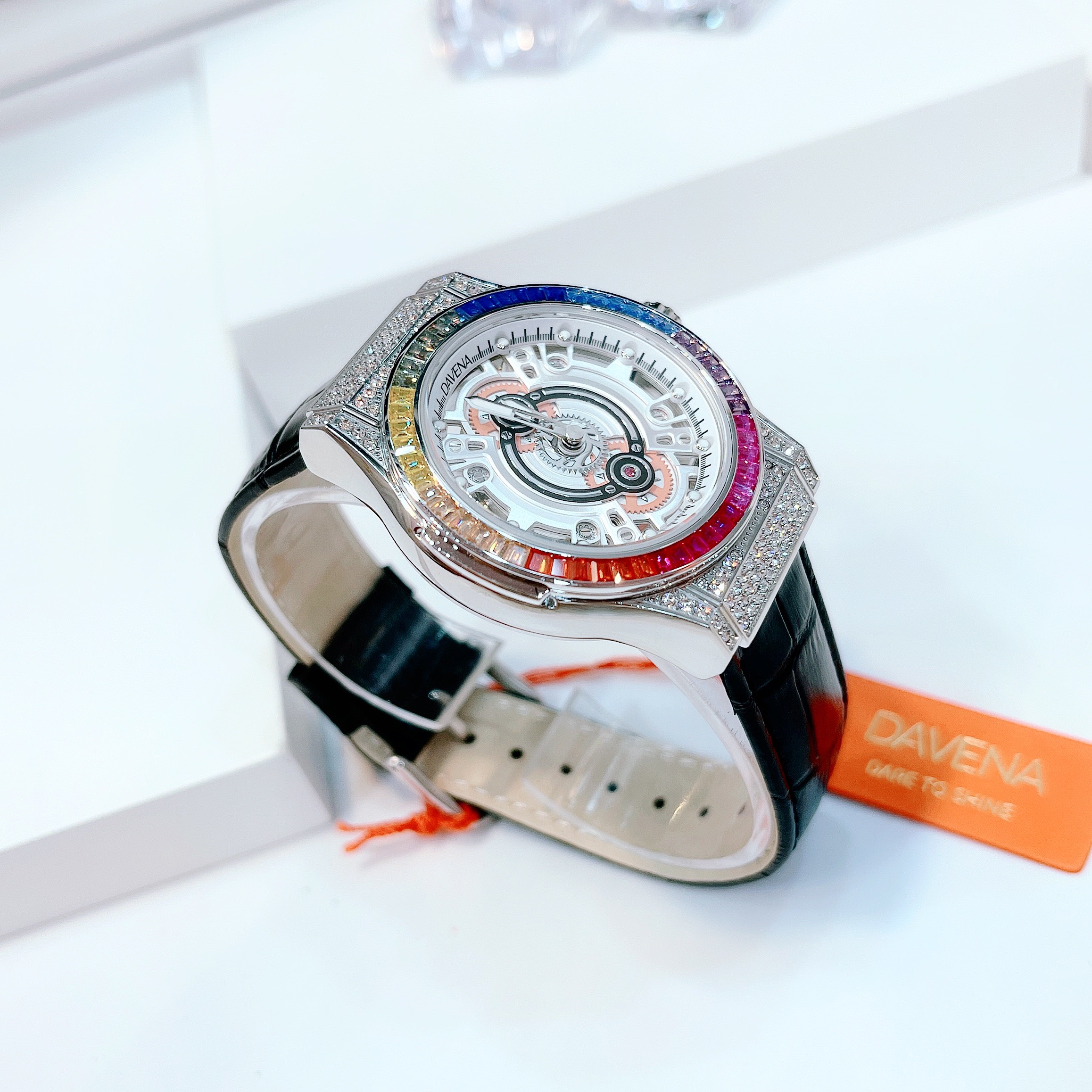 - Đồng hồ nữ Davena đính full đá SWarovski trên viền sáng lấp lánh nổi bật cùng viền đá nhiều sắc màu quyến rũ