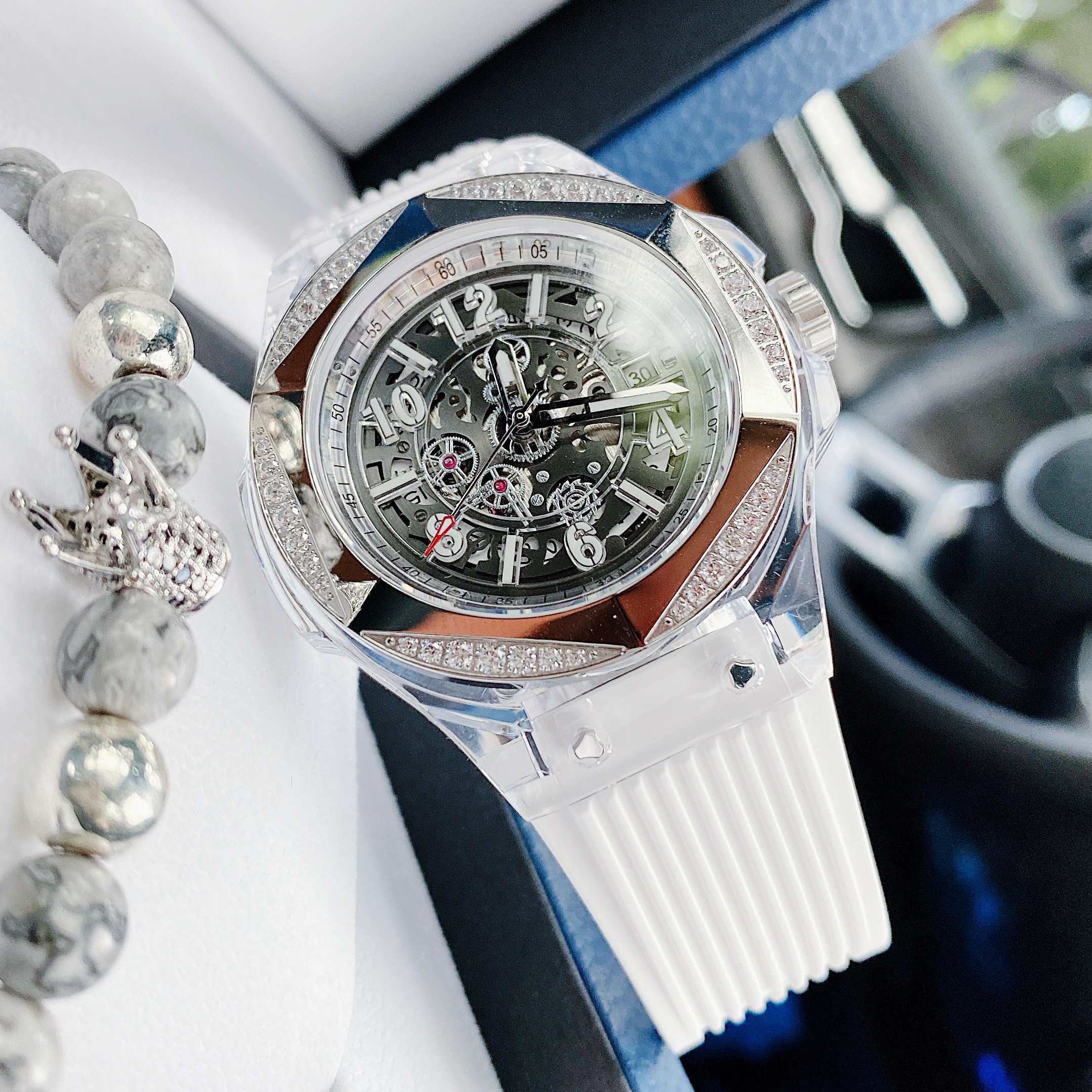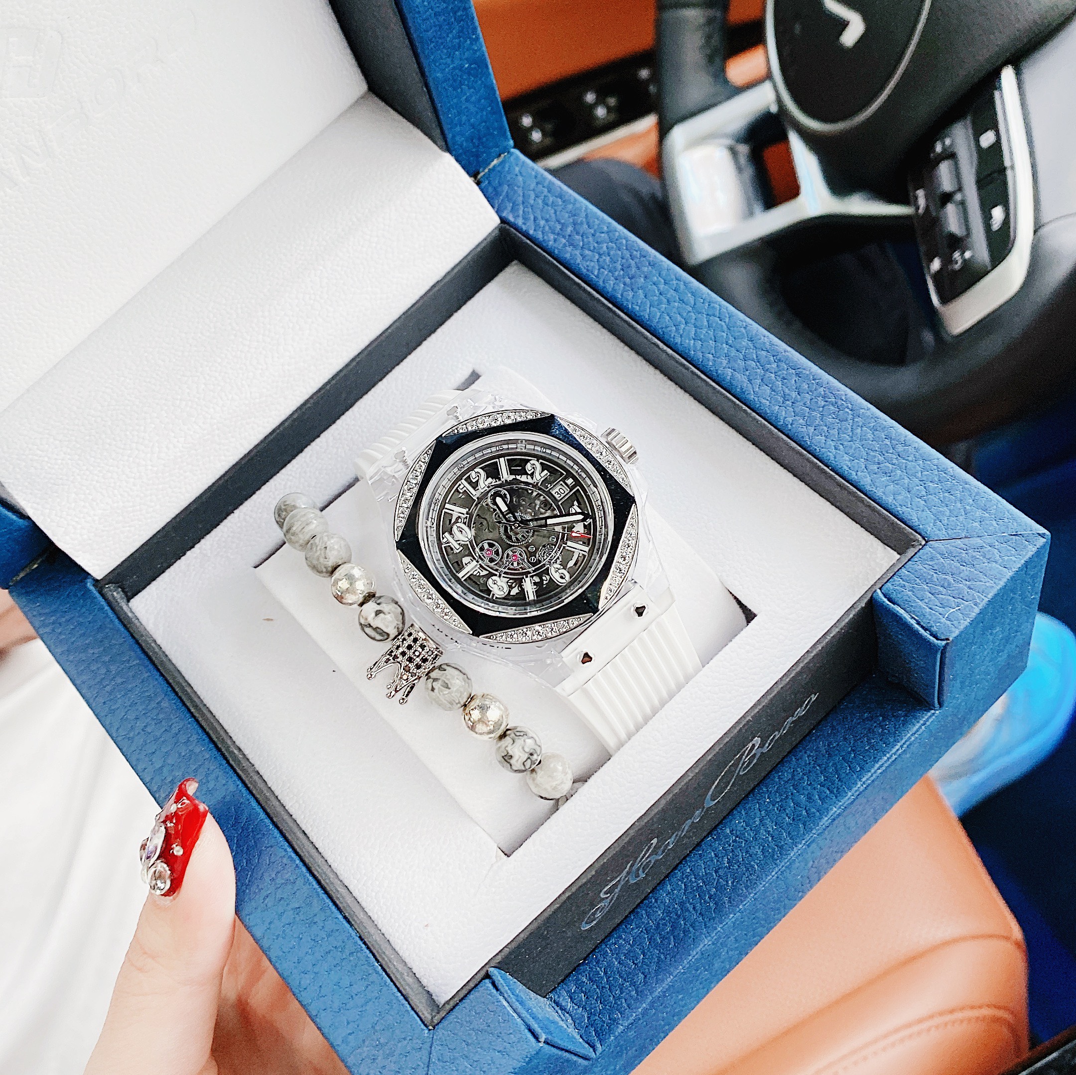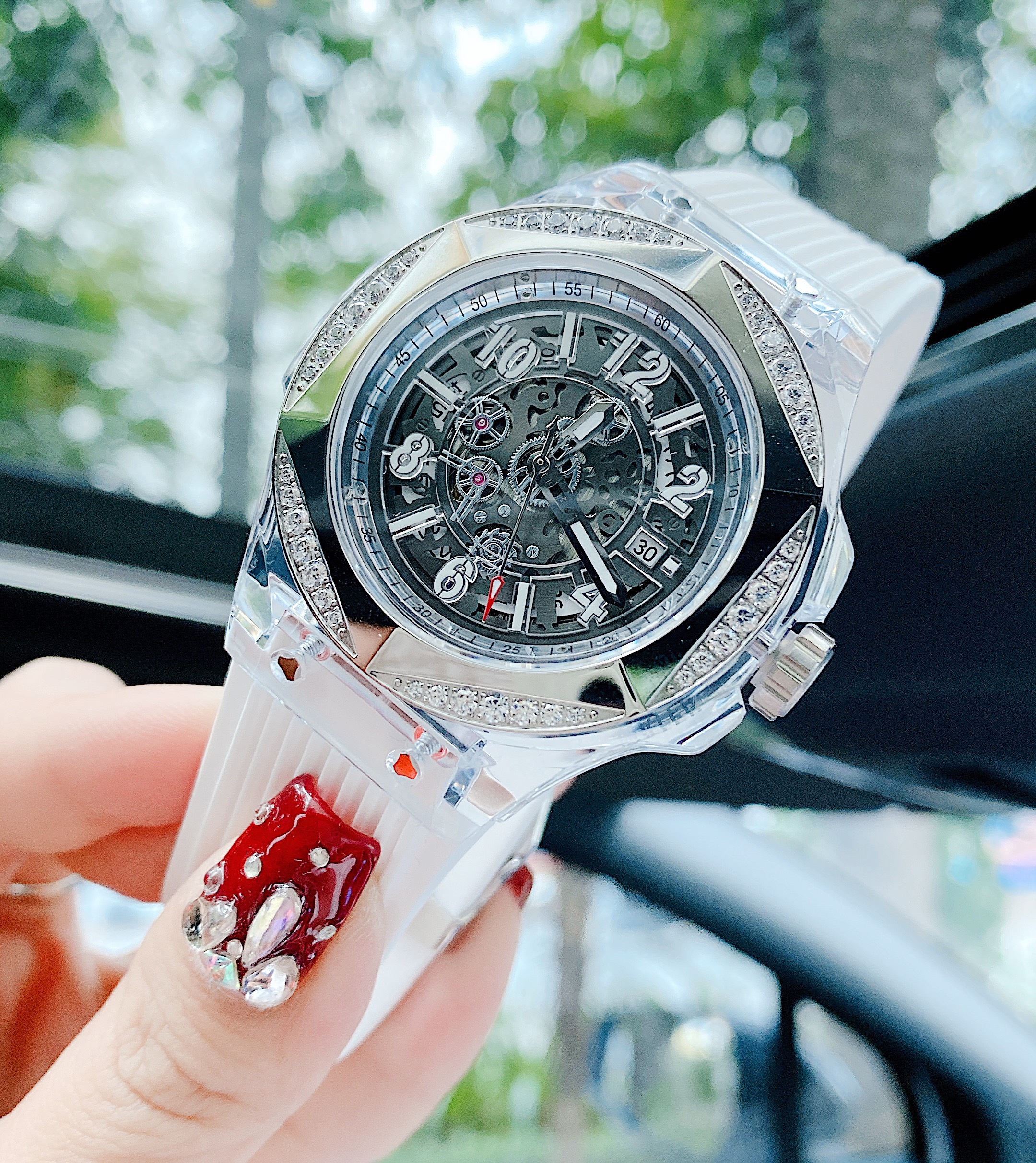 Đồng hồ đính đá Hanboro chính hãng dây cao su màu trắng nam