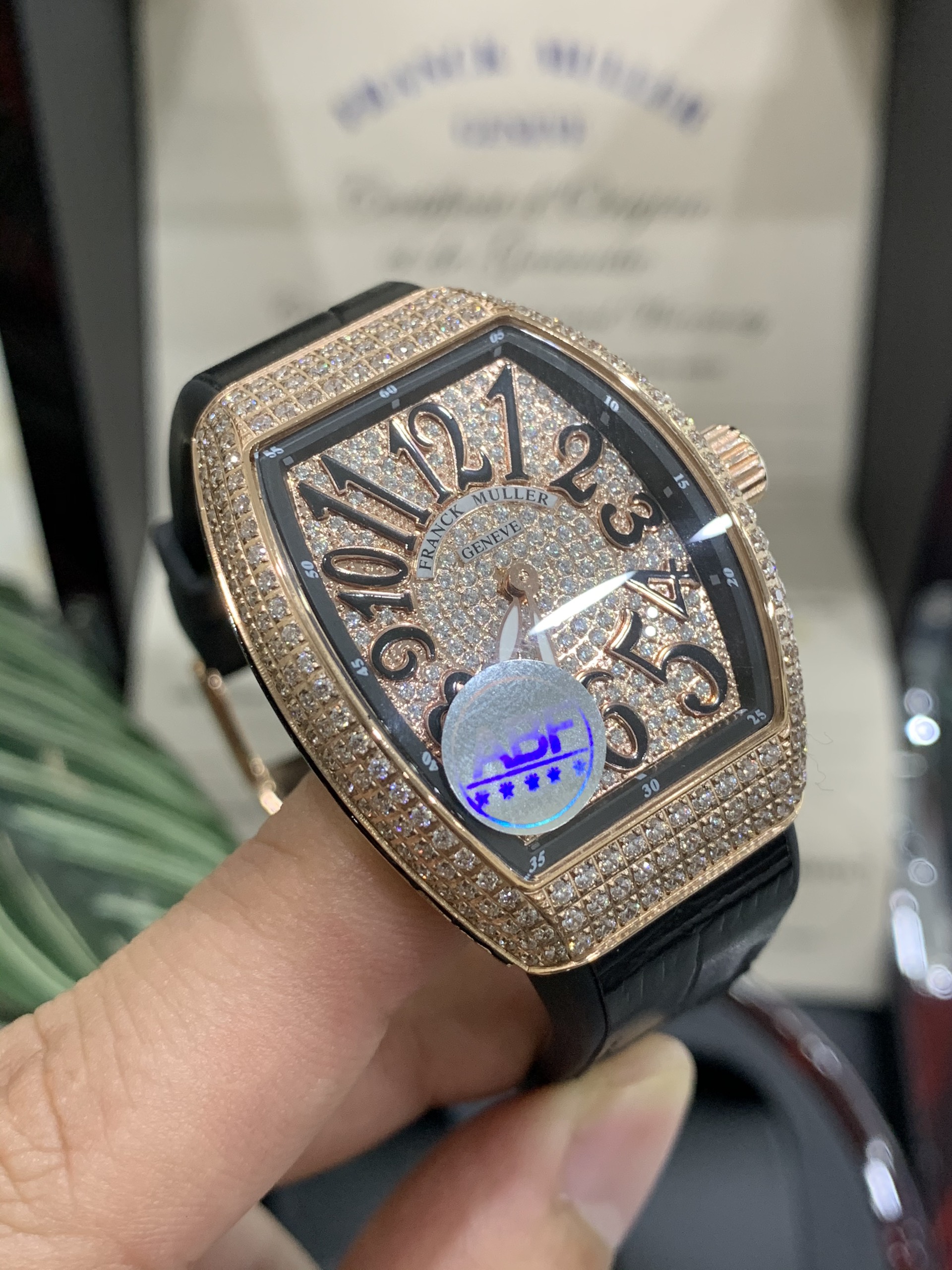- Đồng hồ Franck Muller nữ siêu cấp đính kim cương nhân tạo sang chảnh, nổi bật, quyến rũ full mặt và viền