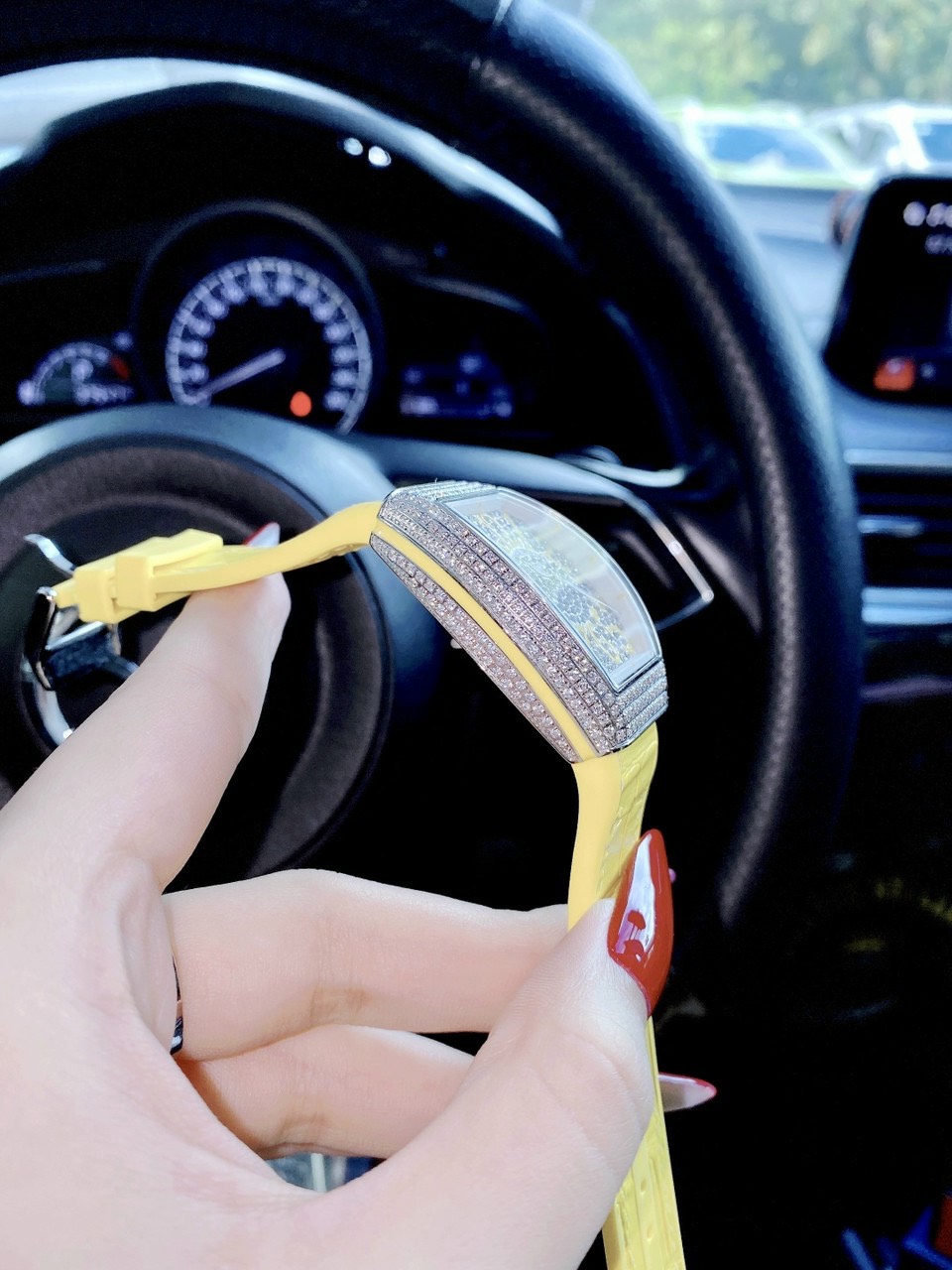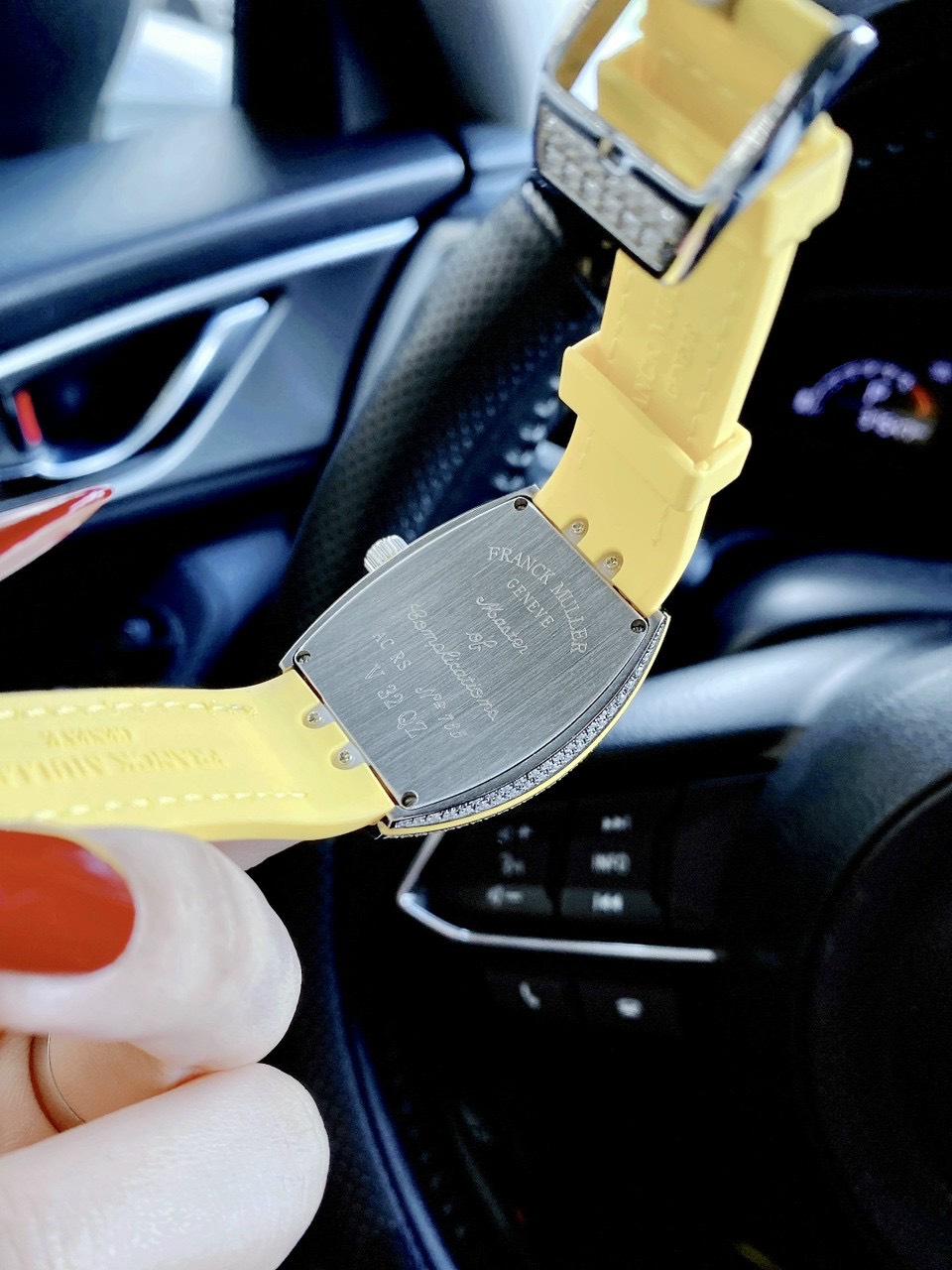 Không thể không kể đến phần dây đồng hồ lõi cao su bọc da cực kì chất lượng của sản phẩm. Phần dây da được nhuộm màu, thể hiện một tư duy thiết kế bậc nhất với cách phối từng mảng màu hết sức chỉnh chu của đồng hồ Franck Muller nữ siêu cấp V32.