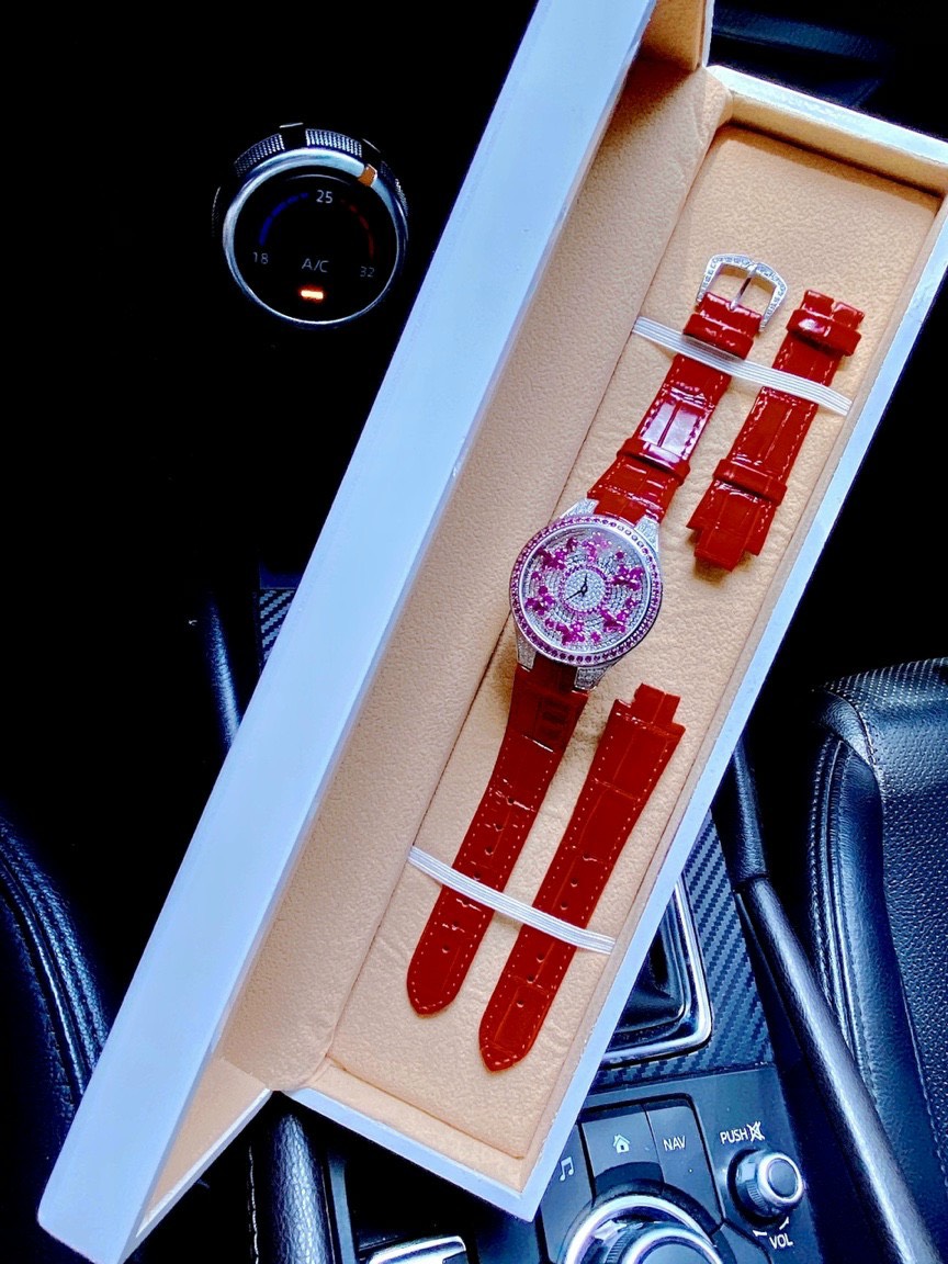 Một chiếc đồng hồ nữ sang trọng kết hợp giữa 6 con bướm bằng đá ruby đặt trên nền kim cương nhân tạo sáng lung linh. Với 6 con bướm tạo ra 1 chuyển động kỳ diệu cho chiếc đồng hồ . Khi cổ tay của người đeo đi chuyển . Một kính vạn hoa gồm những con bướm xoay tròn đầy thôi miên tôn lên nét đẹp tinh tế dành cho phái đẹp.
