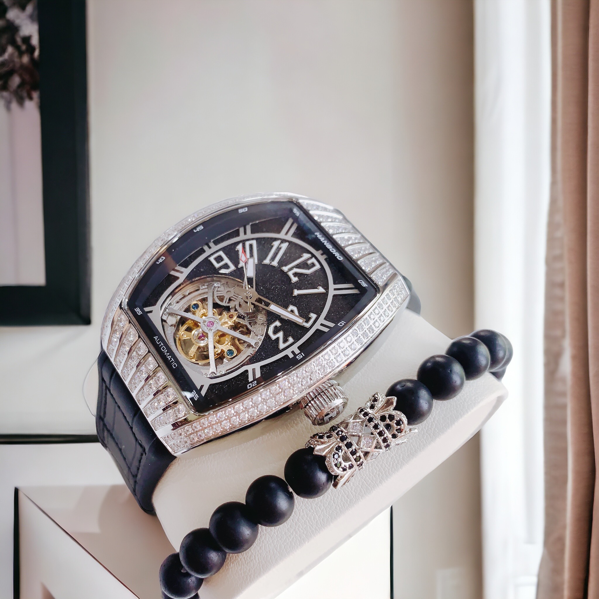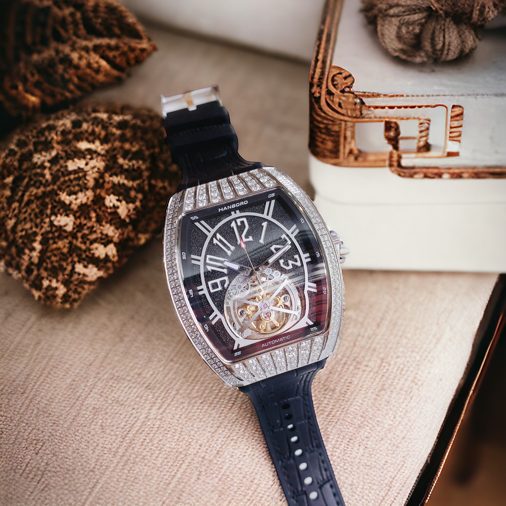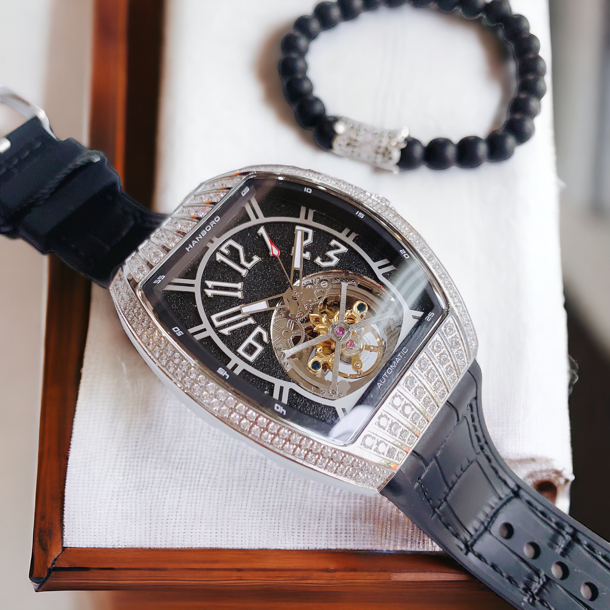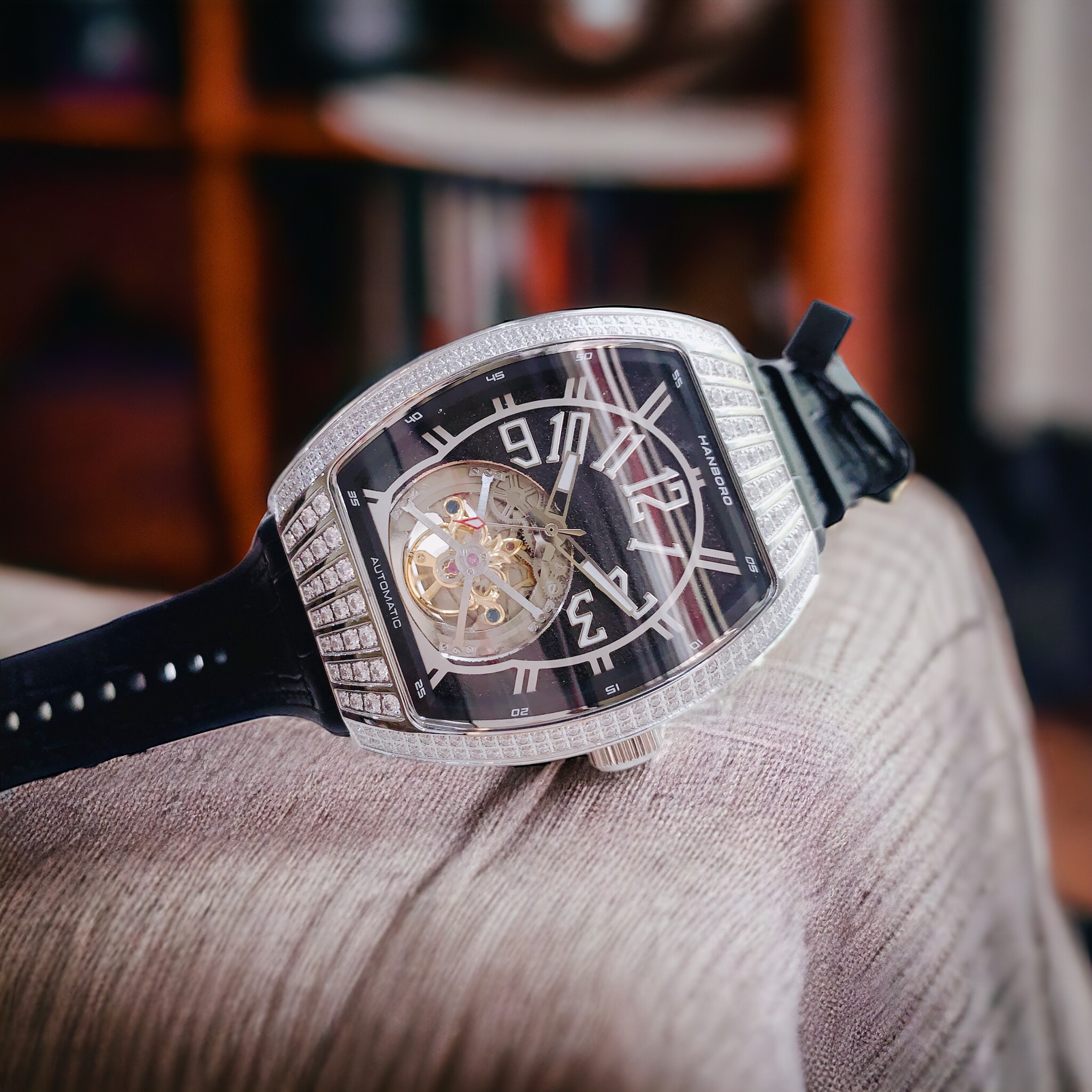 Đồng hồ Hanboro nam mặt đen viền đính đá