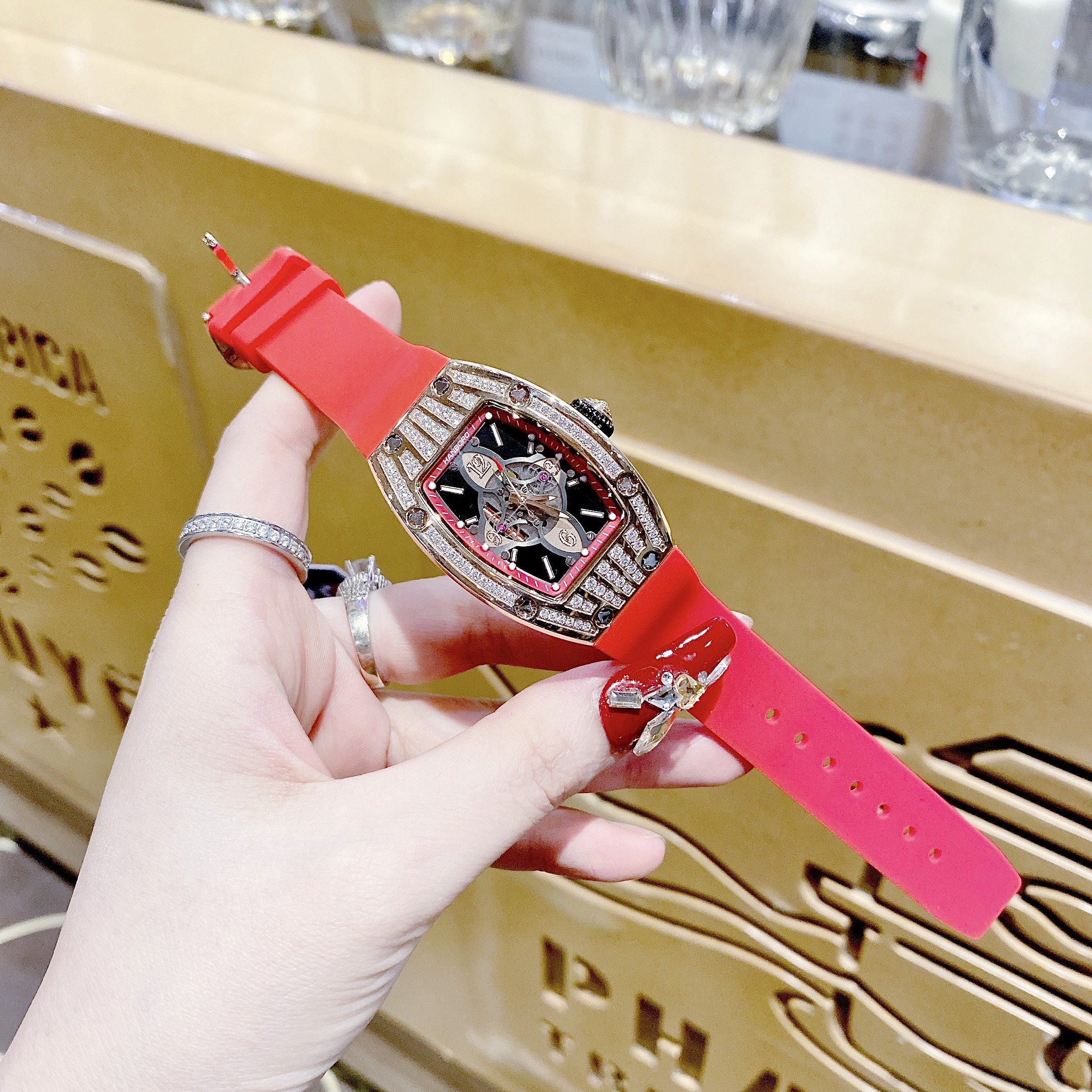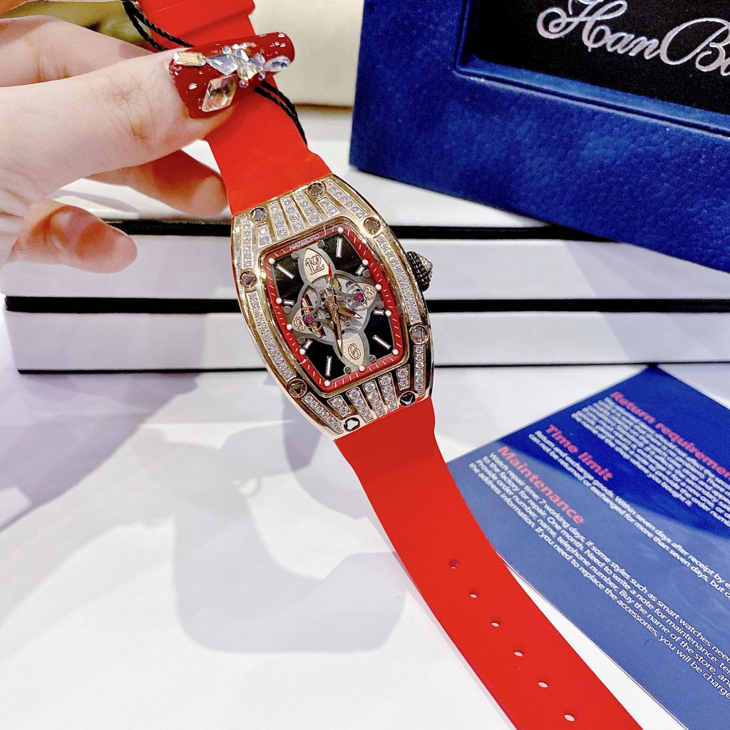 Đồng hồ Hanboro nữ dây cao su màu đỏ và vàng hồng chính hãng 36mm