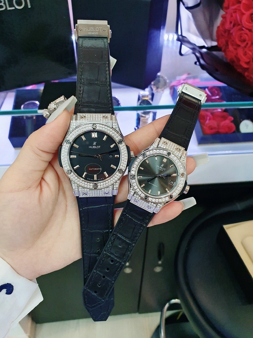 Đồng hồ Hublot cặp nam nữ đính đá Hublot Automatic Super Fake màu đen 34/42mm