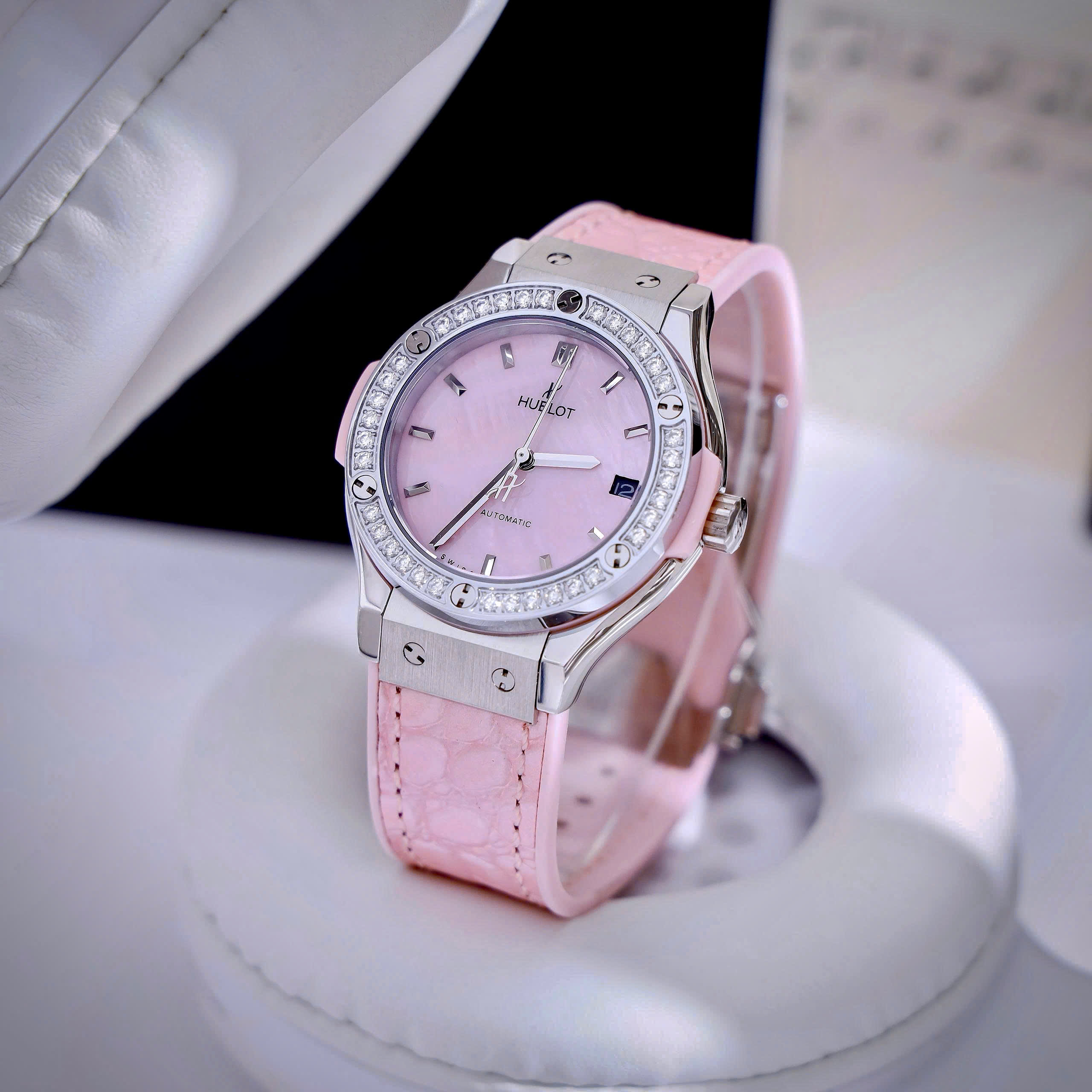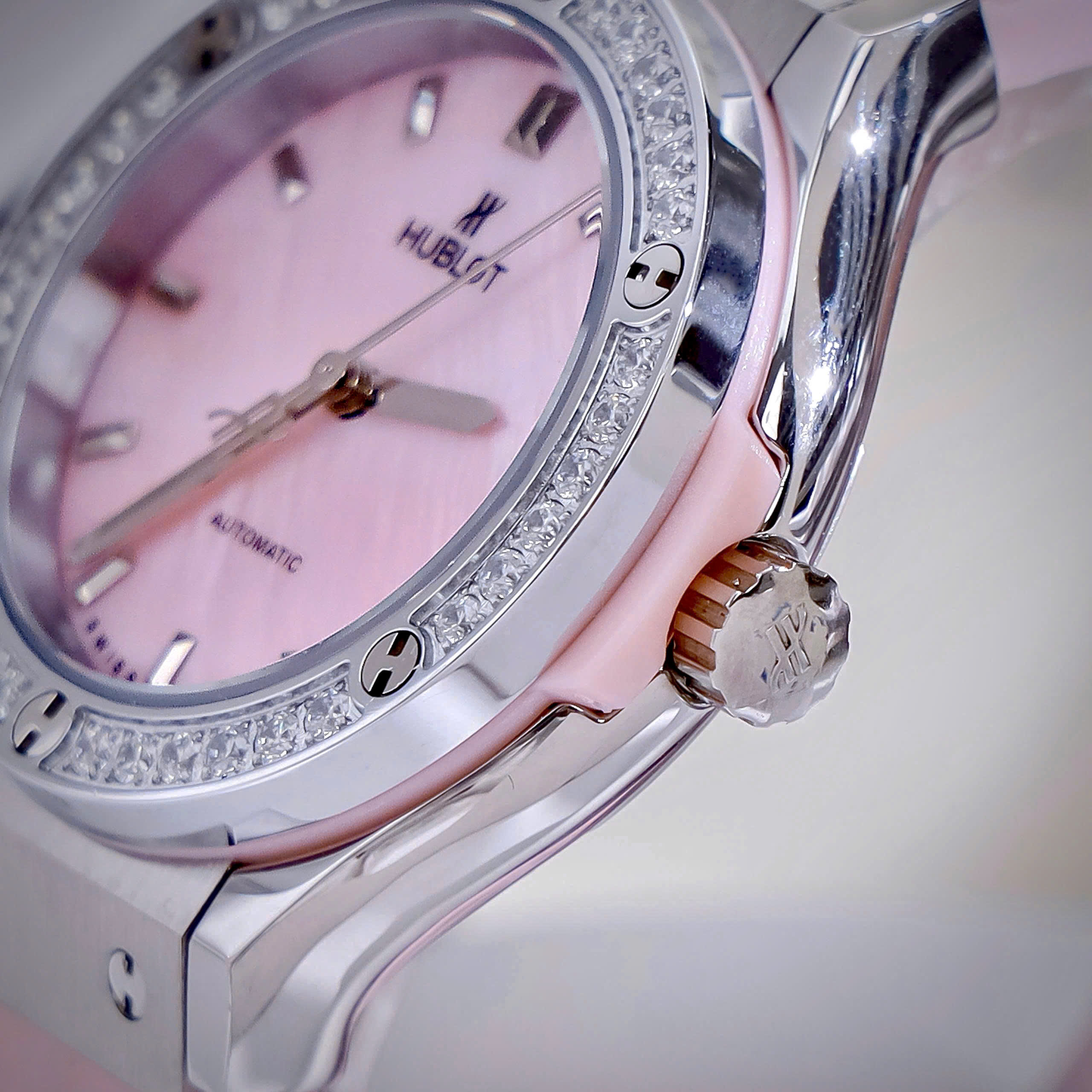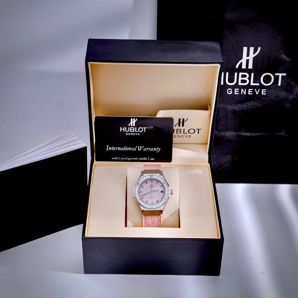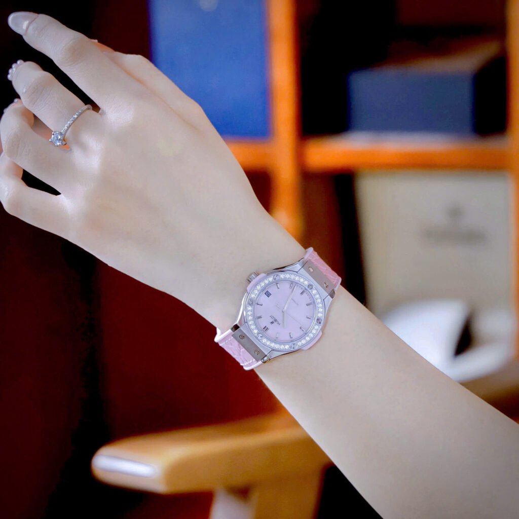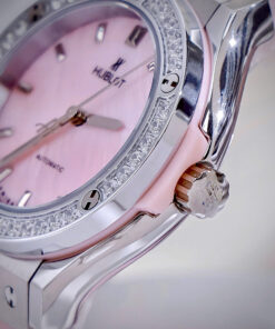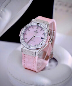Đồng hồ Hublot Fake cao cấp nữ đính đá mặt xà cừ hồng máy cơ Nhật Automatic 34mm