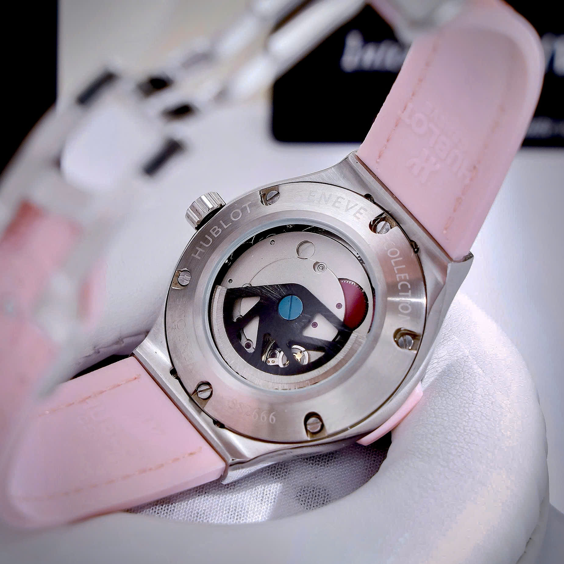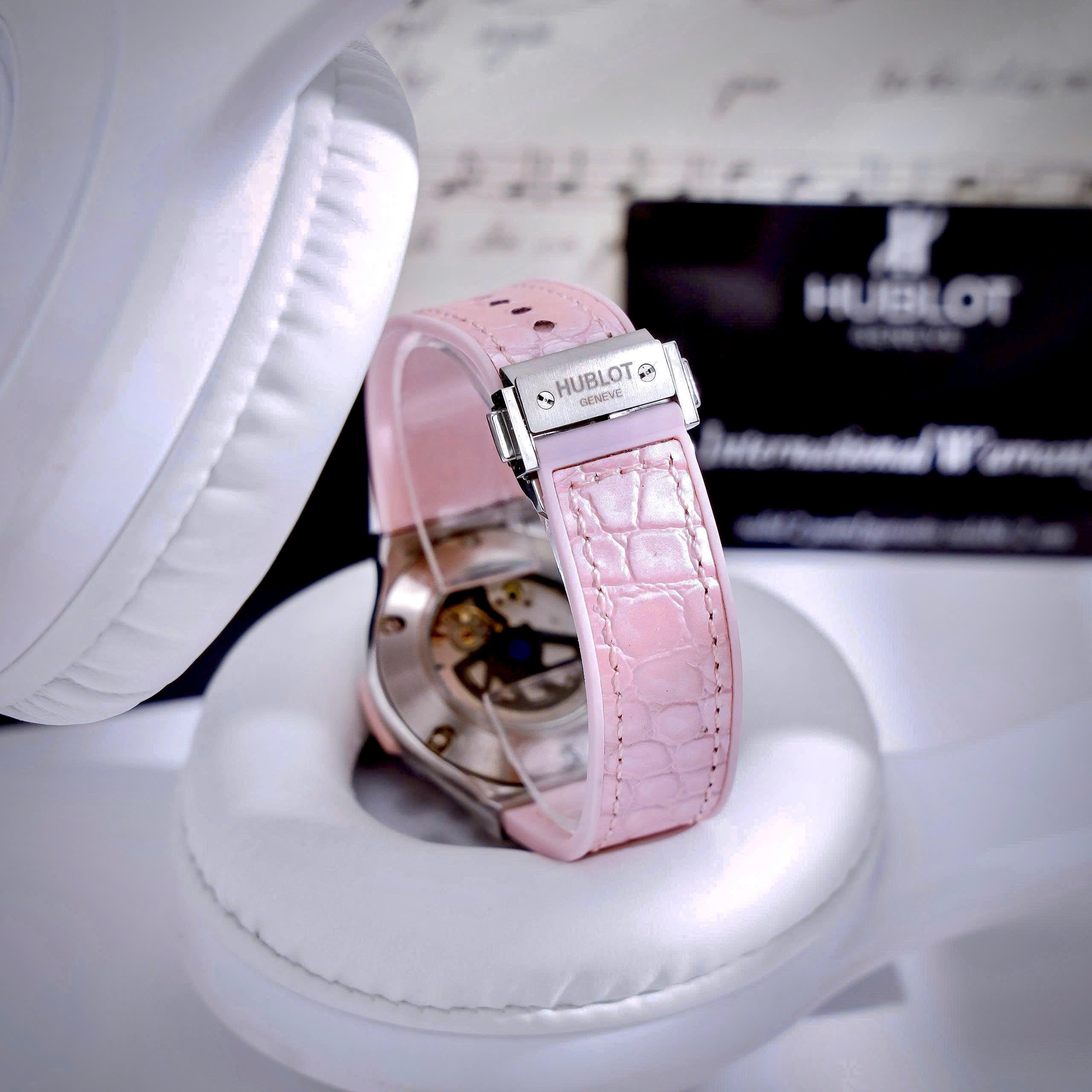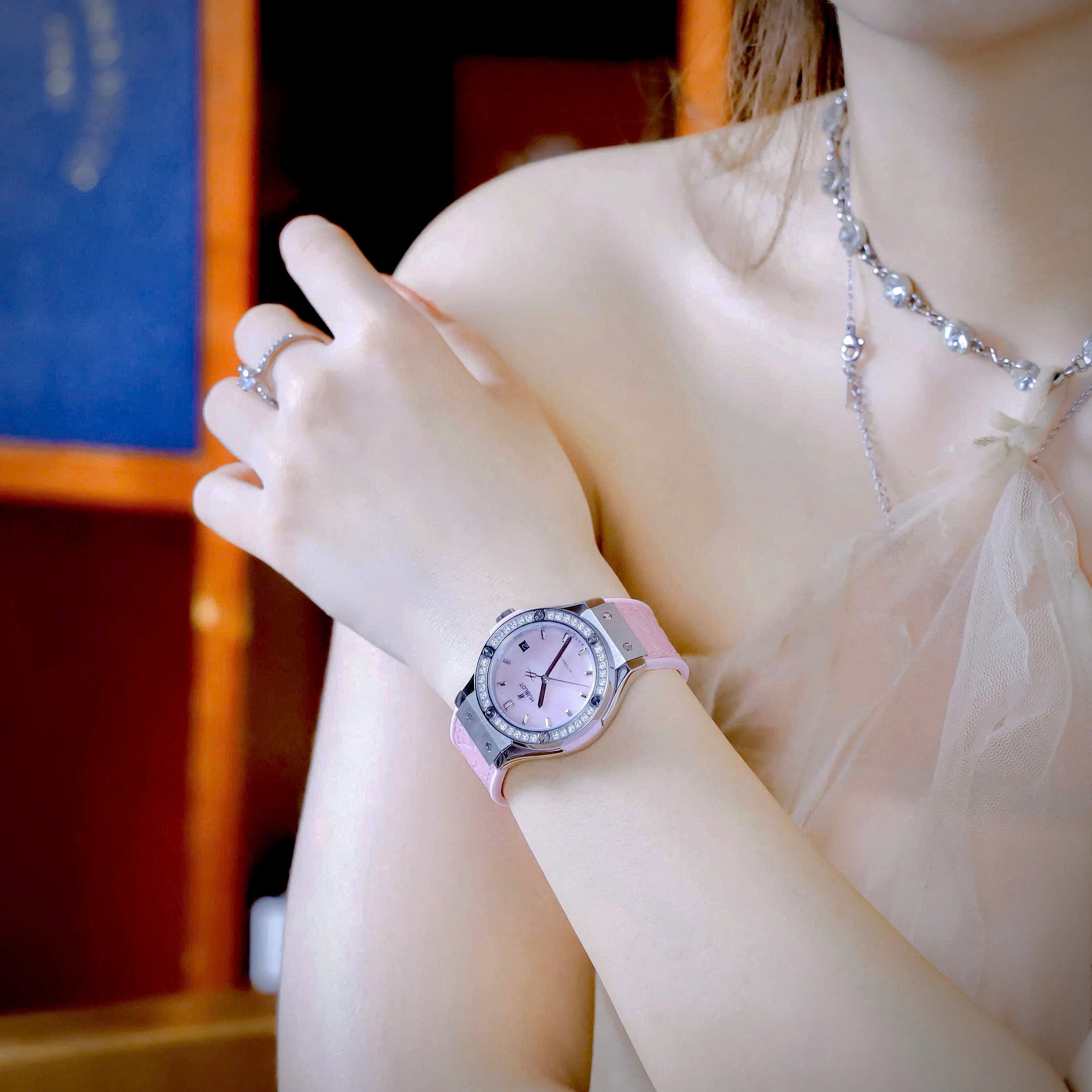 Đồng hồ Hublot Fake cao cấp nữ đính đá mặt xà cừ hồng máy cơ Nhật Automatic 34mm