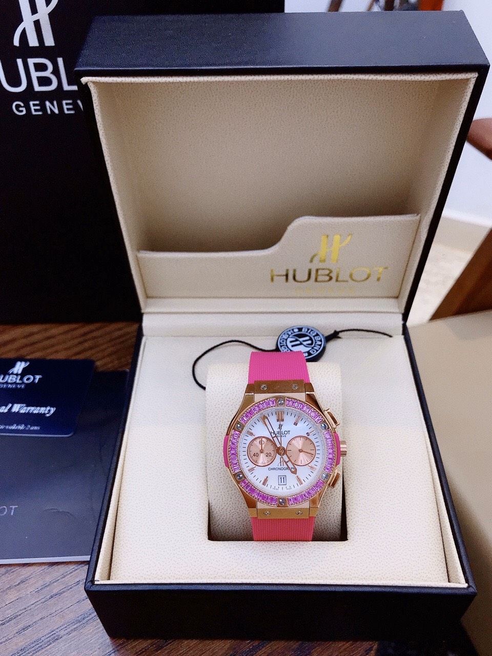 - Bộ số và kim đồng hồ Hublot nữ màu hồng dây cao su thanh mảnh, tinh tế chạy kèm lịch ngày