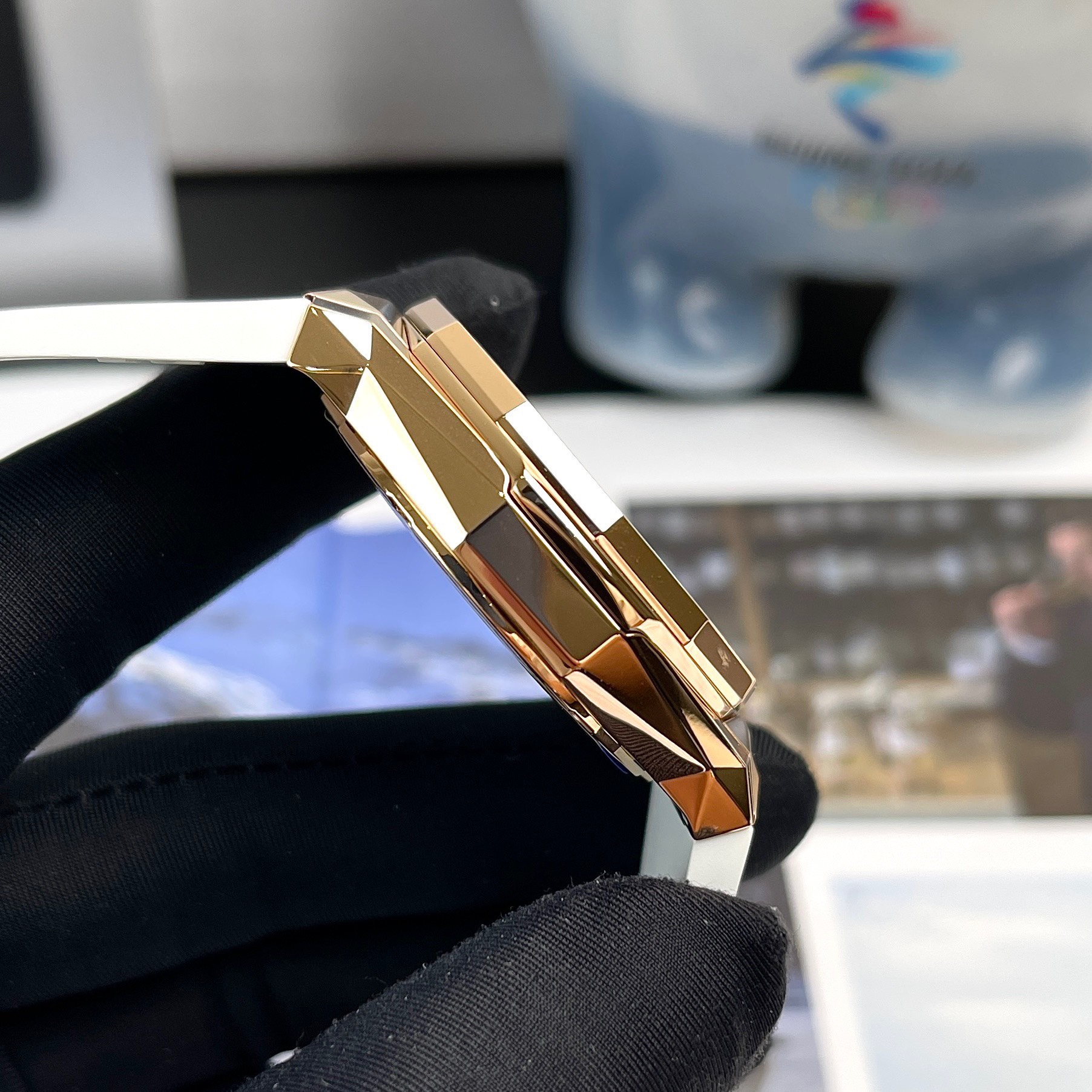 Điểm thu hút chính của chiếc đồng hồ chính là phần mặt số trắng tinh khiết, ẩn sau lớp kính sapphire với thiết kế vát cạnh góc cắt ngẫu nhiên tạo hiệu ứng tán sắc vô cùng đẹp mắt, chia rõ ràng hai tone màu sáng tối rất đặc biệt.
