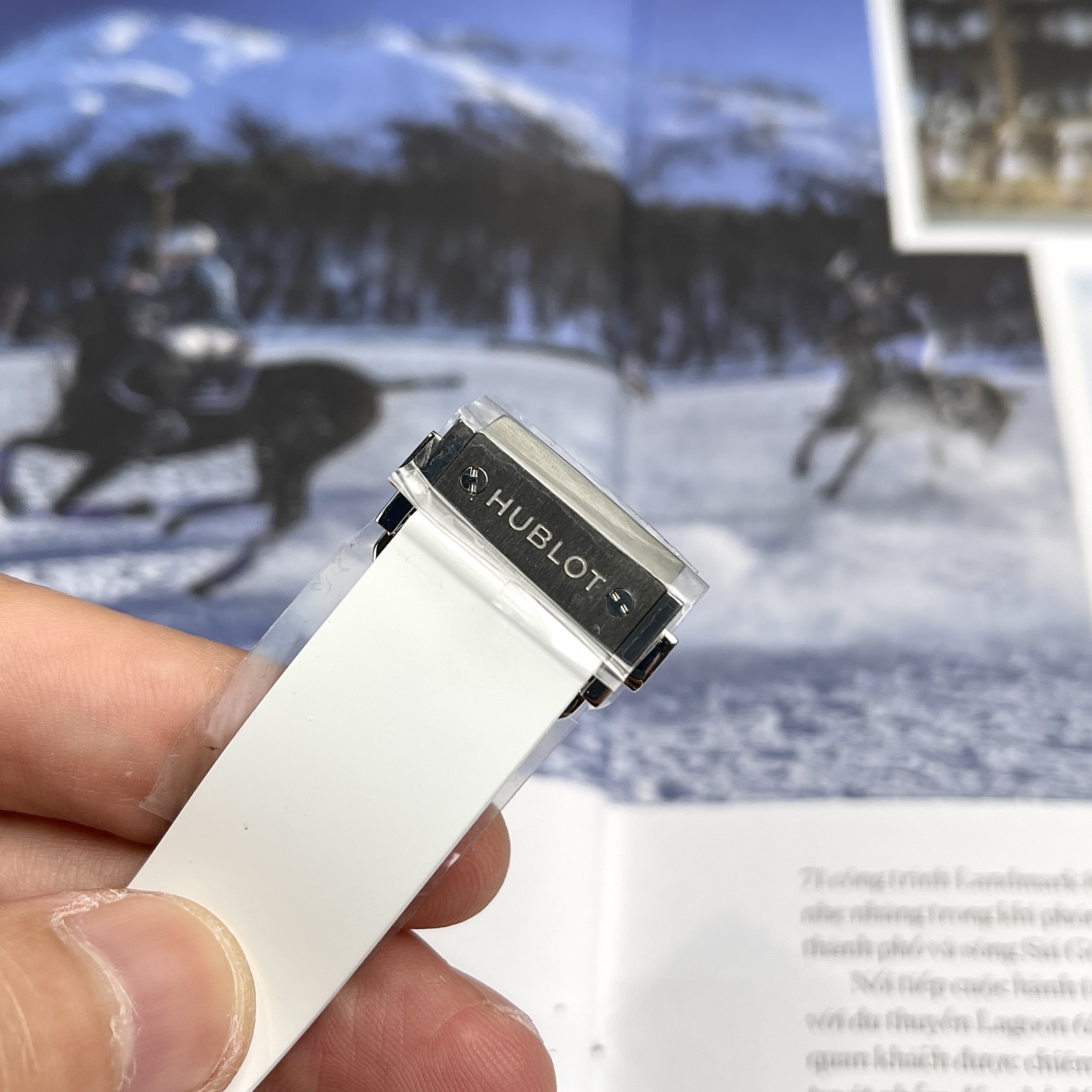 Không chỉ thế tất cả các chi tiết trên bề mặt bộ vỏ đều được đánh bóng tỉ mỉ khiến chiếc đồng hồ Hublot Rep 1:1 vô cùng bóng bẩy. Đi kèm với chiếc đồng hồ, ta có bộ dây cao su đen trơn láng, được cố định bằng khóa gập. Tuy nhiên, chất liệu này được hoàn thiện thêm bằng một lớp mạ đen, đem đến vẻ hiện đại cho thiết kế.