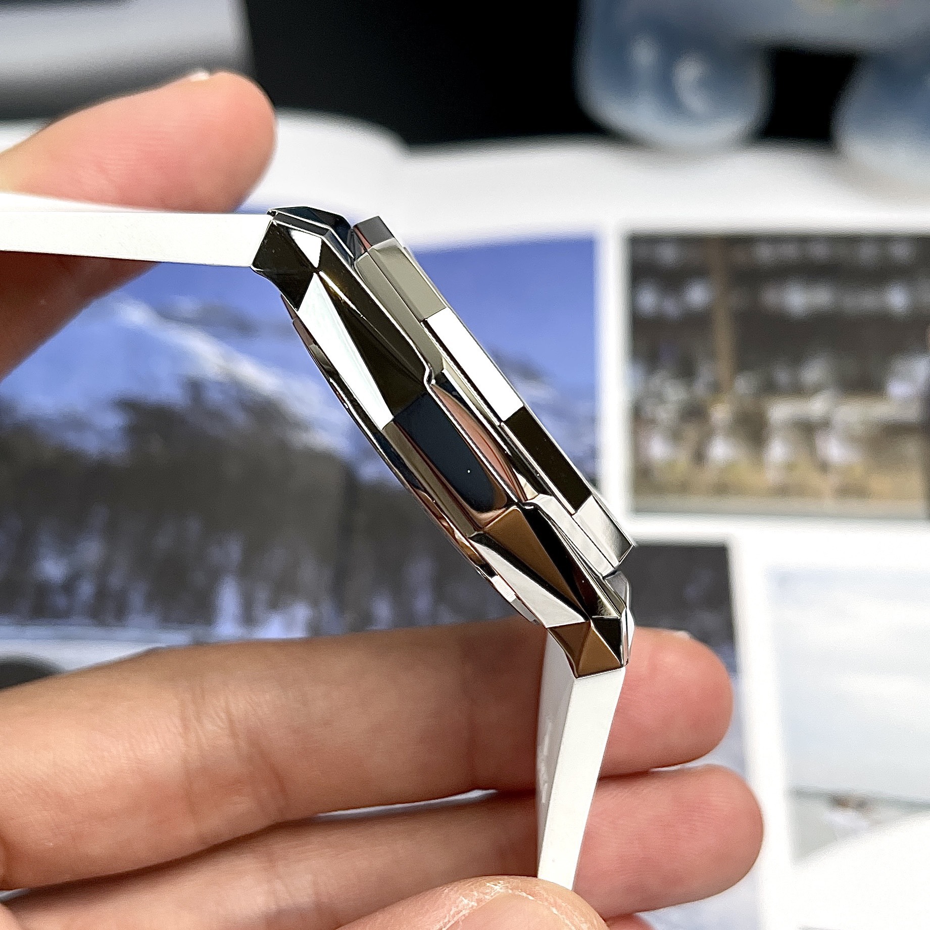 Bộ vỏ khung được thiết kế bằng chất liệu Titanium quen thuộc nhẹ nhàng nhưng rất cứng cáp, vẫn là 6 đinh ốc cố định đều đặn trên vành bezel, nhưng lần này 2 phần giữa tai càng nối dây lại được vát nhọn tạo khối đa giác với những góc nhọn tạo hiệu ứng vô cùng đẹp mắt, để ý kĩ một chút sự đồng đều giữa các góc vát cạnh sẽ khiến bạn phải trầm trồ về sự tinh xảo và độ chính xác của nó.