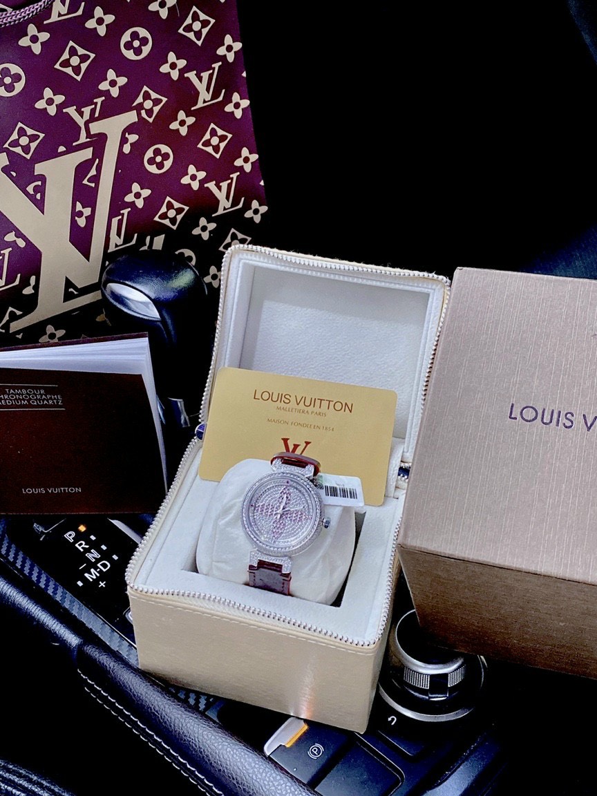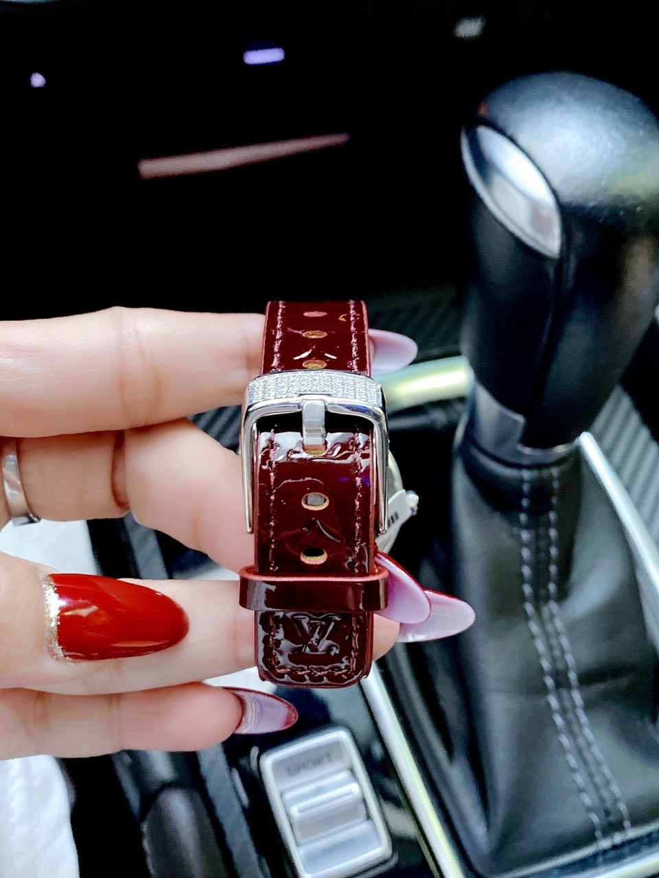 Đồng hồ Louis Vuitton nữ dây da màu đỏ đun LV full Diamond Like Auth 1:1 33mm