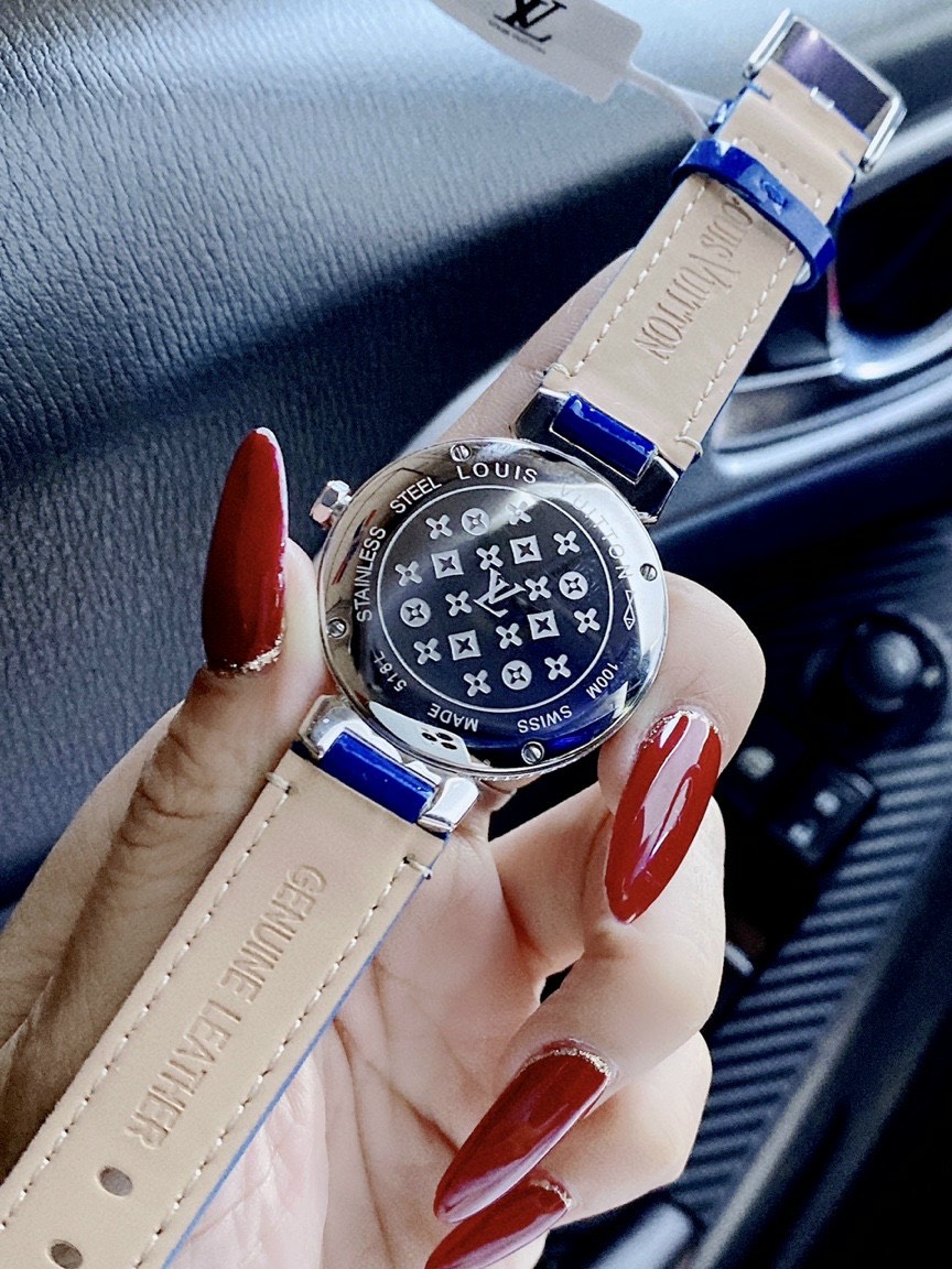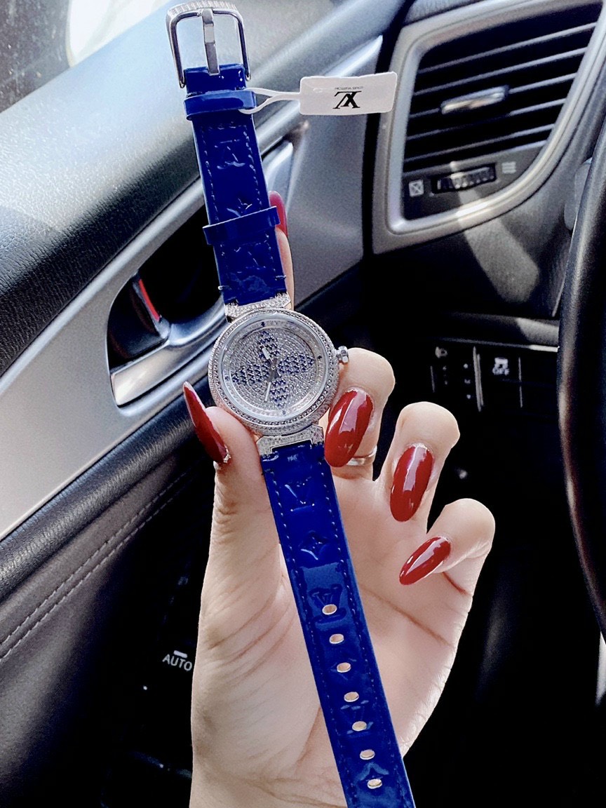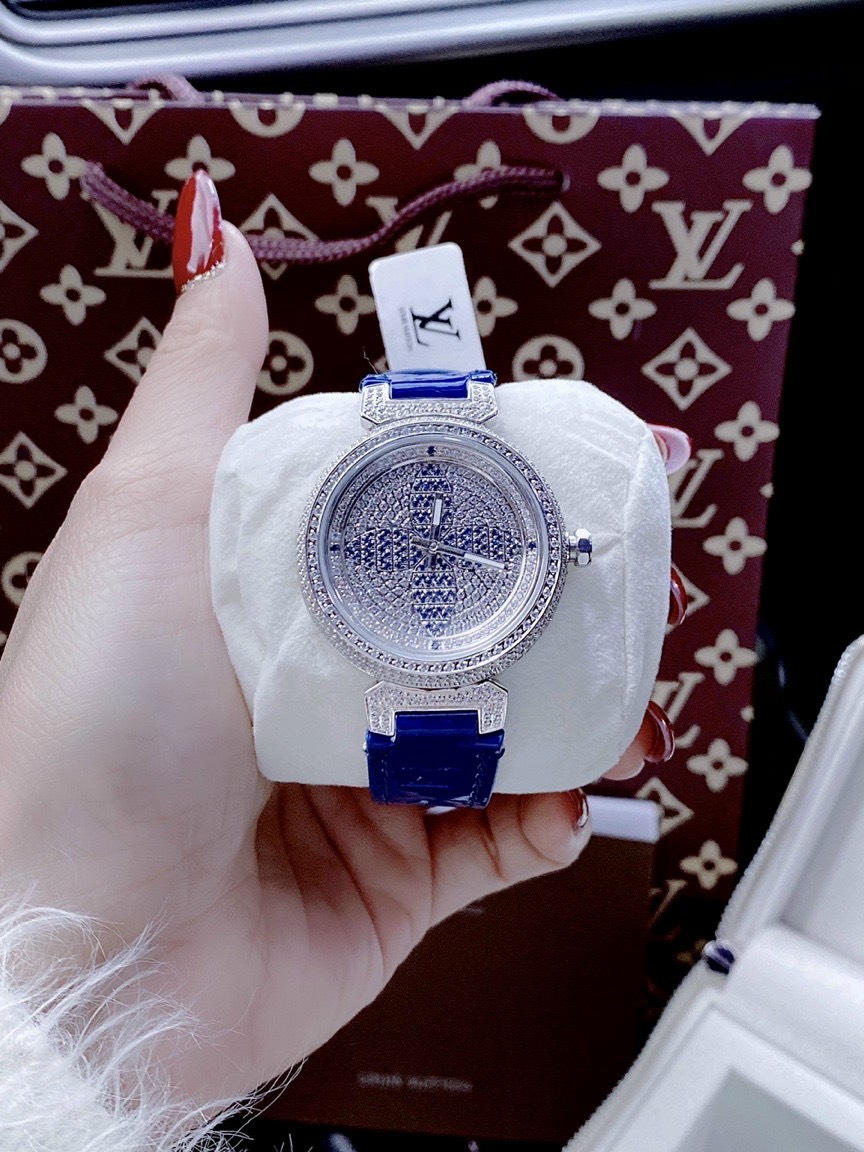 Đồng hồ Louis Vuitton nữ dây da màu xanh dương LV full Diamond Like Auth 1:1 33mm
