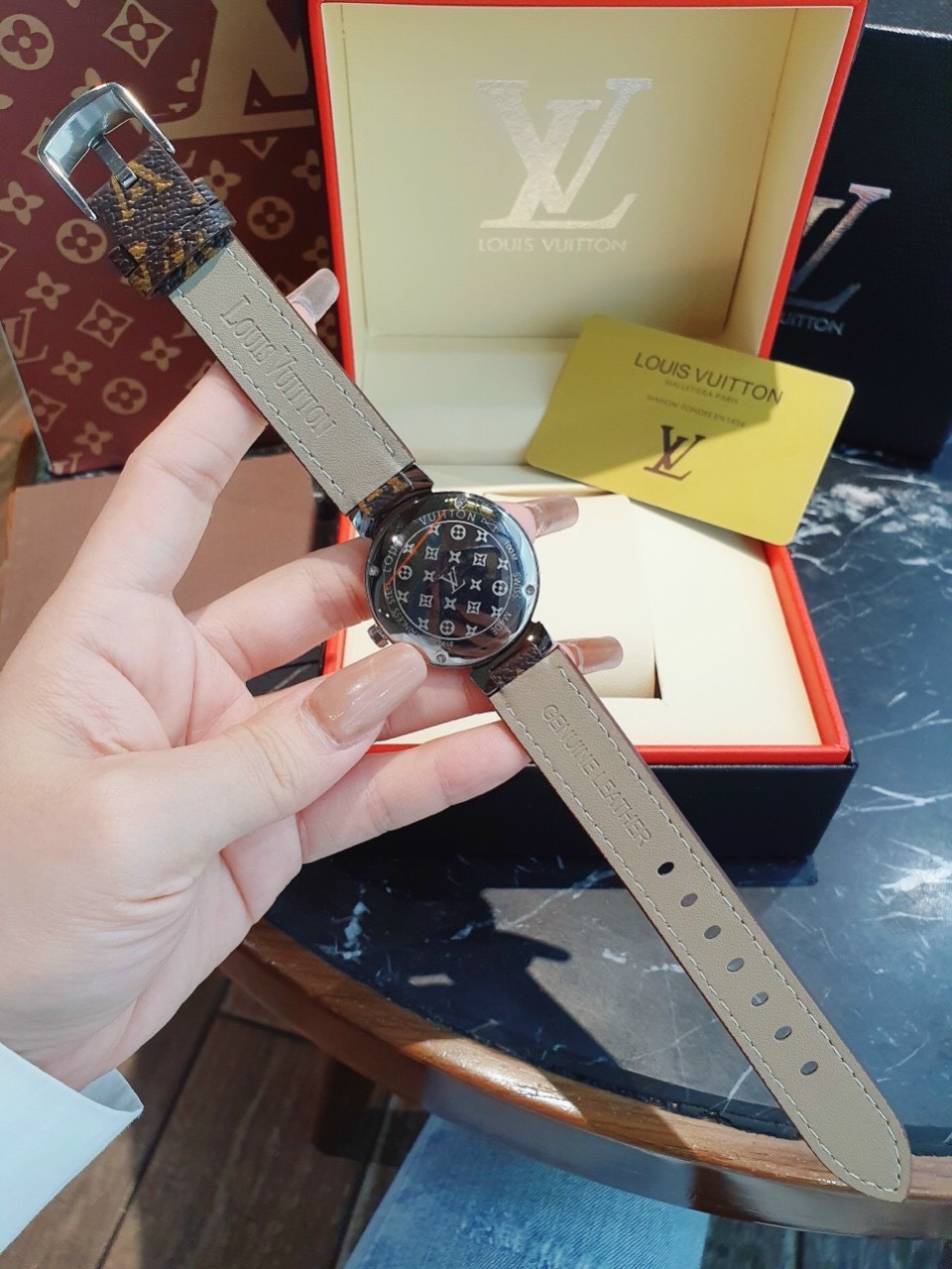 - Đồng hồ Louis Vuitton nữ dây da dập logo LV sang chảnh