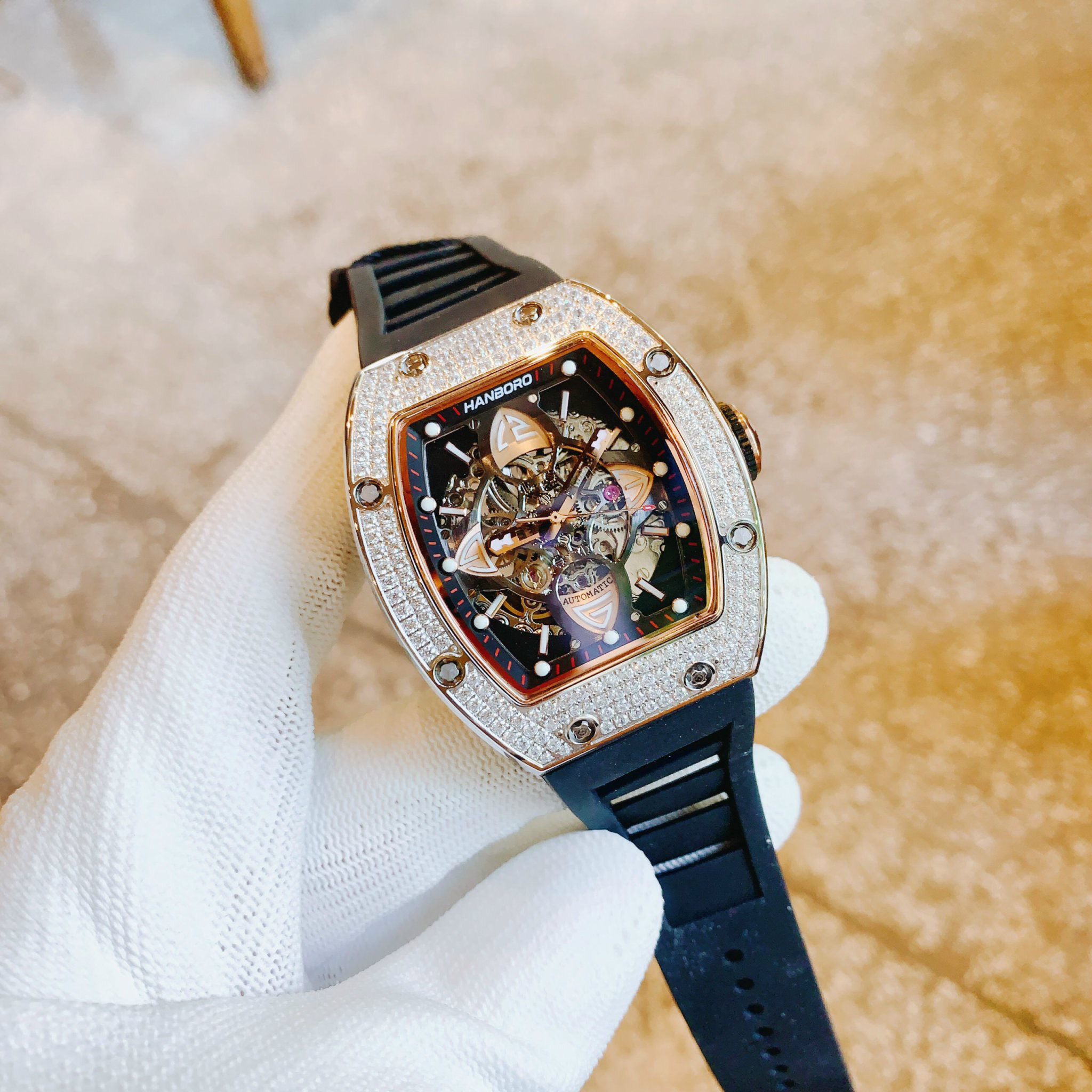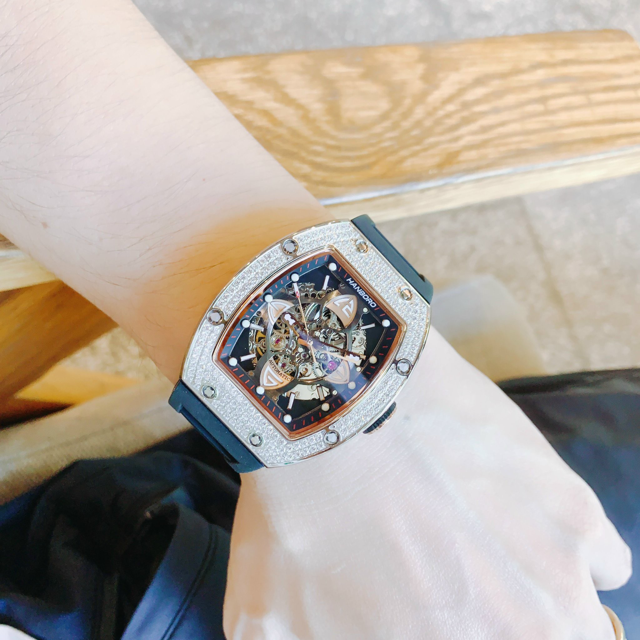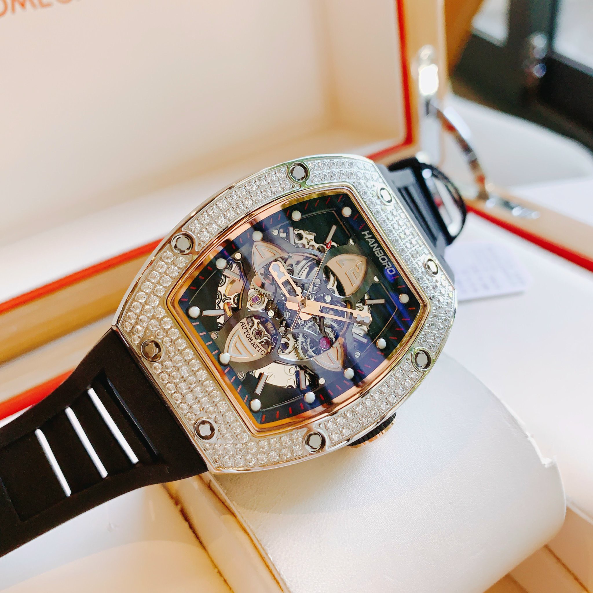 Đồng hồ nam máy cơ Hanboro chính hãng đính đá 40x48mm