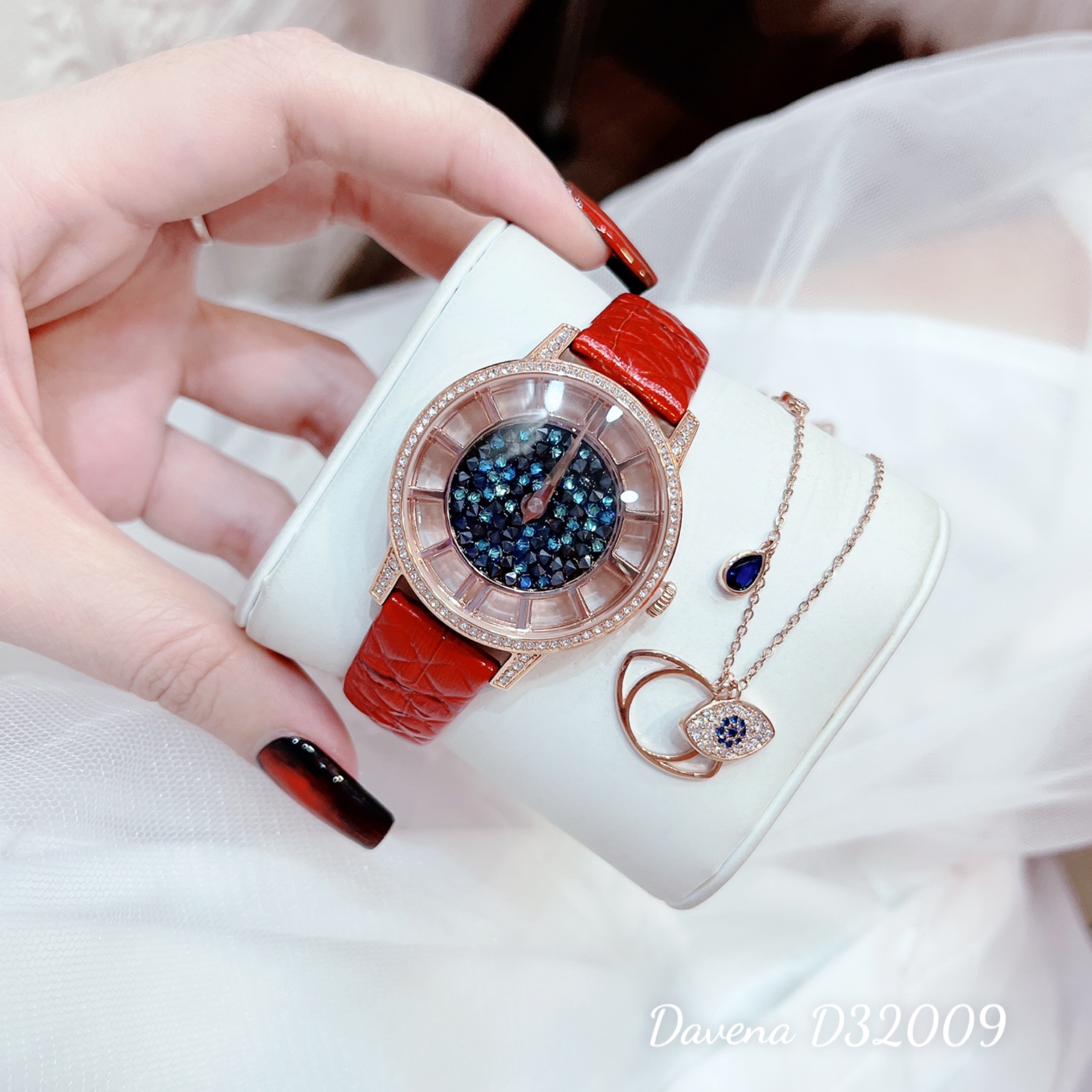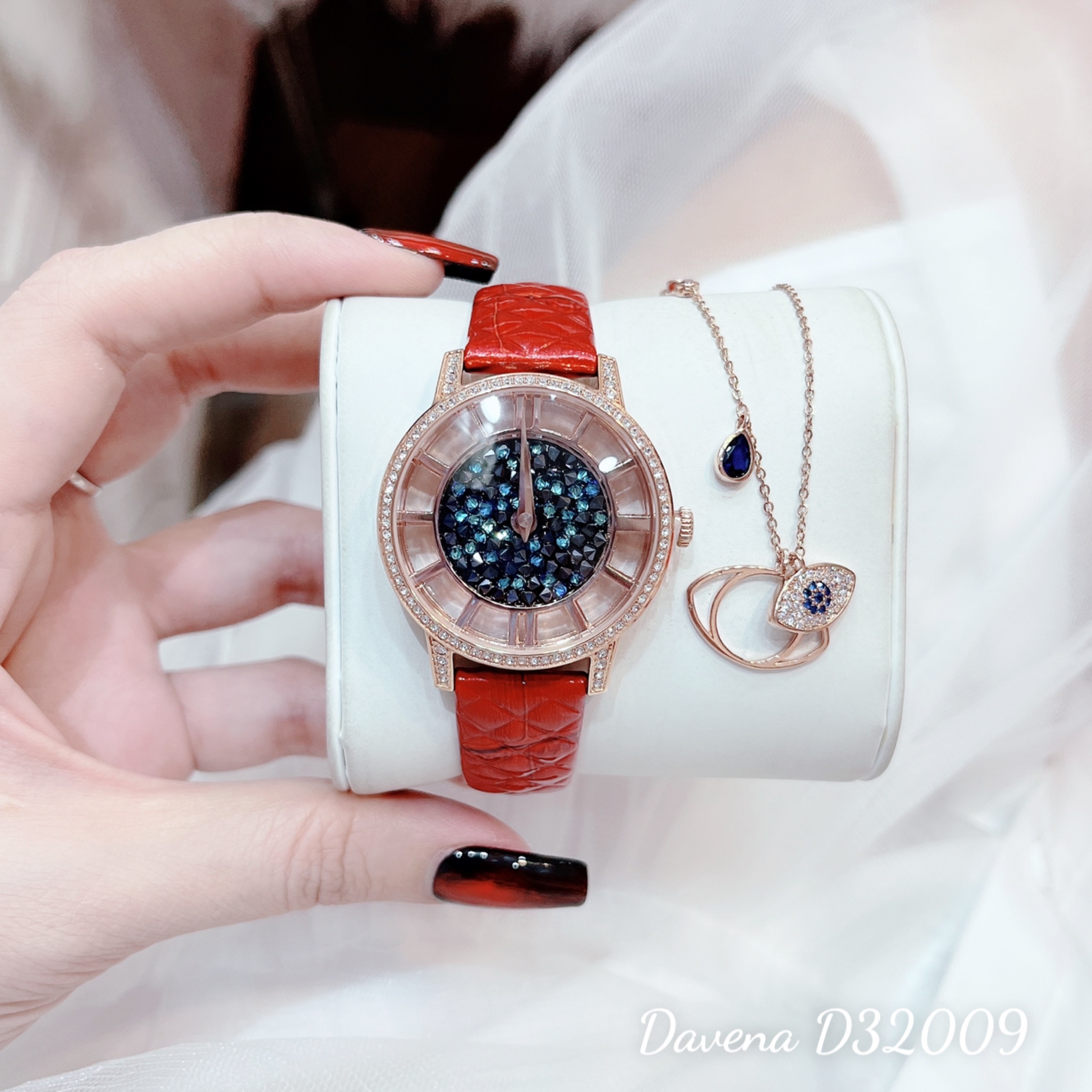 Đồng hồ nữ Davena 32009 dây da đỏ đính đá