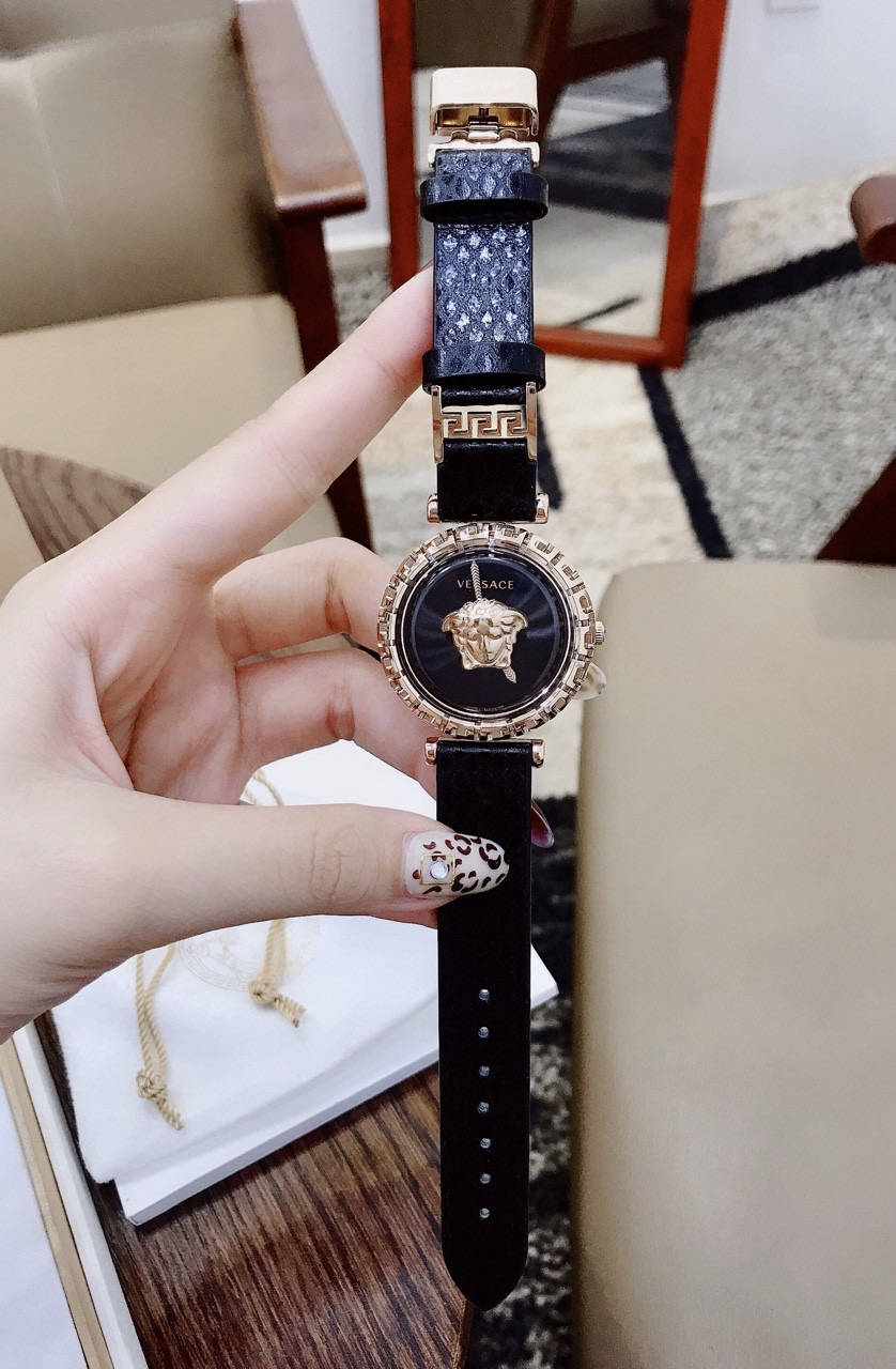 - Mặt đồng hồ nữ đẹp Versace thiết kế siêu độc với hình thần Medusa biểu tượng của Versace ở ngày trung tâm tạo nên mẫu đồng hồ kinh điển.