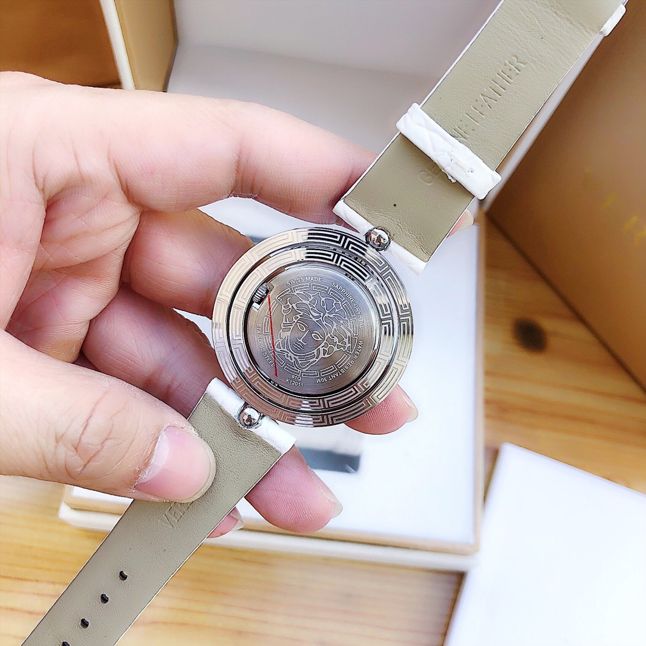 - Đáy đồng hồ khắc logo Medusa tinh tế và sắp nét, sử dụng máy Thụy Sĩ với độ chính xác và bền bỉ cao.