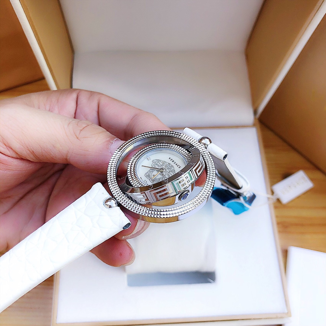- Phần viền mặt đồng hồ đặc biệt và độc đáo nhất với hai vòng xoay 360 độ thay đổi mặt, vòng trong khắc laser chữ Versace.
