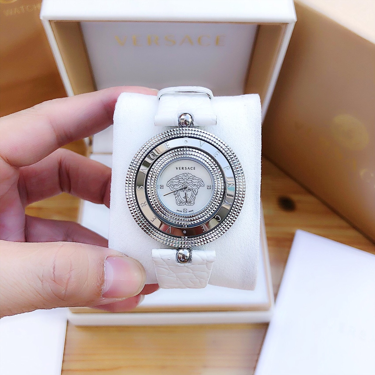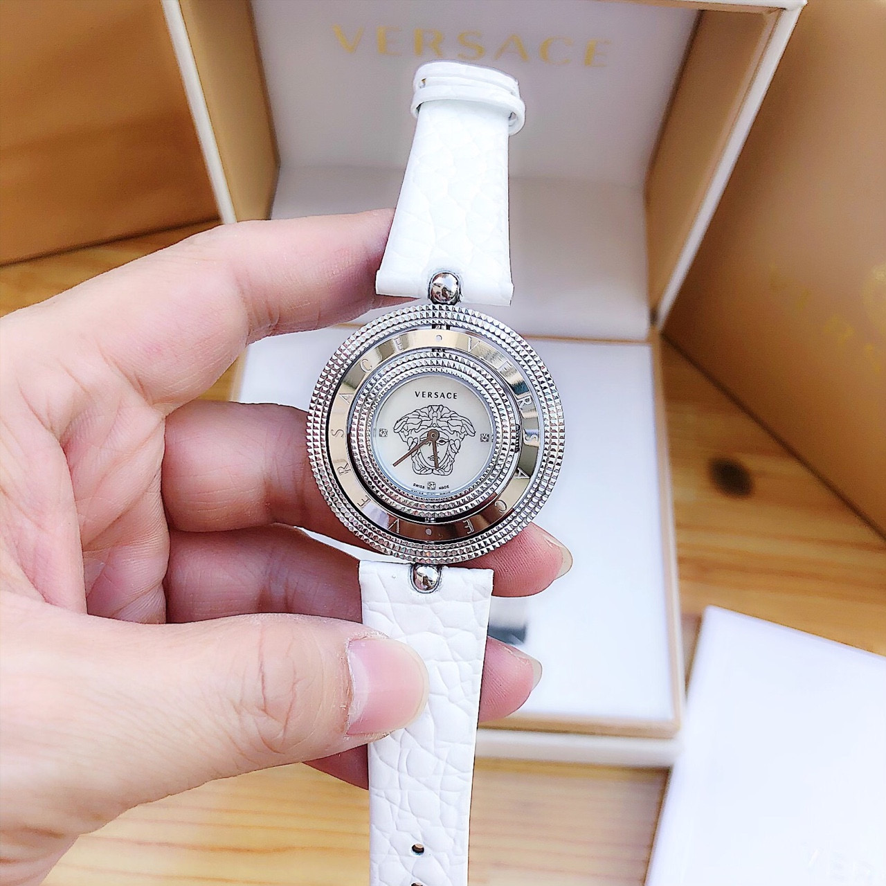 - Mặt đồng hồ được thiết kế nhỏ xinh và đơn giản với logo Medusa – biểu tượng của thương hiệu Versace nằm ngay chính giữa.