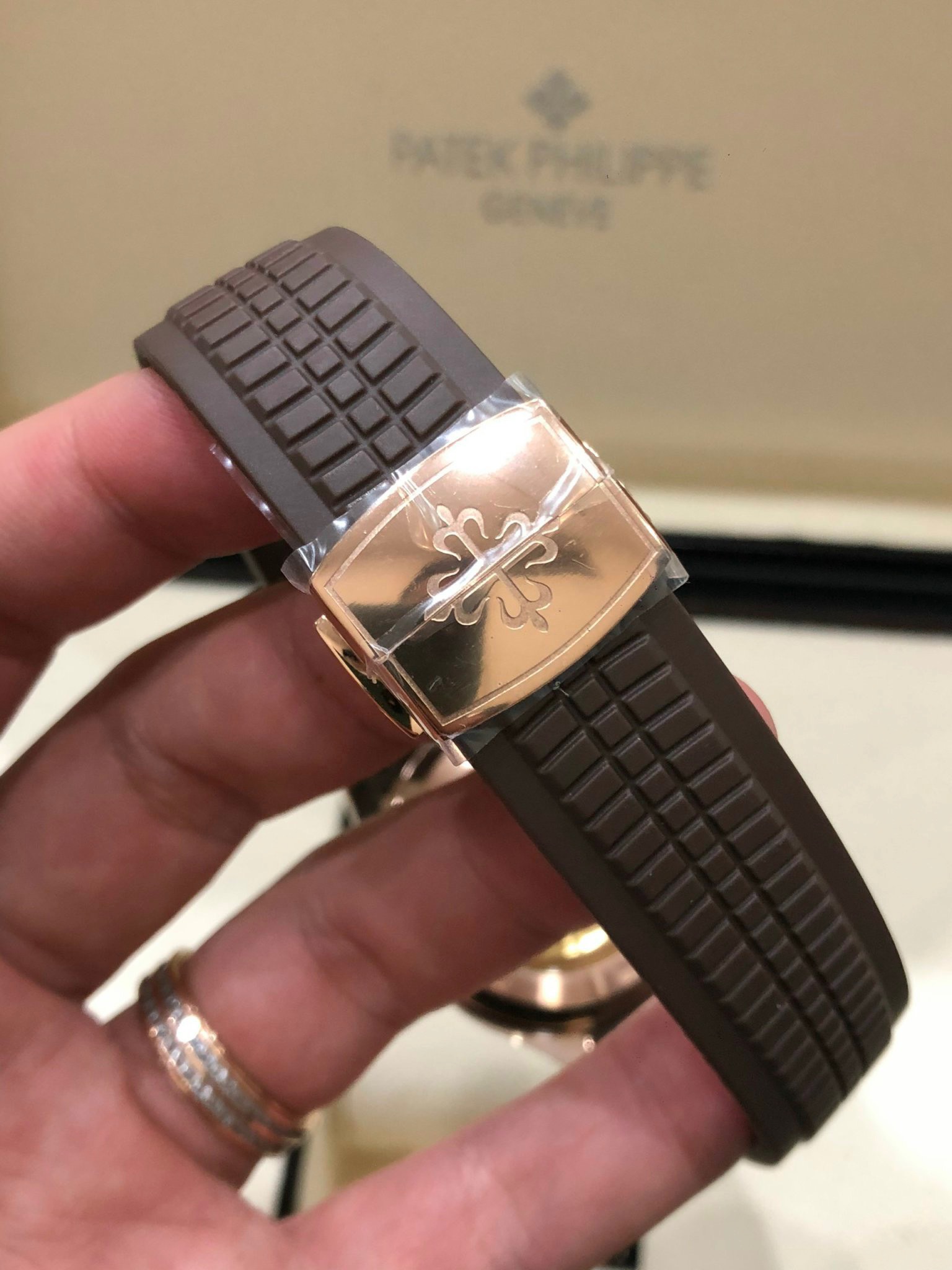 Để cố định bộ dây, Patek Philippe Aquanaut sử dụng cơ chế khóa bướm. Với logo thương hiệu được ghép lại ở chính giữa. Nếu người dùng có cổ tay nhỏ, có thể cắt bớt phần dây cao su thừa sao cho phù hợp. Tuy nhiên, thao tác này chỉ được thực hiện một chiều. Và nếu sau này bạn muốn bán lại chiếc đồng hồ cho người có cổ tay lớn hơn thì chỉ có một cách duy nhất: mua bộ dây mới.