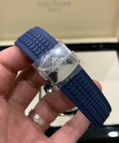 Để cố định bộ dây, Patek Philippe Aquanaut sử dụng cơ chế khóa bướm. Với logo thương hiệu được ghép lại ở chính giữa. Nếu người dùng có cổ tay nhỏ, có thể cắt bớt phần dây cao su thừa sao cho phù hợp. Tuy nhiên, thao tác này chỉ được thực hiện một chiều. Và nếu sau này bạn muốn bán lại chiếc đồng hồ cho người có cổ tay lớn hơn thì chỉ có một cách duy nhất: mua bộ dây mới.