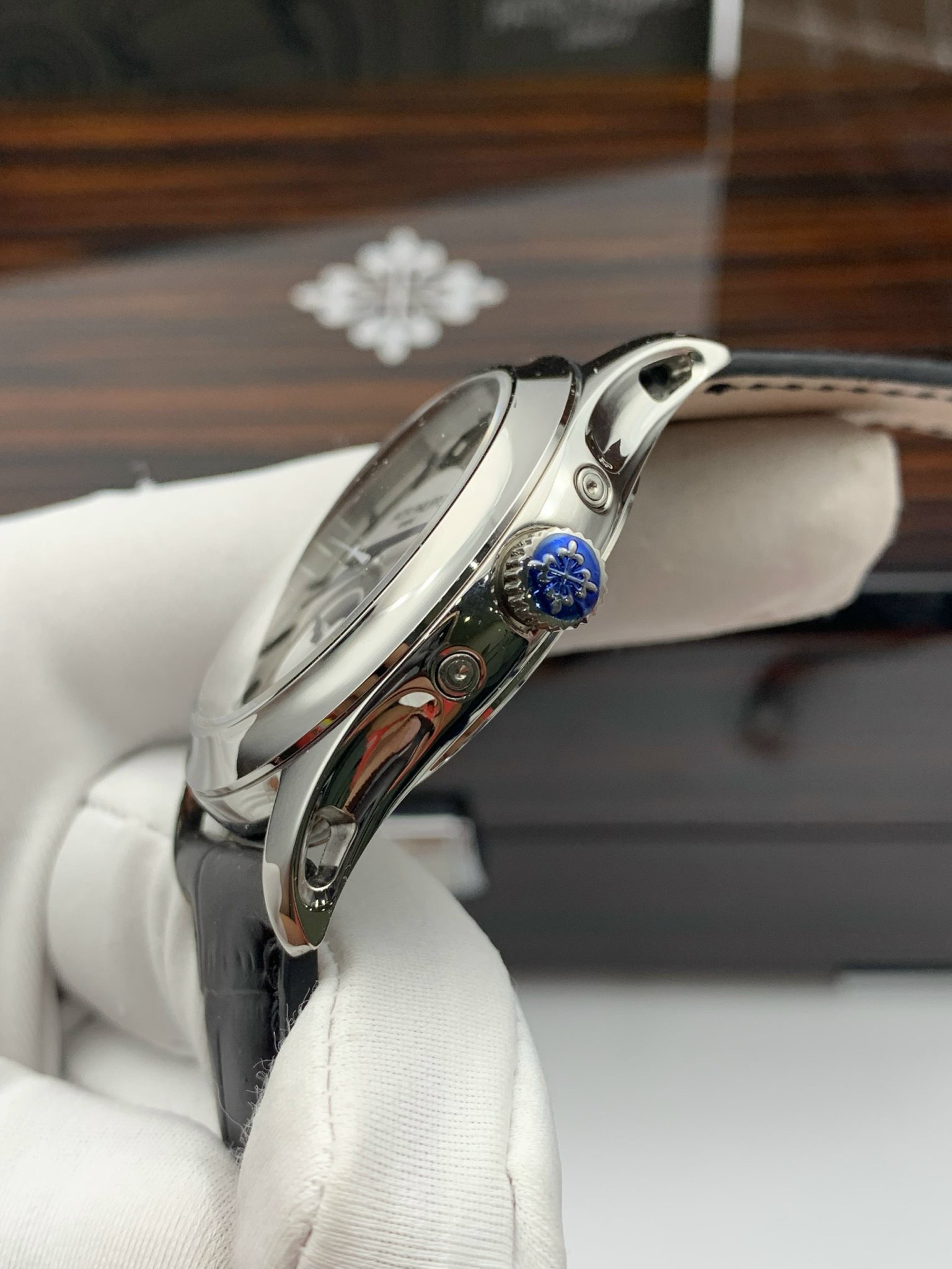 Hoàn thiện cho vẻ đẹp của chiếc Patek Philippe Chuẩn 1:1 là dây đeo da cá sấu màu đen tuyền tự nhiên, được khâu tay từng đường kim mũi chỉ. Kết thúc dây đeo là khóa cài cổ điển mang lại sự thoải mái khi đeo và dễ dàng sử dụng.