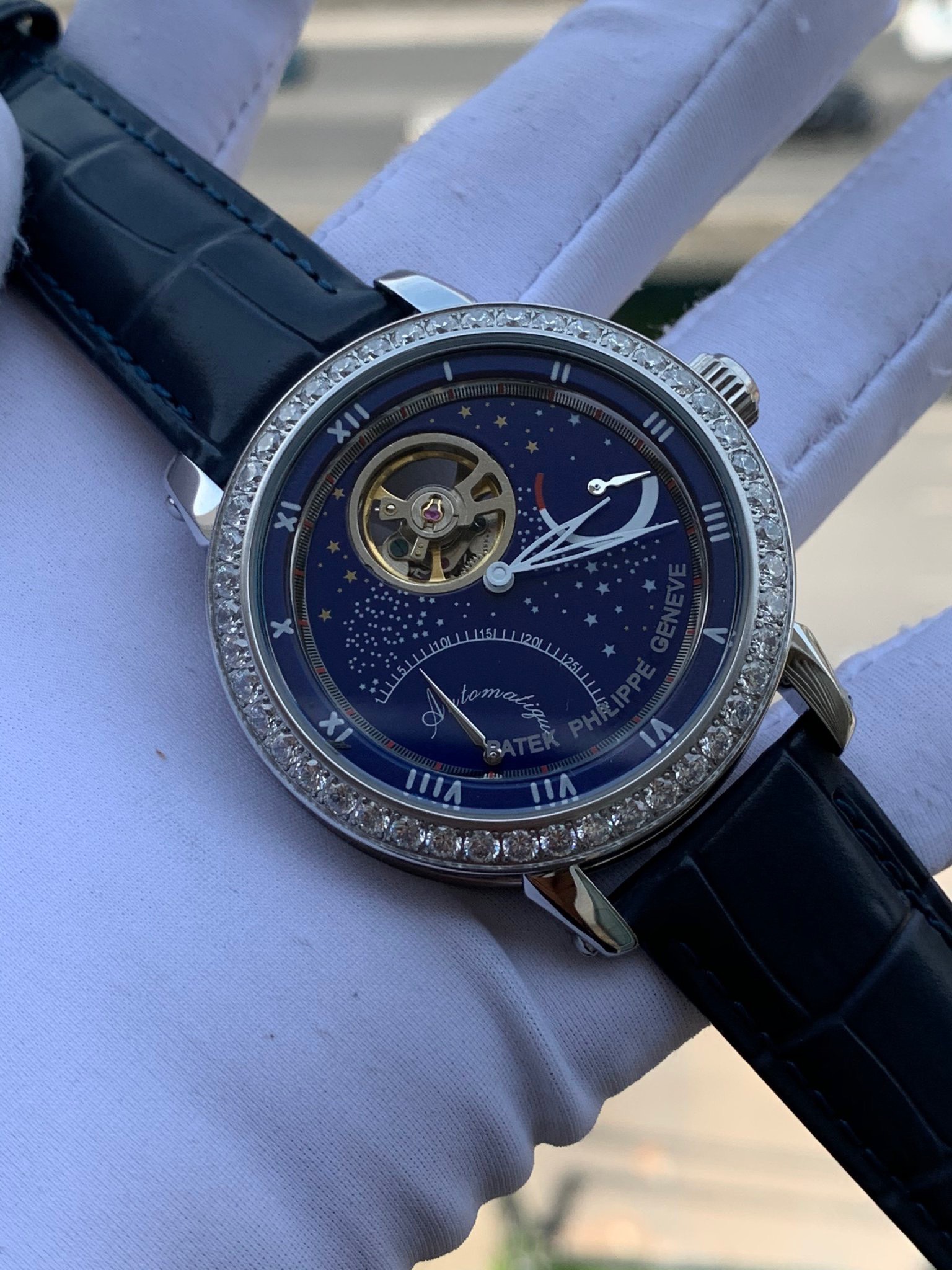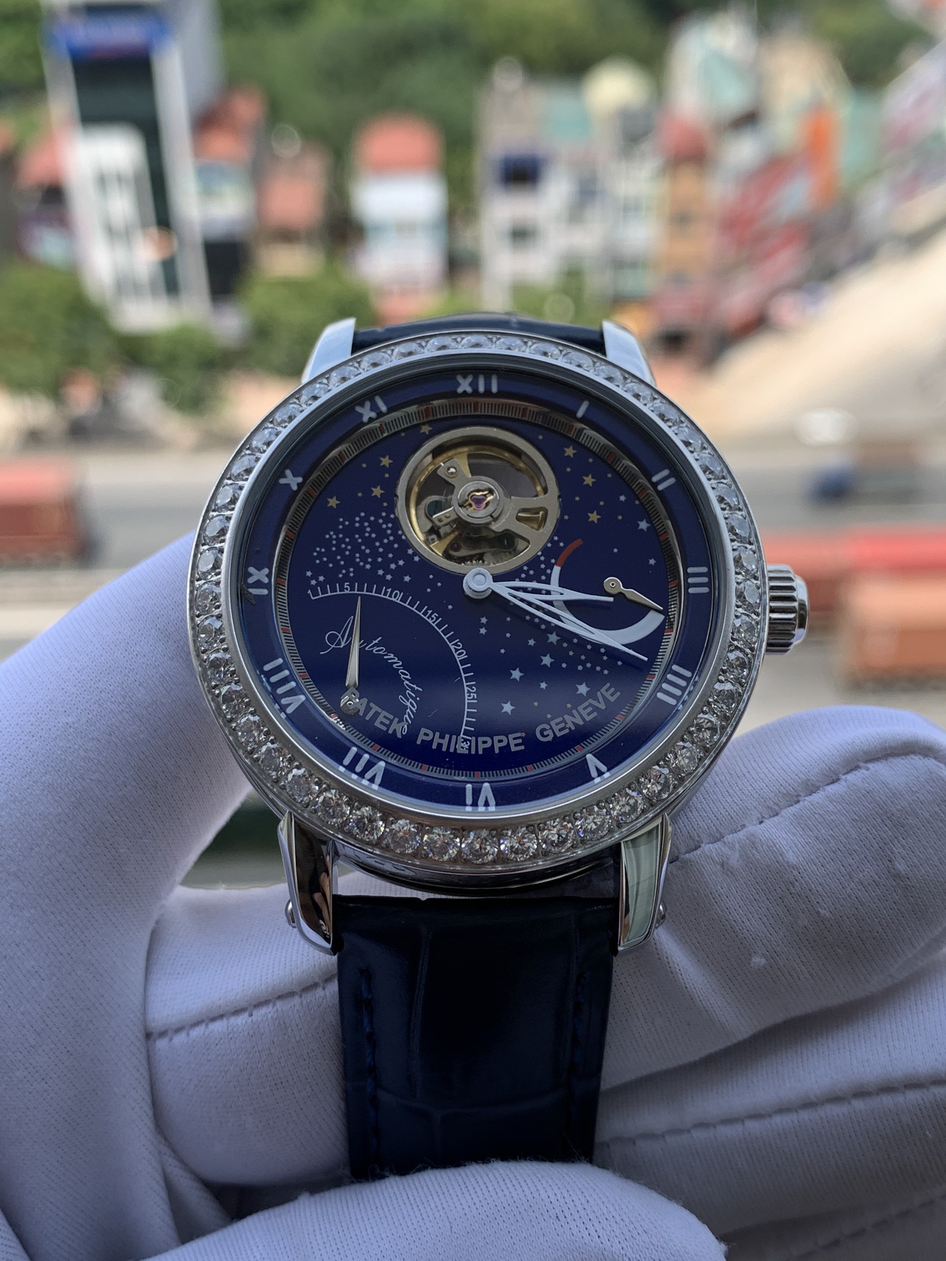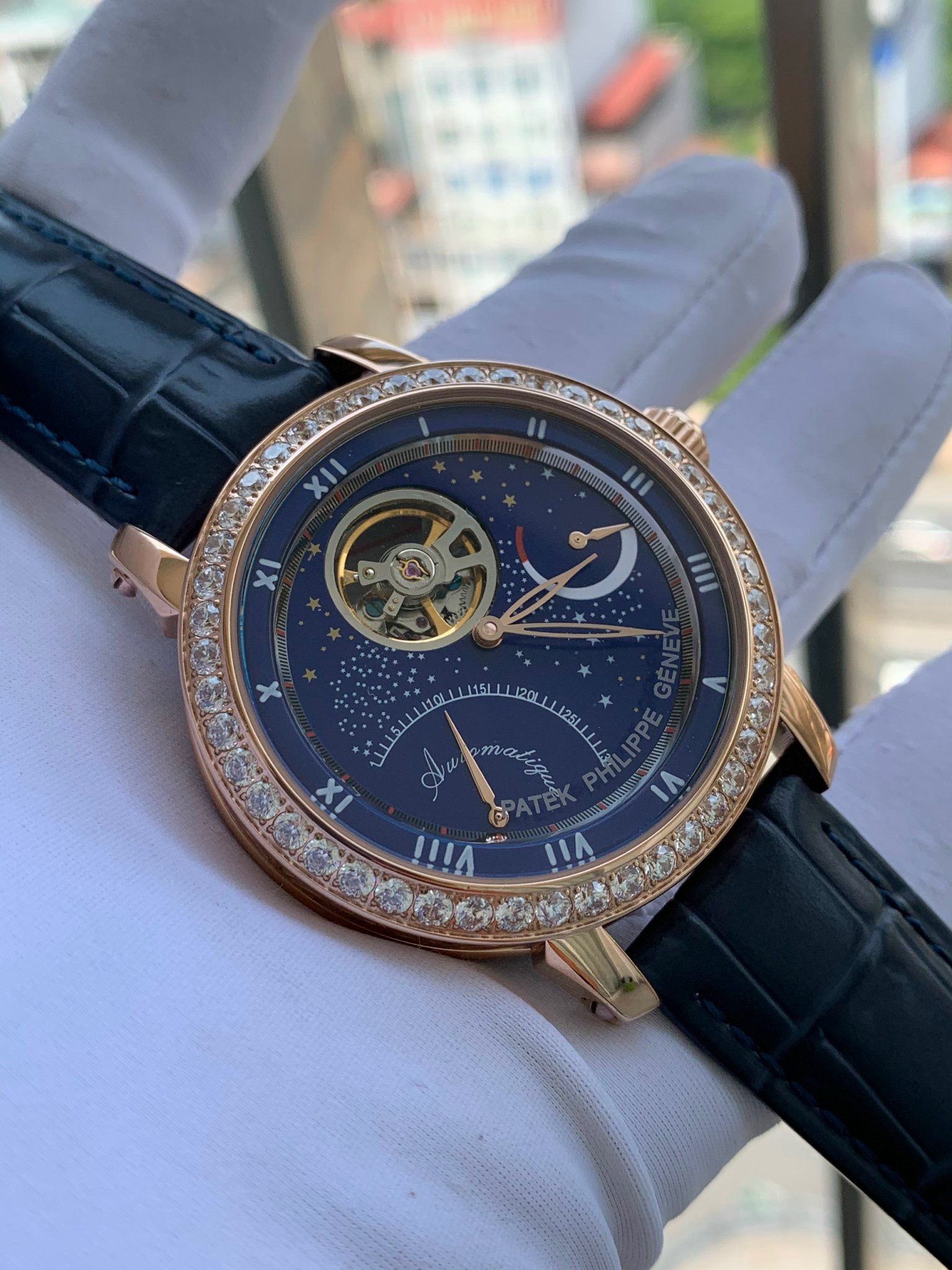 - Mặt đồng hồ Patek Philippe cơ lộ máy góc 12h cực chất