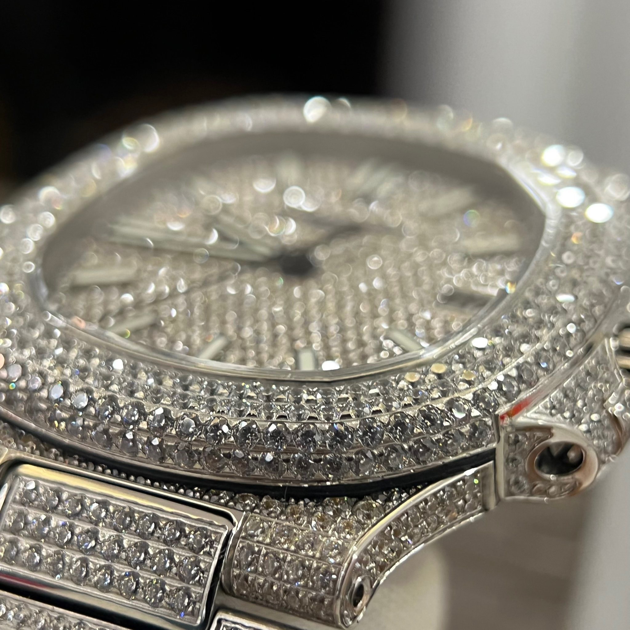 Theo như chúng ta đang thấy ở đây. Toàn bộ chiếc đồng hồ này được đính toàn bộ 100% bằng kim cương nhân tạo rất là đẹp và sáng. Những viên kim cương được gắn chấu 4 cạnh rất chắc chắn. Với độ bắt sáng ở mức cao mang lại cho chiếc đồng hồ sự lấp lánh, sang trọng. Đó chính là đặc điểm nổi bật nhất của kim cương nhân tạo Mozambique so với các kim cương thông thường. Không chỉ có phần vỏ case mà cả mặt dial hay toàn bộ phần dây đều được đính full kim cương. Nếu bạn đeo chiếc đồng hồ trên tay DWatch xin đảm bảo rằng : Bạn sẽ luôn là tâm điểm chú ý và sự ngưỡng mộ của mọi người.!