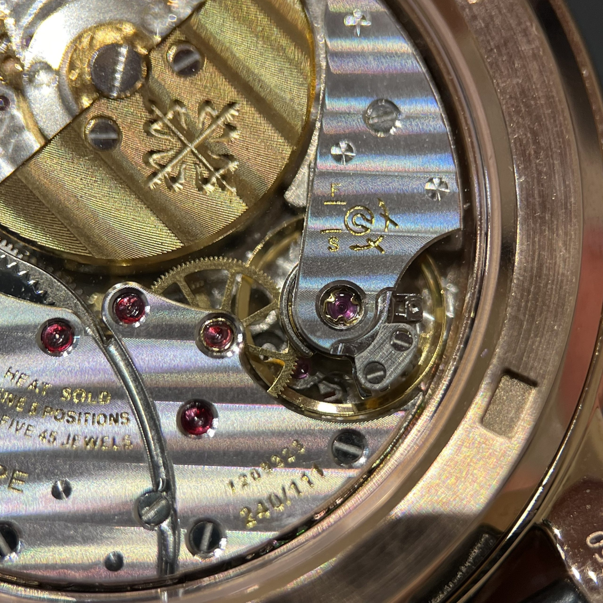 - Đáy đồng hồ cơ Patek Philippe lộ bộ máy cơ tự động Thụy Sỹ hoạt động nhịp nhàng