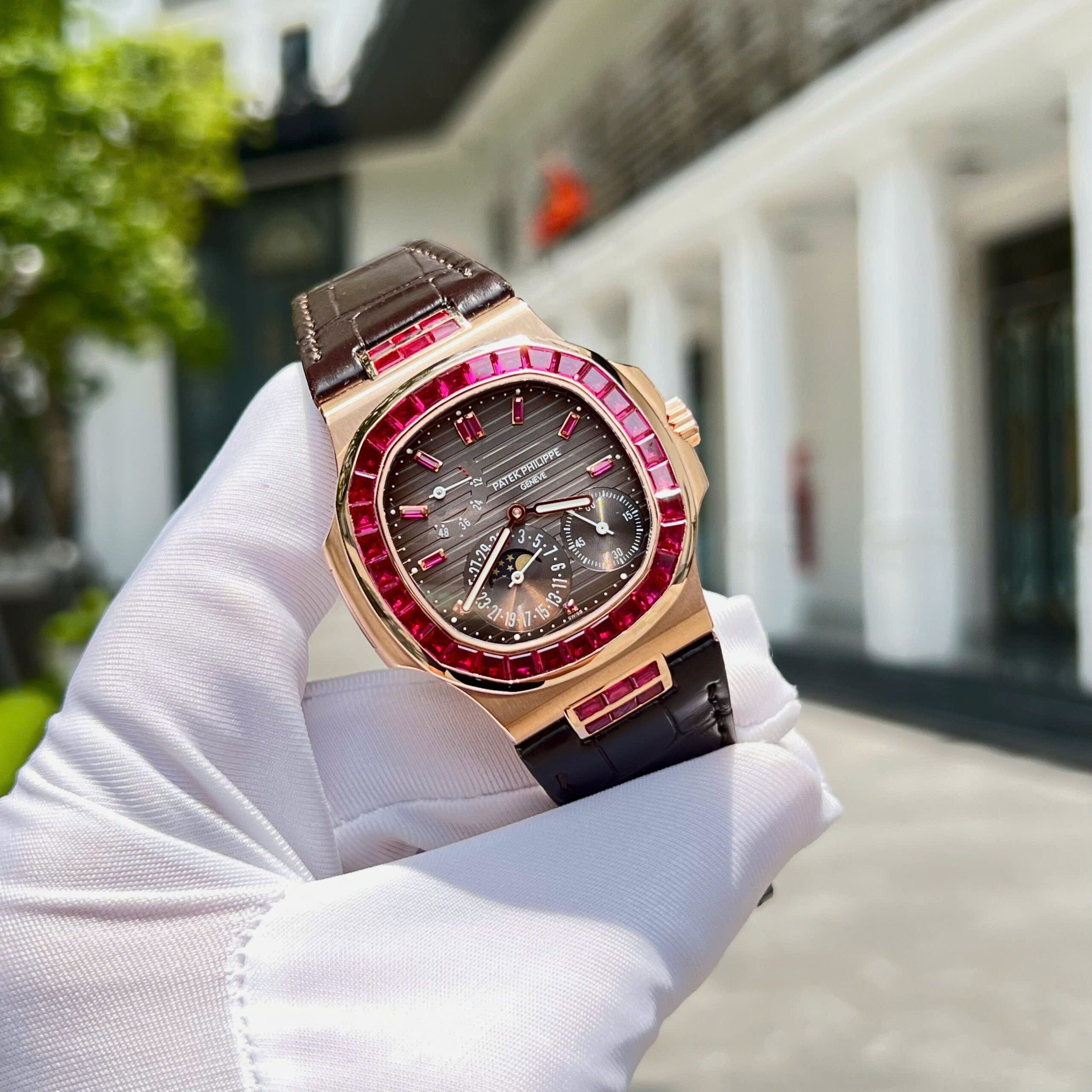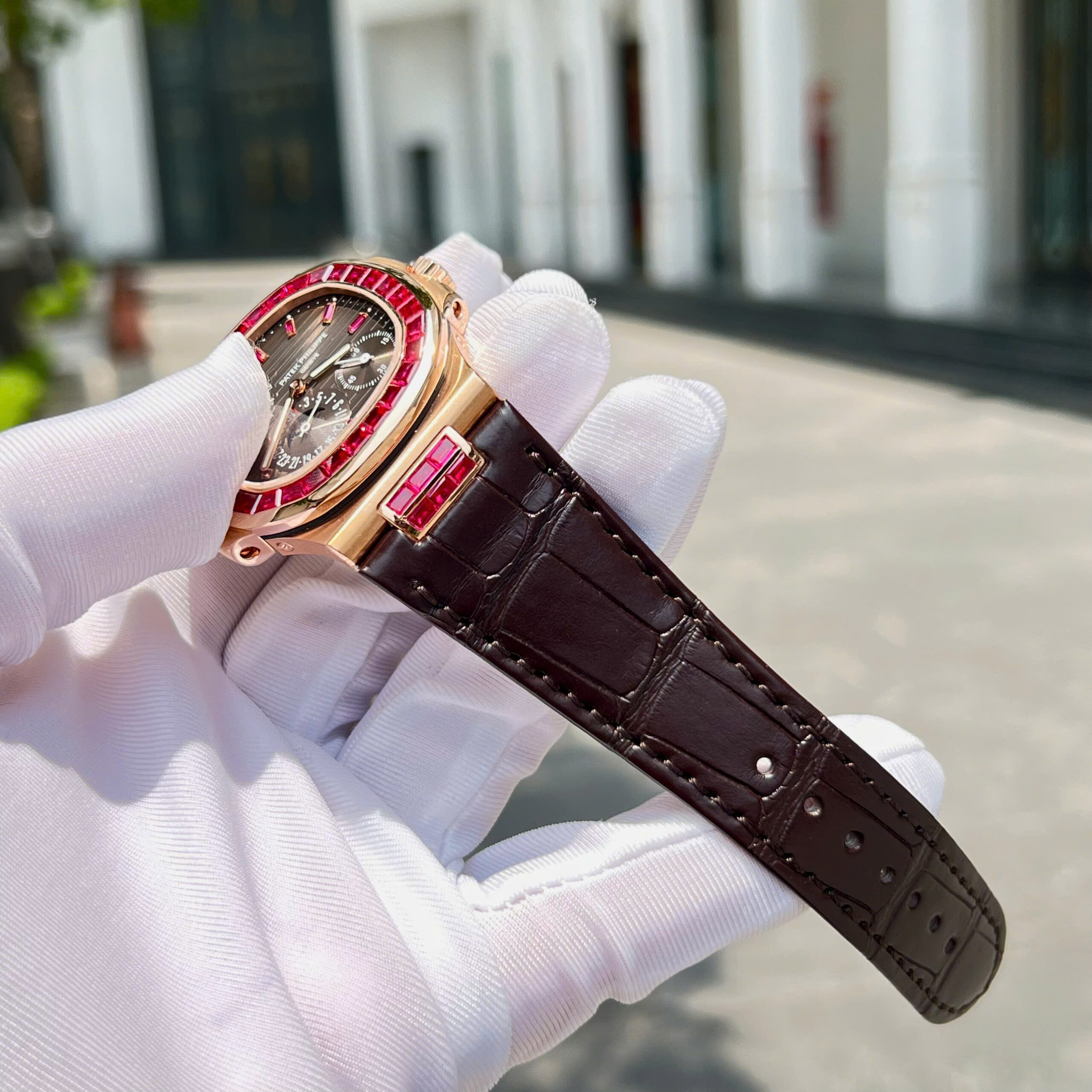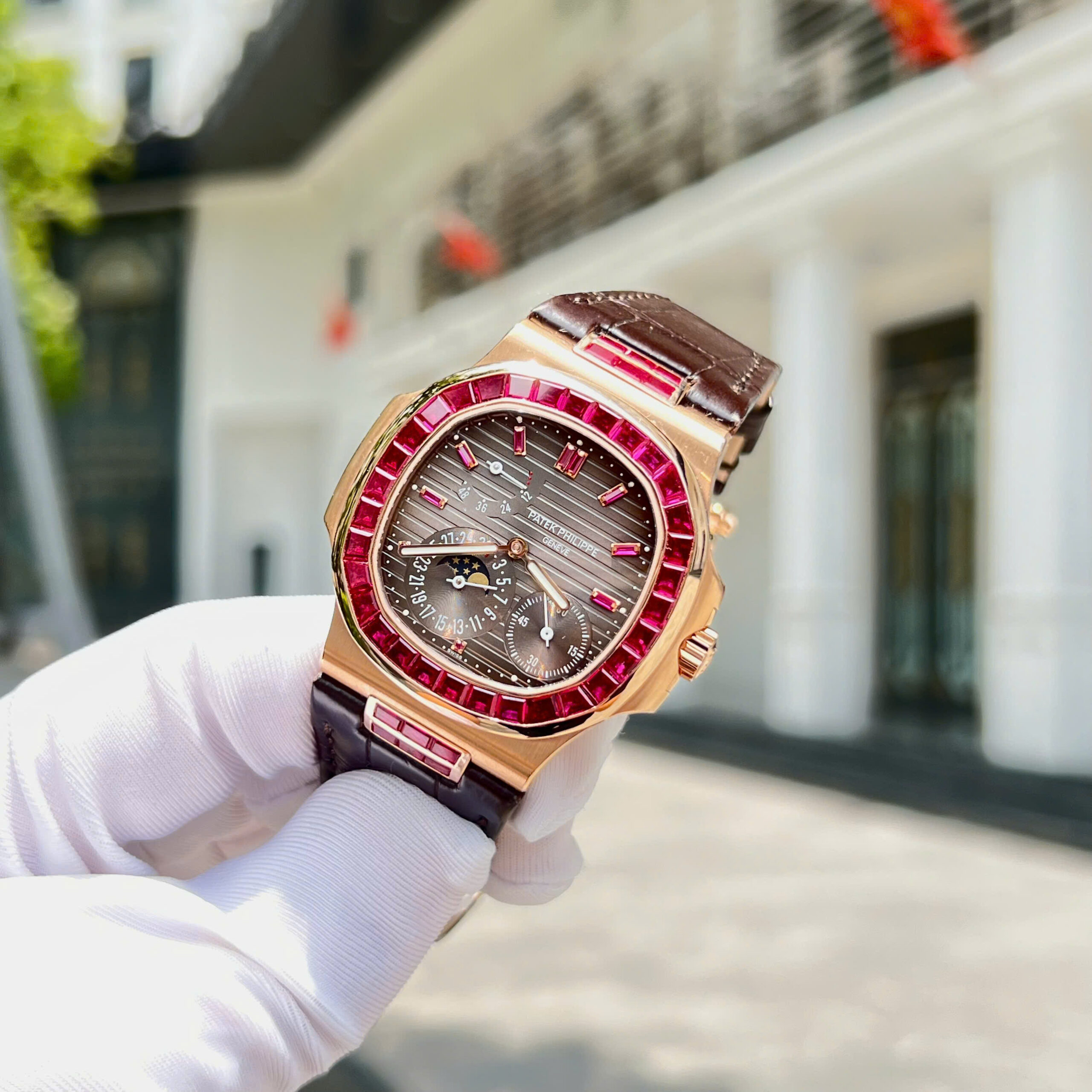 Đồng hồ Patek Philippe Nautilus 5724 Replica 11 bọc vàng thật 18K + đính ruby baguette đỏ 40mm