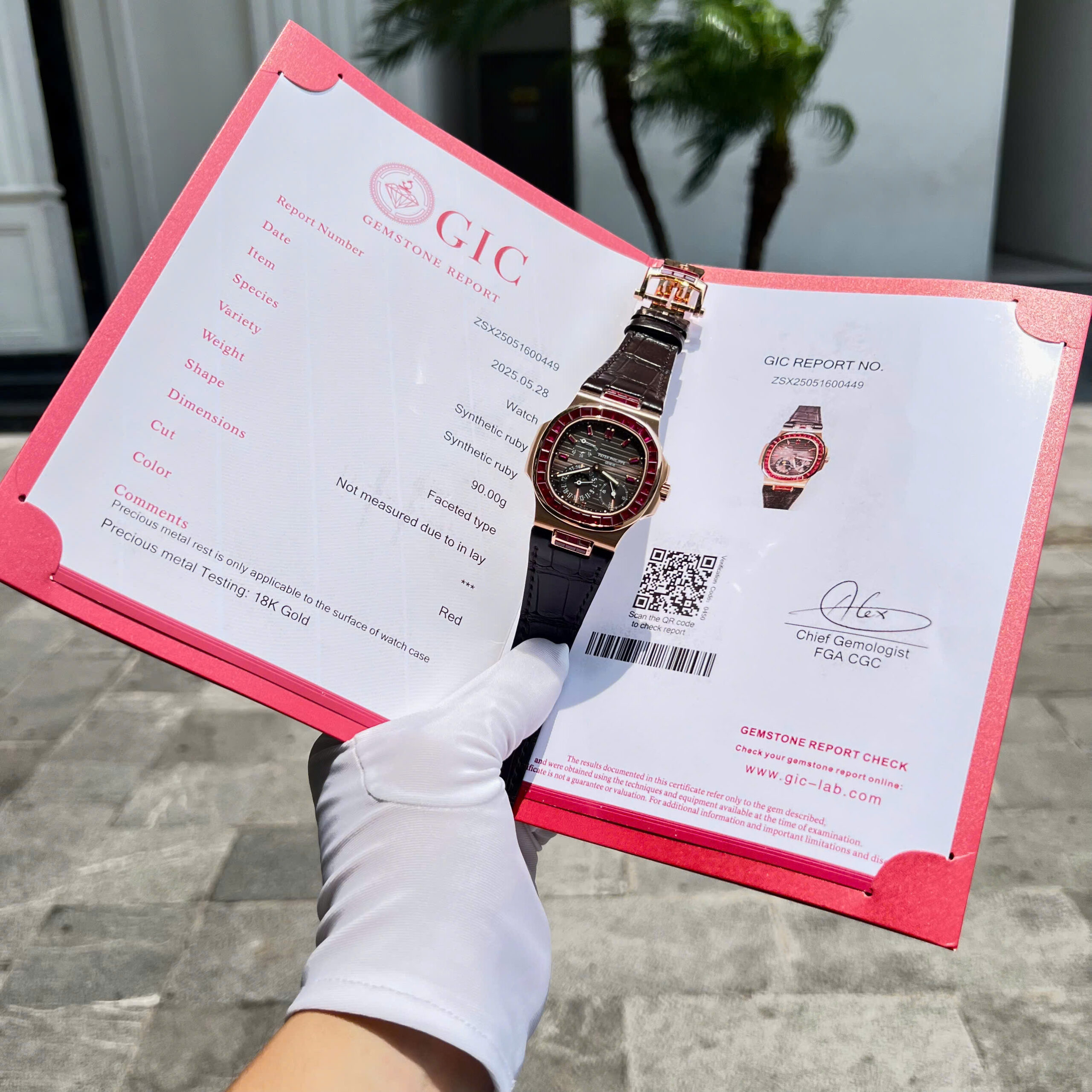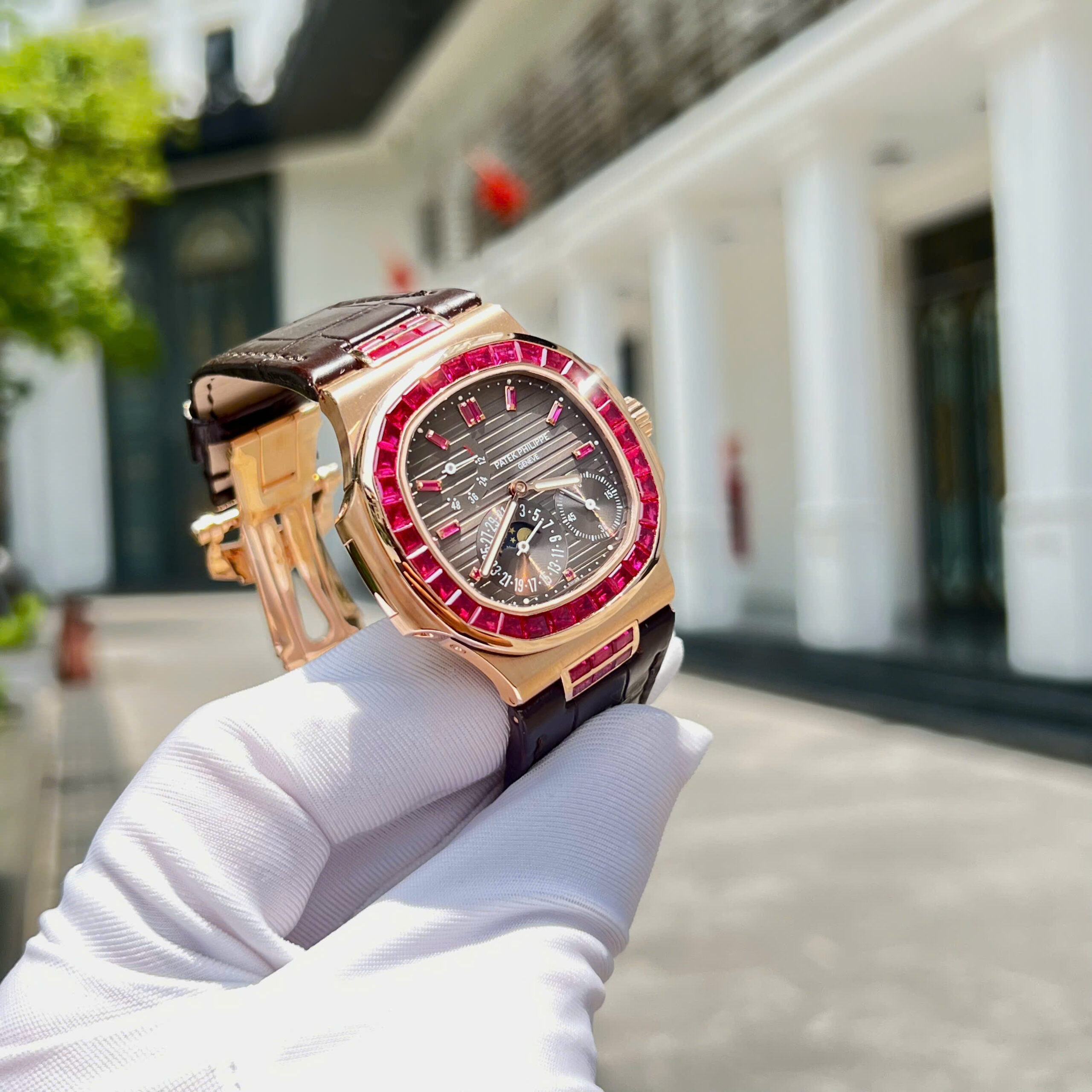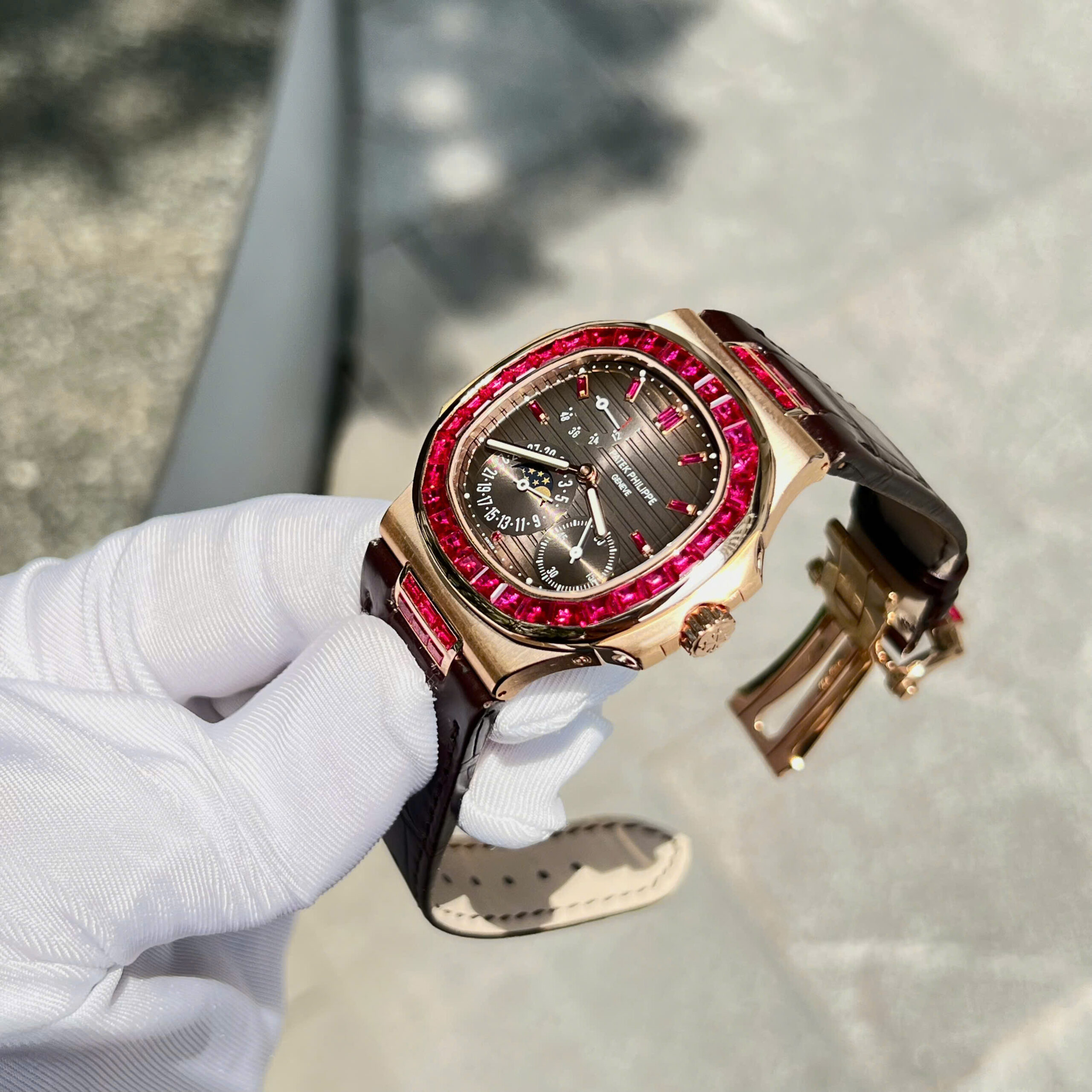 Đồng hồ Patek Philippe Nautilus 5724 Replica 11 bọc vàng thật 18K + đính ruby baguette đỏ 40mm