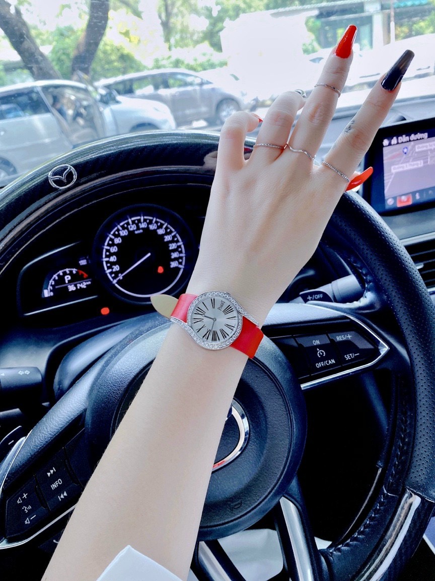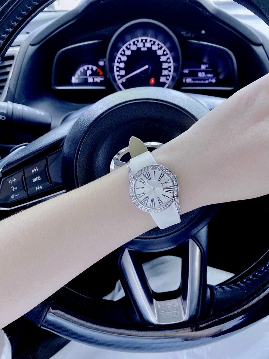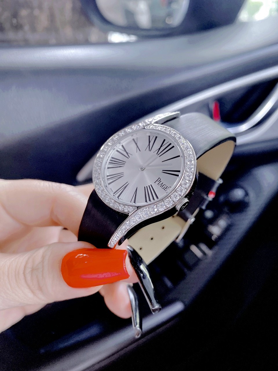 Đồng hồ Piaget nữ mặt tròn đính đá dây da lụa satin 3 màu 32mm
