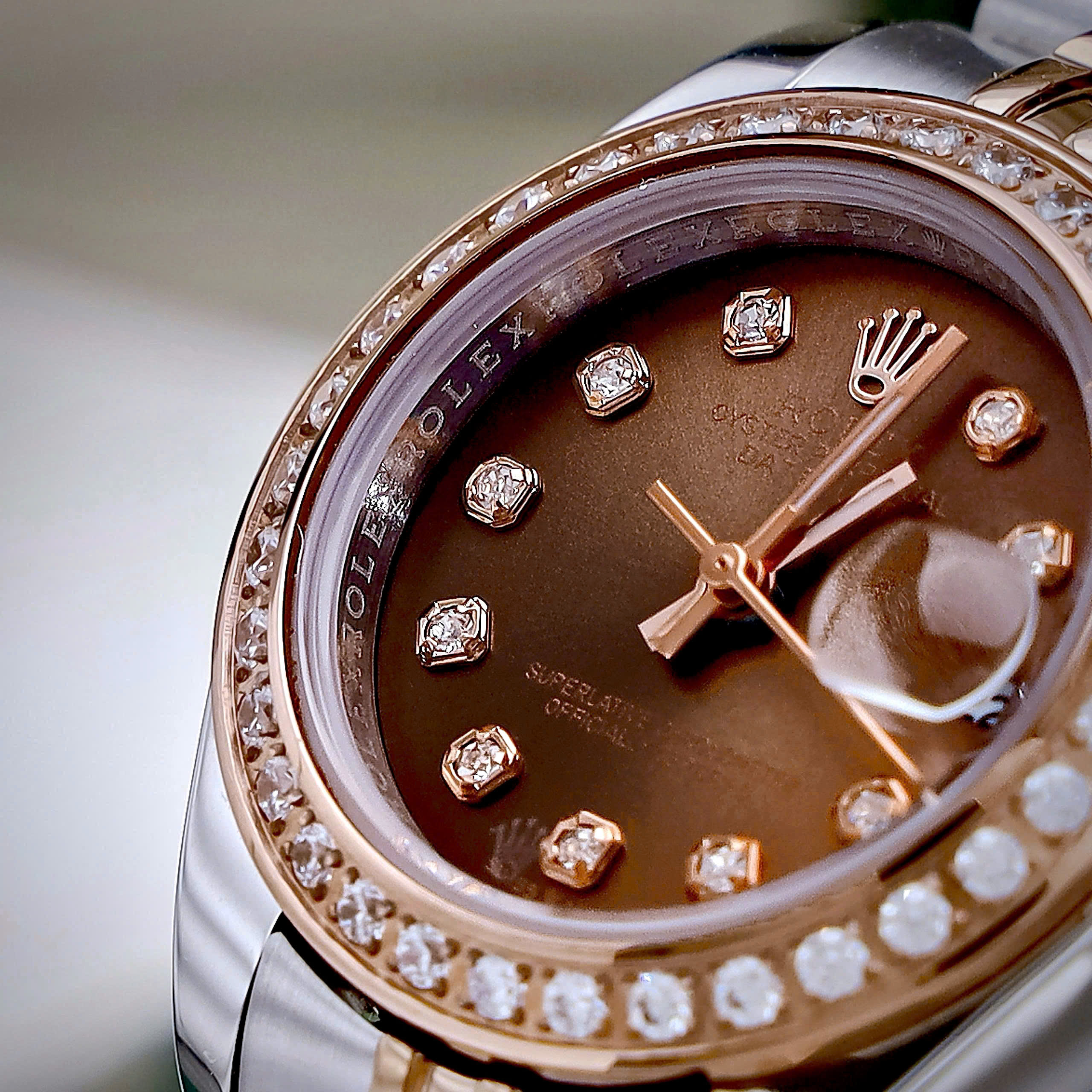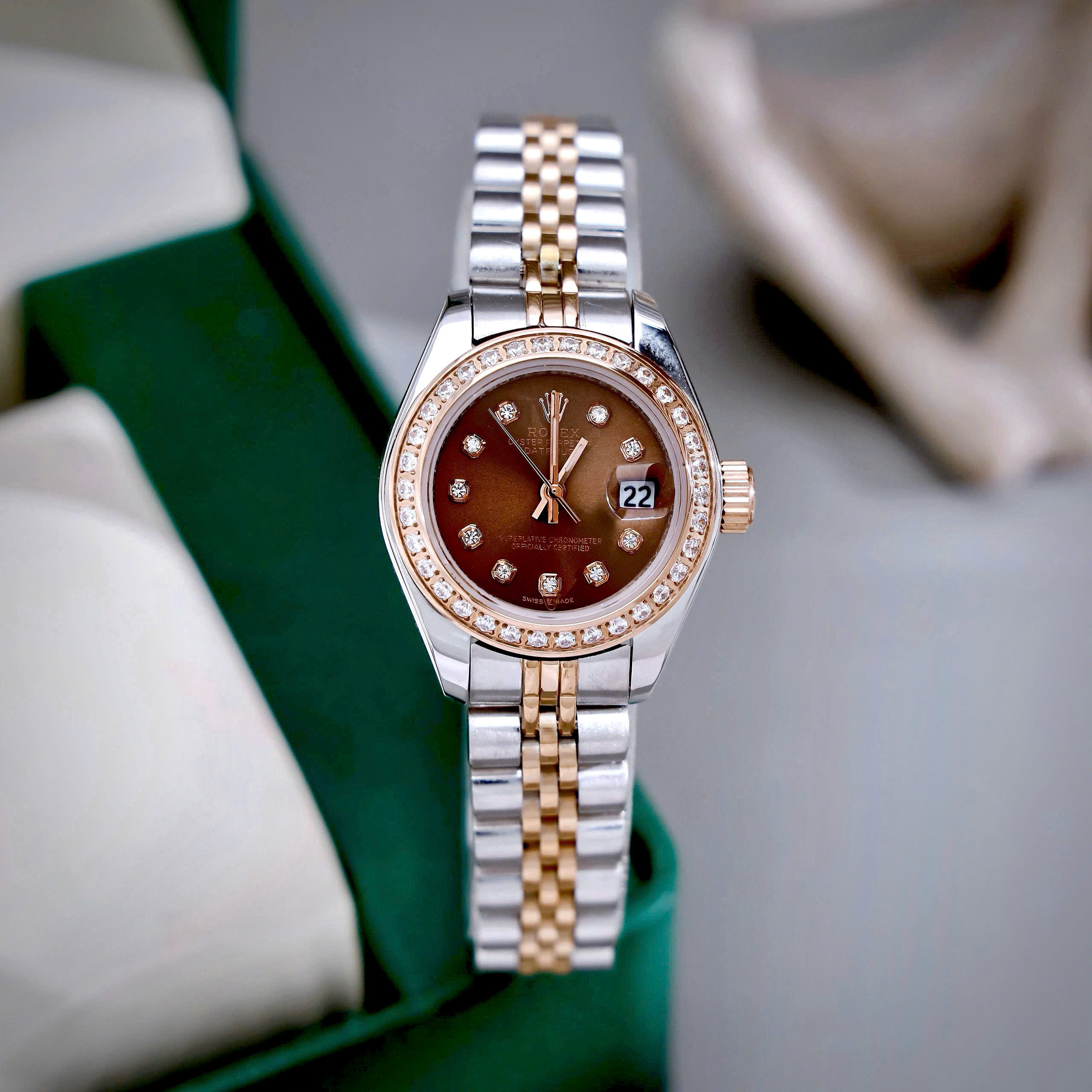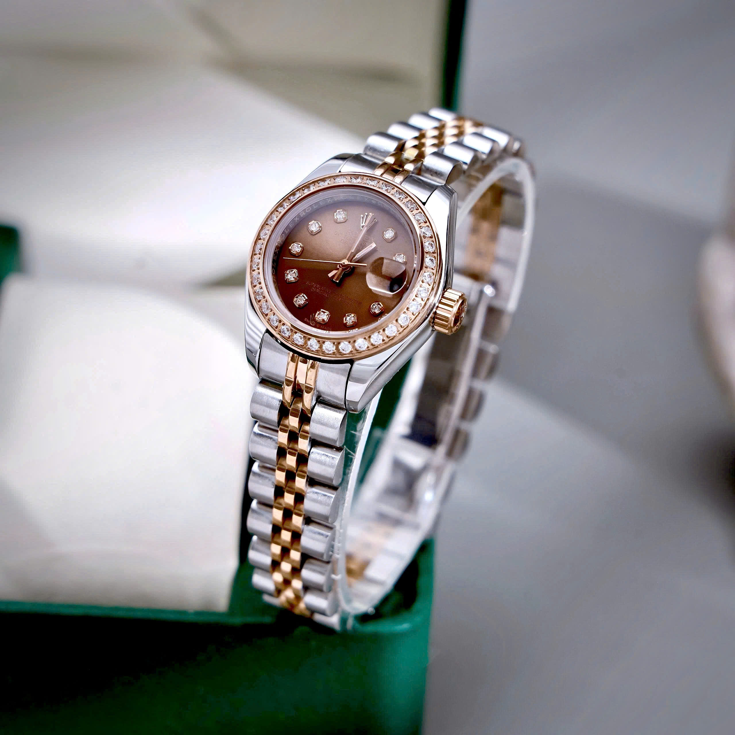 Đồng hồ Rolex Datejust nữ demi mặt chocolate đính đá fake cao cấp 28mm