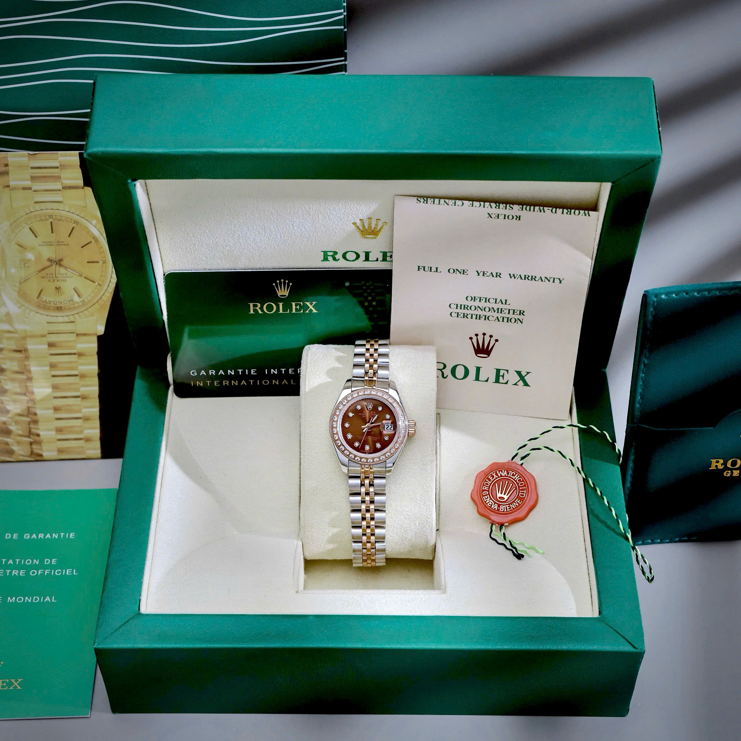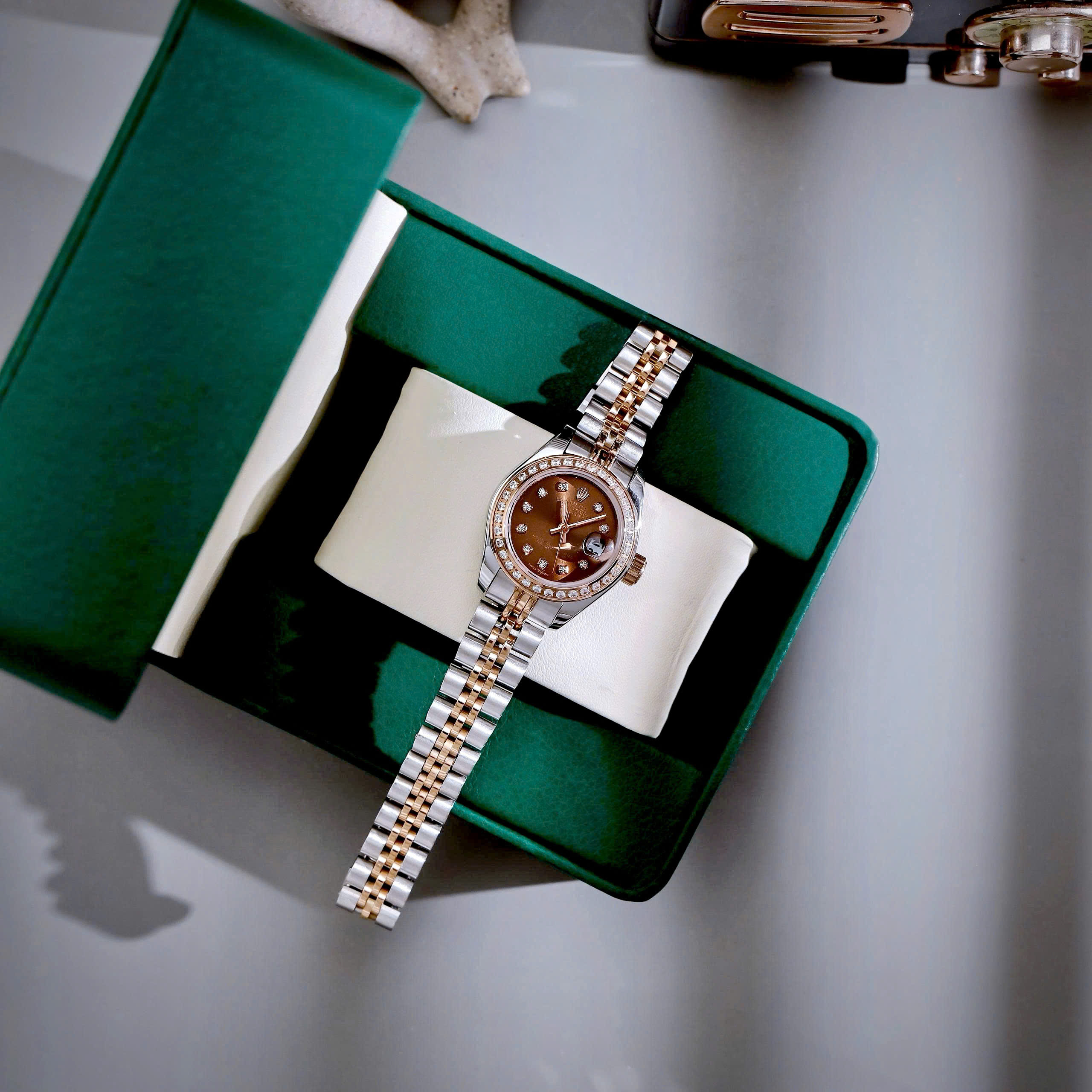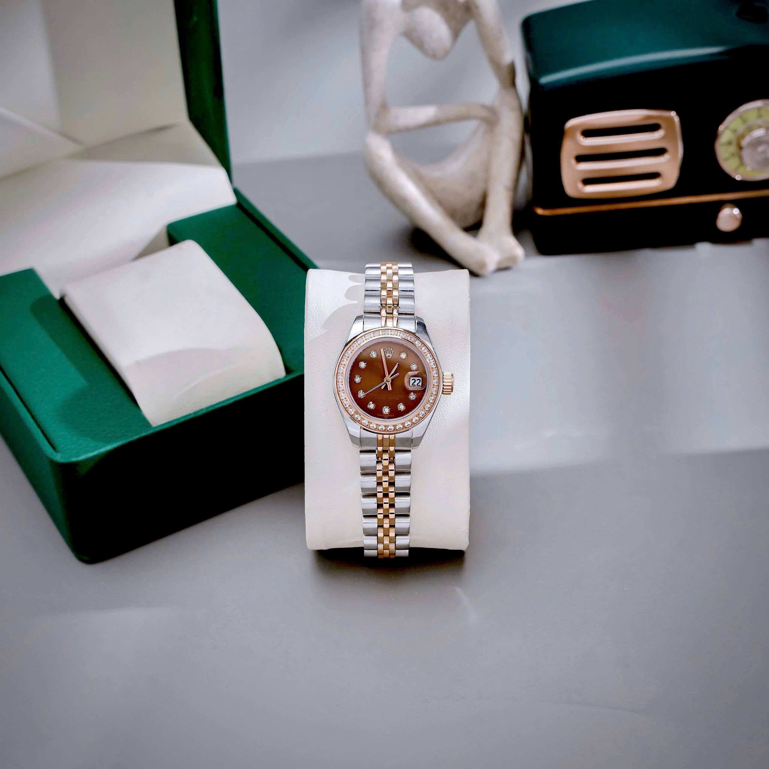 Đồng hồ Rolex Datejust nữ demi mặt chocolate đính đá fake cao cấp 28mm