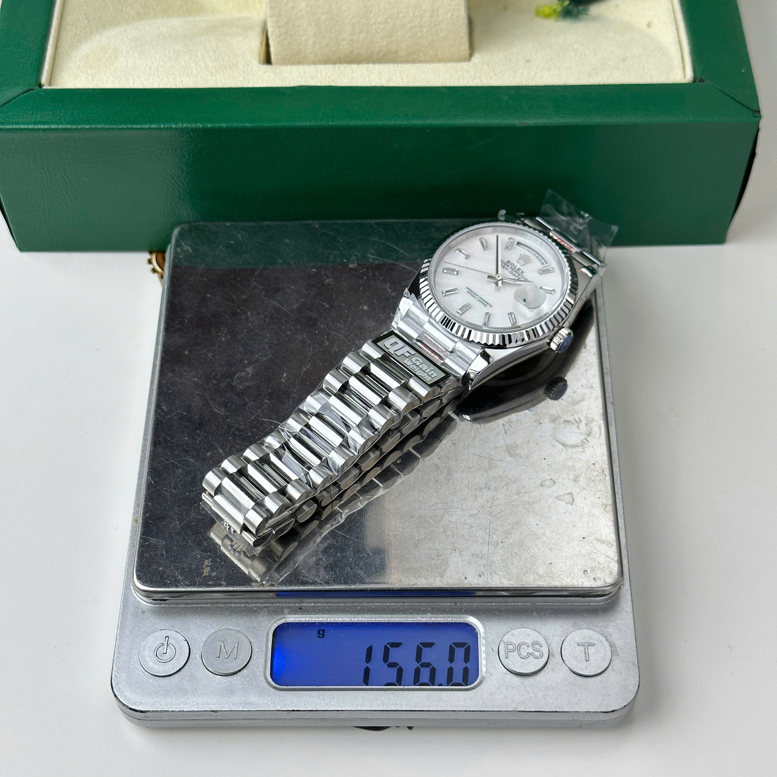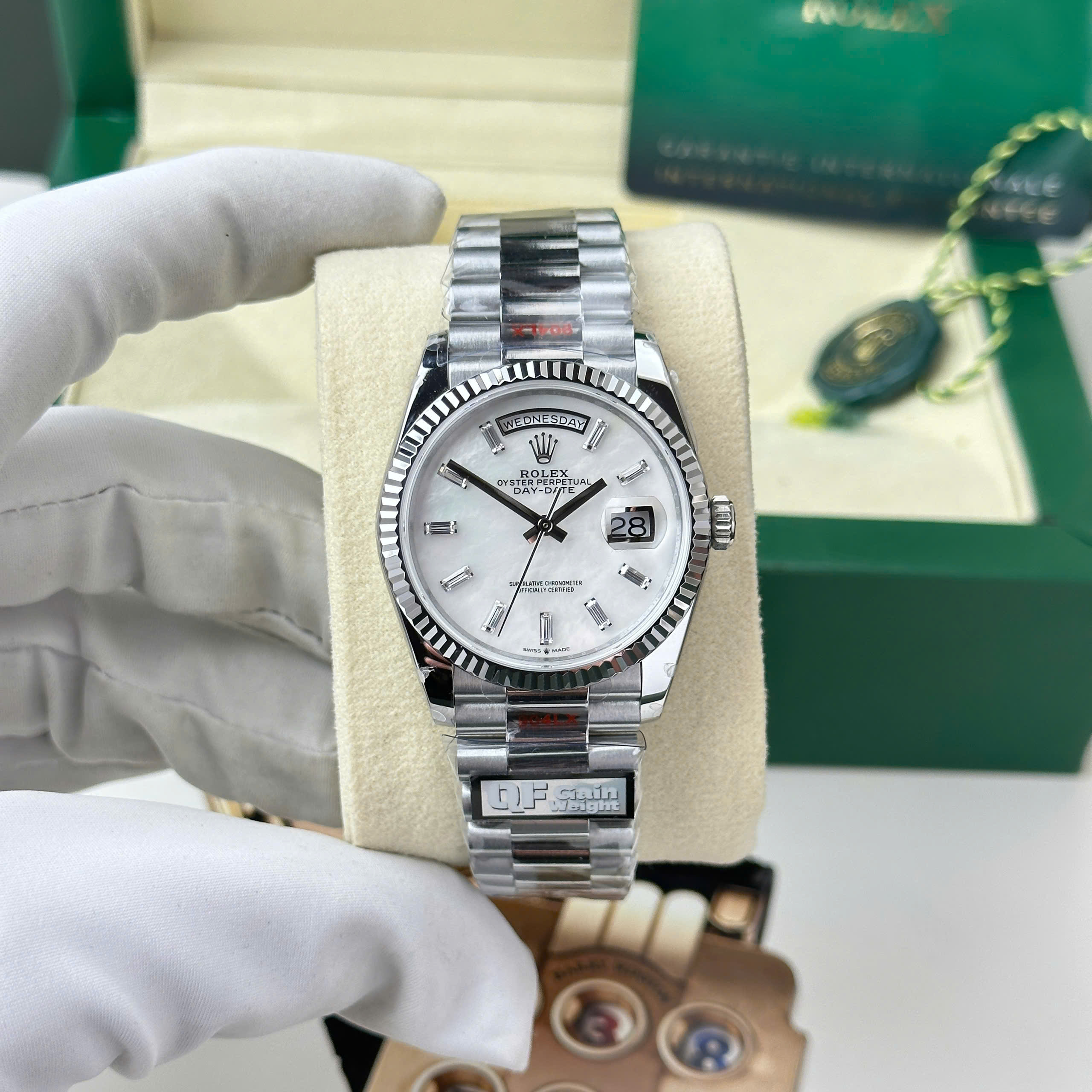 Đồng hồ Rolex Day-Date 128239 Replica 11 mặt khảm xà cừ trọng lượng 156 gram nhà máy QF 36mm