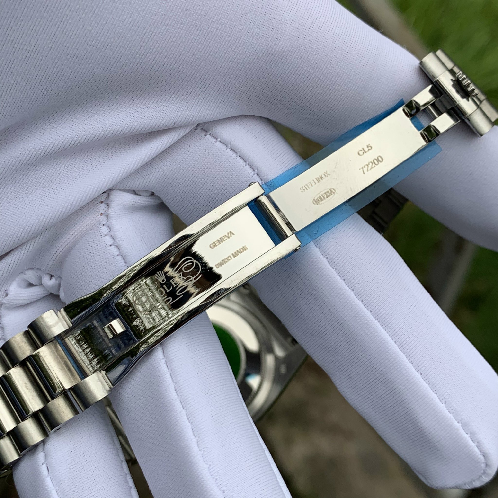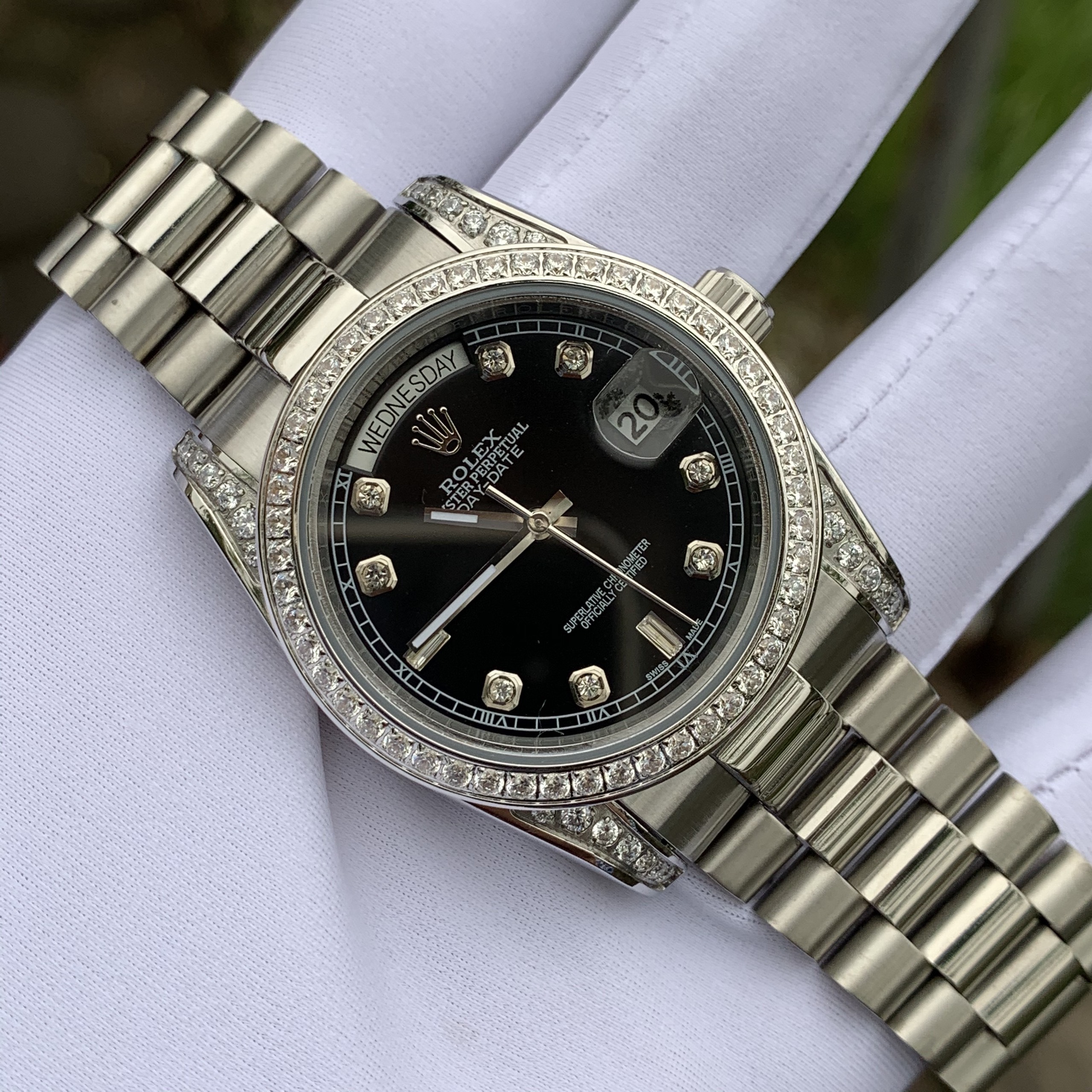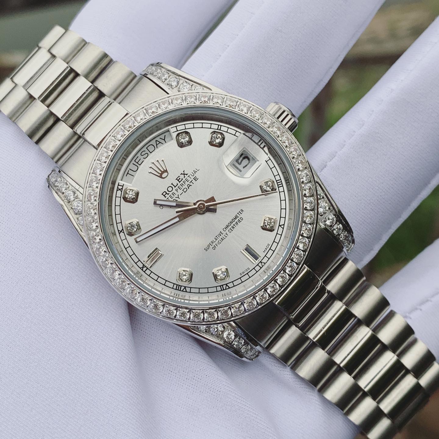- Đồng hồ Rolex nam máy cơ dòng Rolex Day-Date thiết kế các vạch số đính đá nổi bật chạy kèm lịch ngày