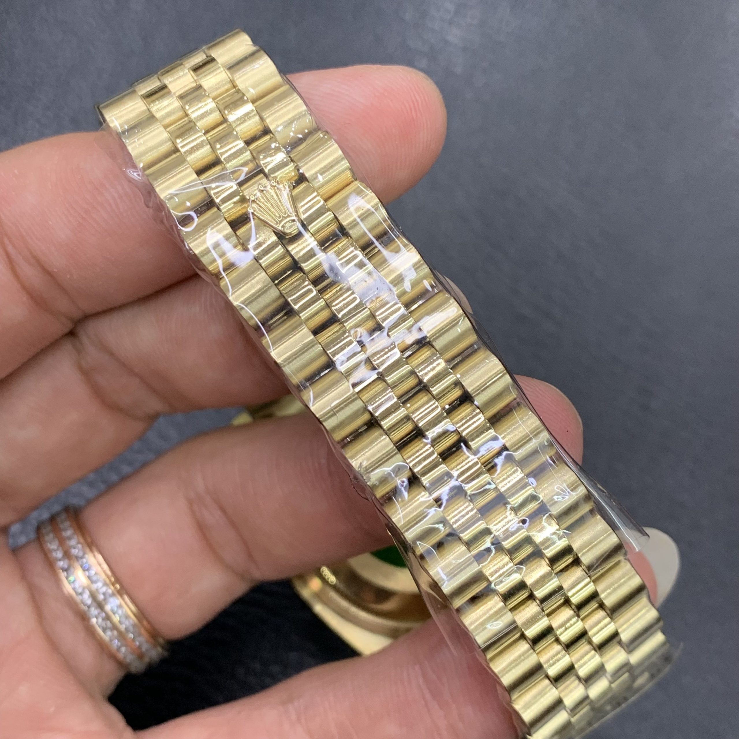 - Đồng hồ Rolex nam máy cơ dòng Rolex Day-Date thiết kế các vạch số đính đá nổi bật chạy kèm lịch ngày