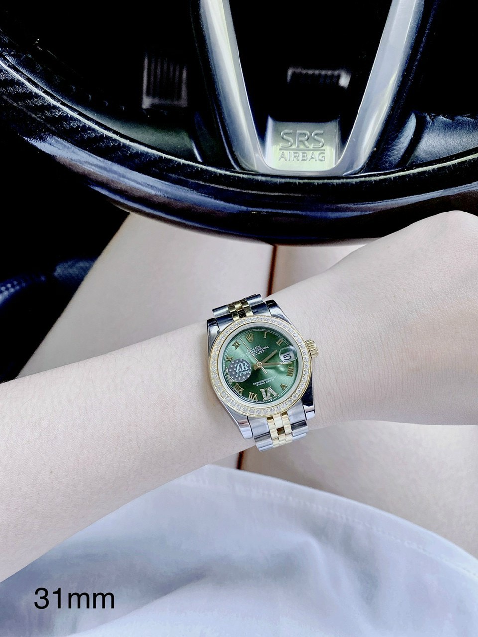 - Đồng hồ Rolex nữ mặt xanh siêu cấp sắc nét tinh tế từng chi tiết với logo vương miện