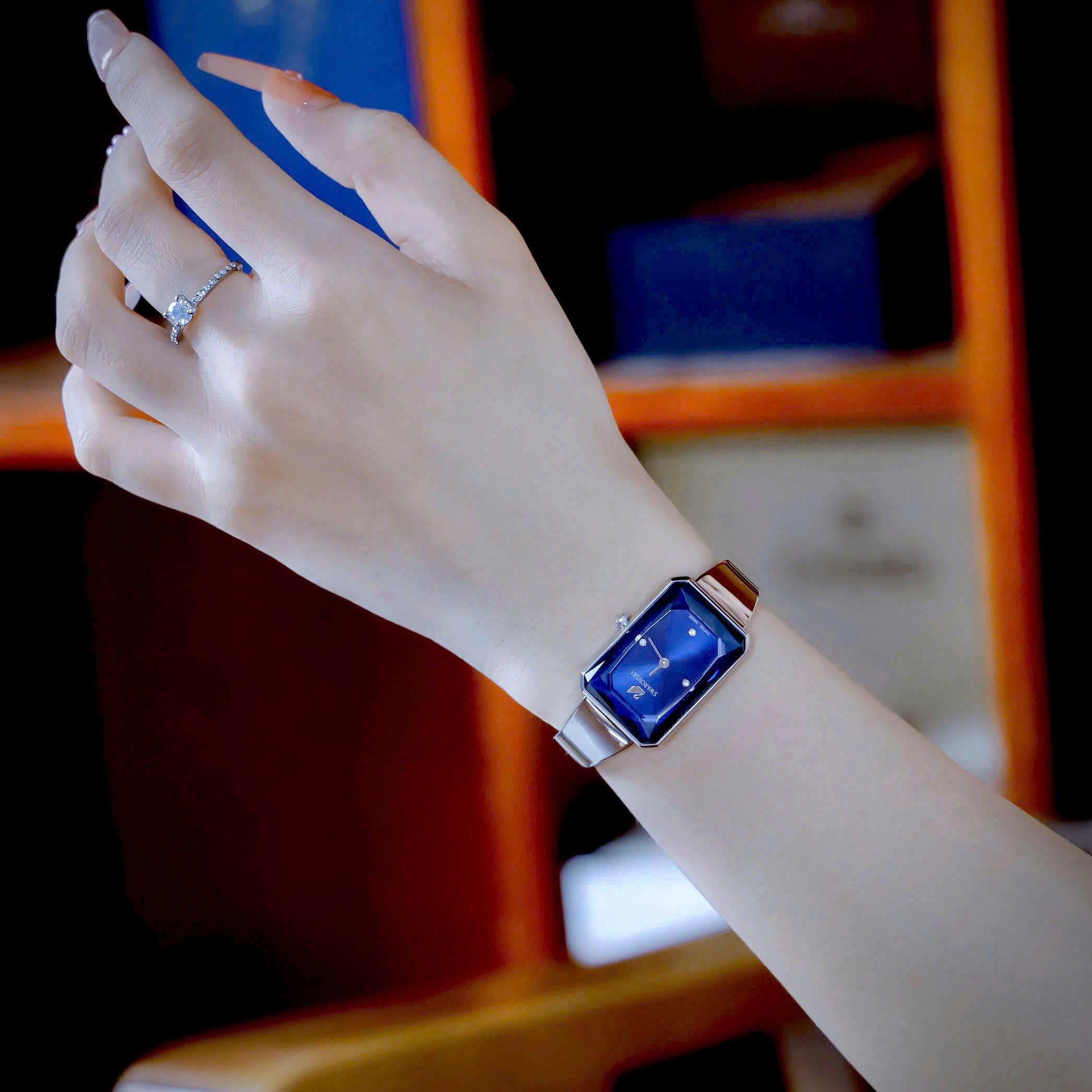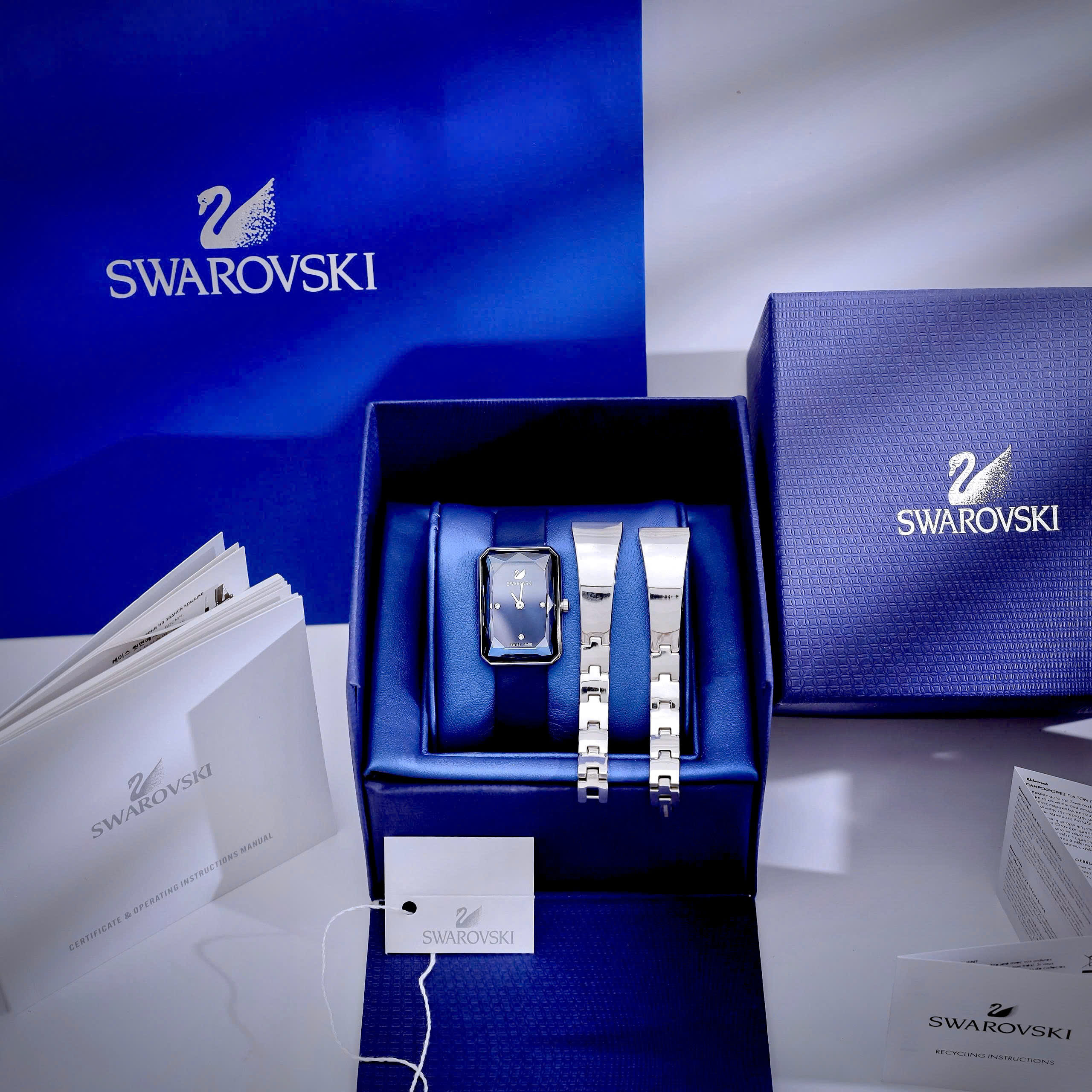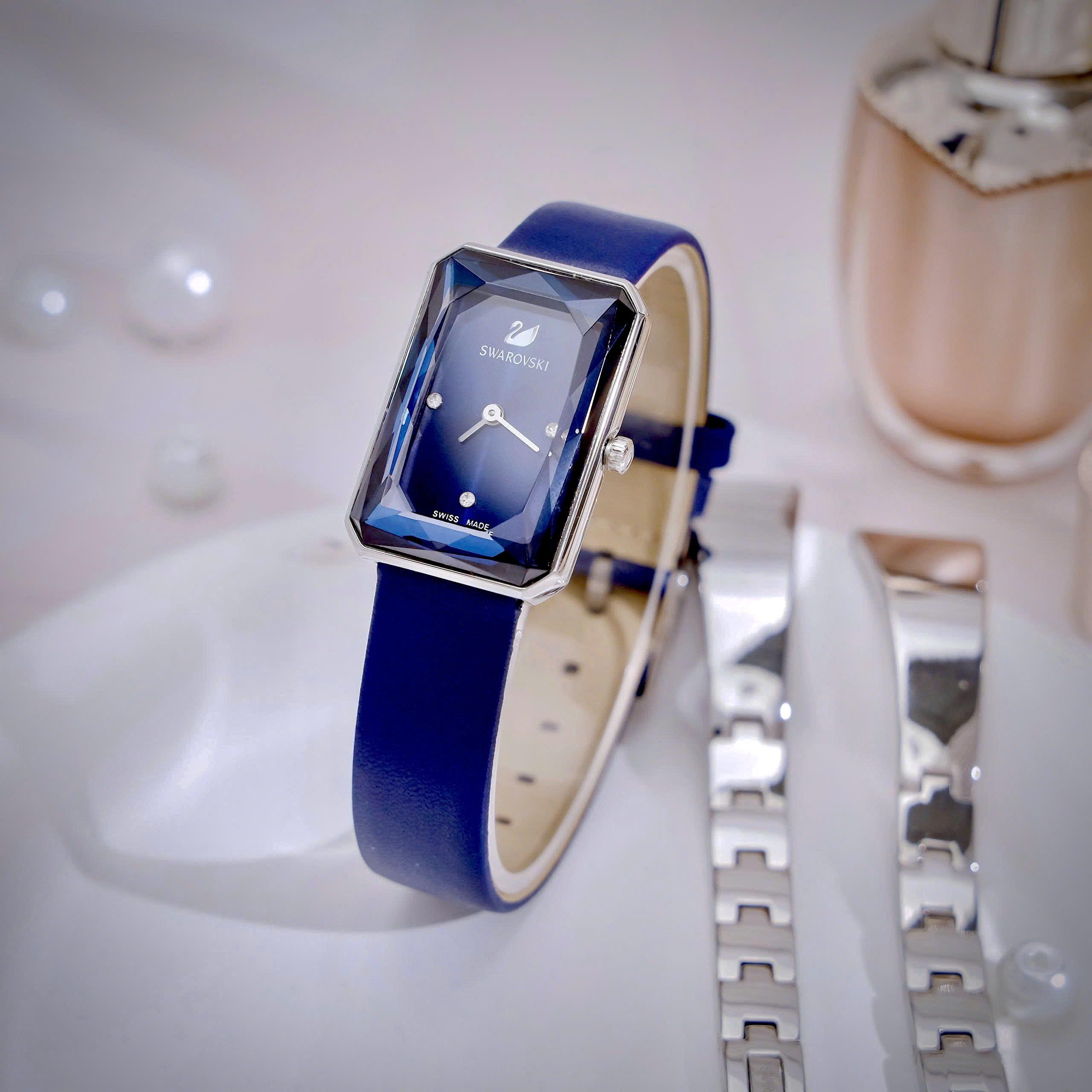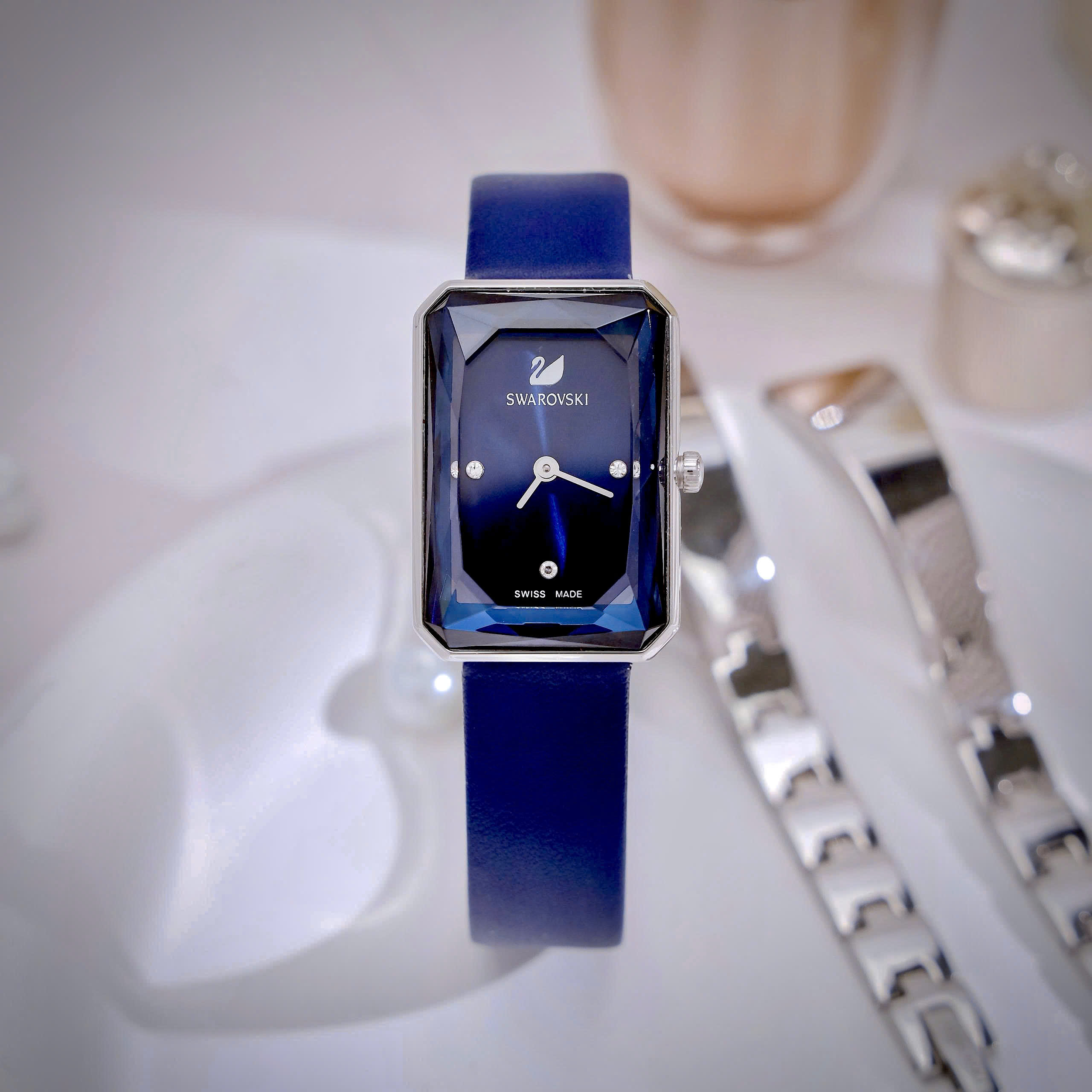 Đồng hồ Swarovski nữ mặt chữ nhật máy Pin Thuỵ Sỹ cao cấp nhất màu xanh 22x32mm