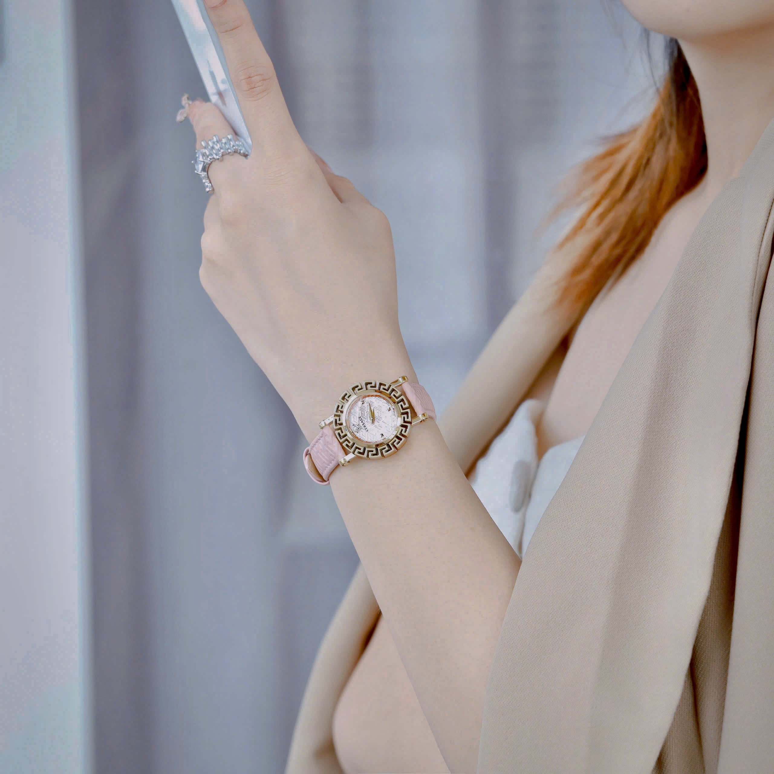 Đồng hồ Versace Glam Chic nữ dây da hồng niềng bông hoa Like Auth 30mm