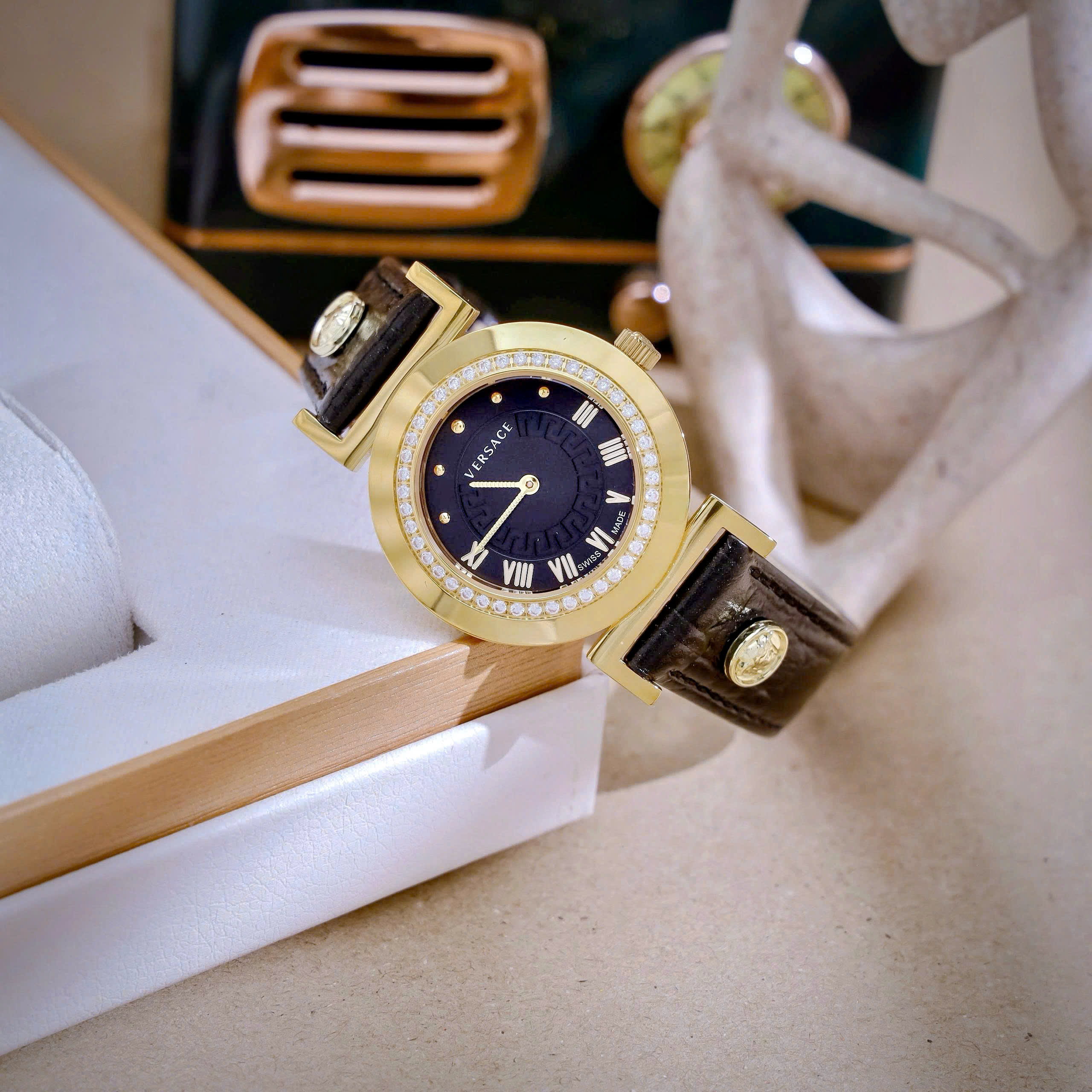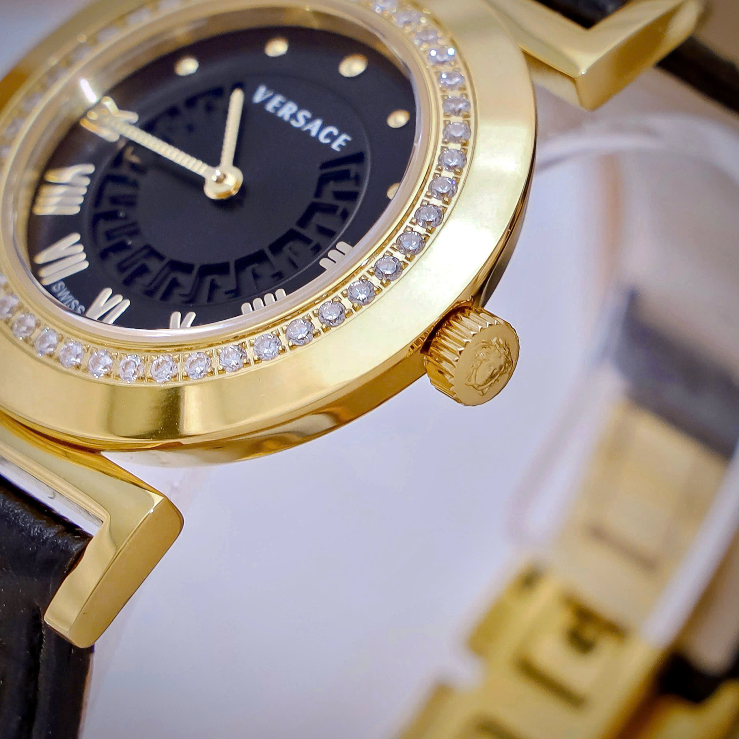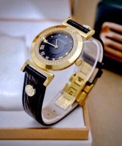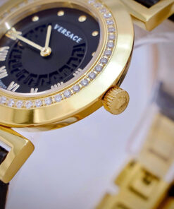 Đồng hồ Versace nữ siêu cấp Versace Vanity đính đá dây da màu đen 35mm